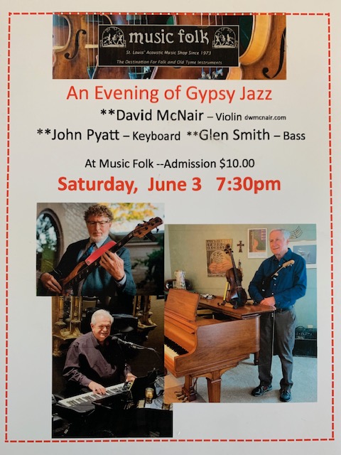 Join us for a fun evening of Gypsy Jazz music with violinist David McNair. David will be backed by John Pyatt on keyboards and Glenn Smith on Bass.