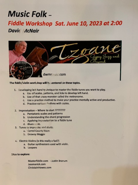 Come join us for an exciting fiddle workshop, taught by violinist David McNair. For just 10 dollars, work on the following topics: Developing left hand technique to master the fiddle tunes you want to play Use of scales, patterns and licks to develop the...
