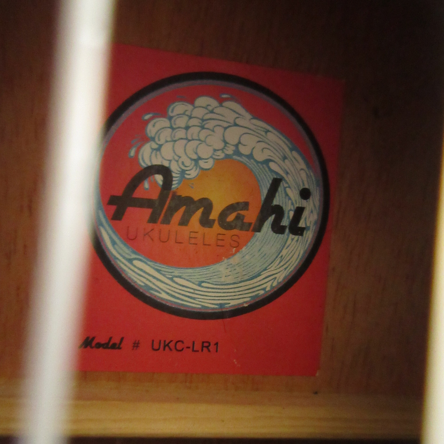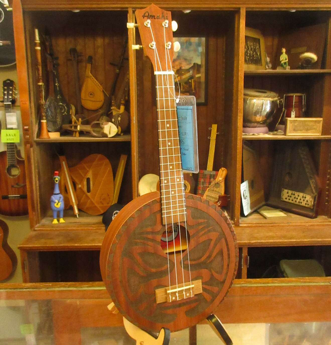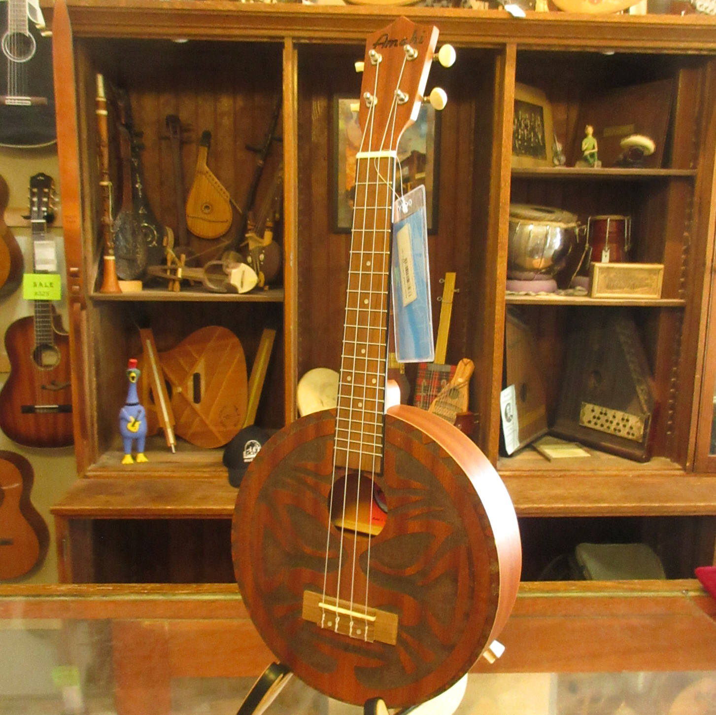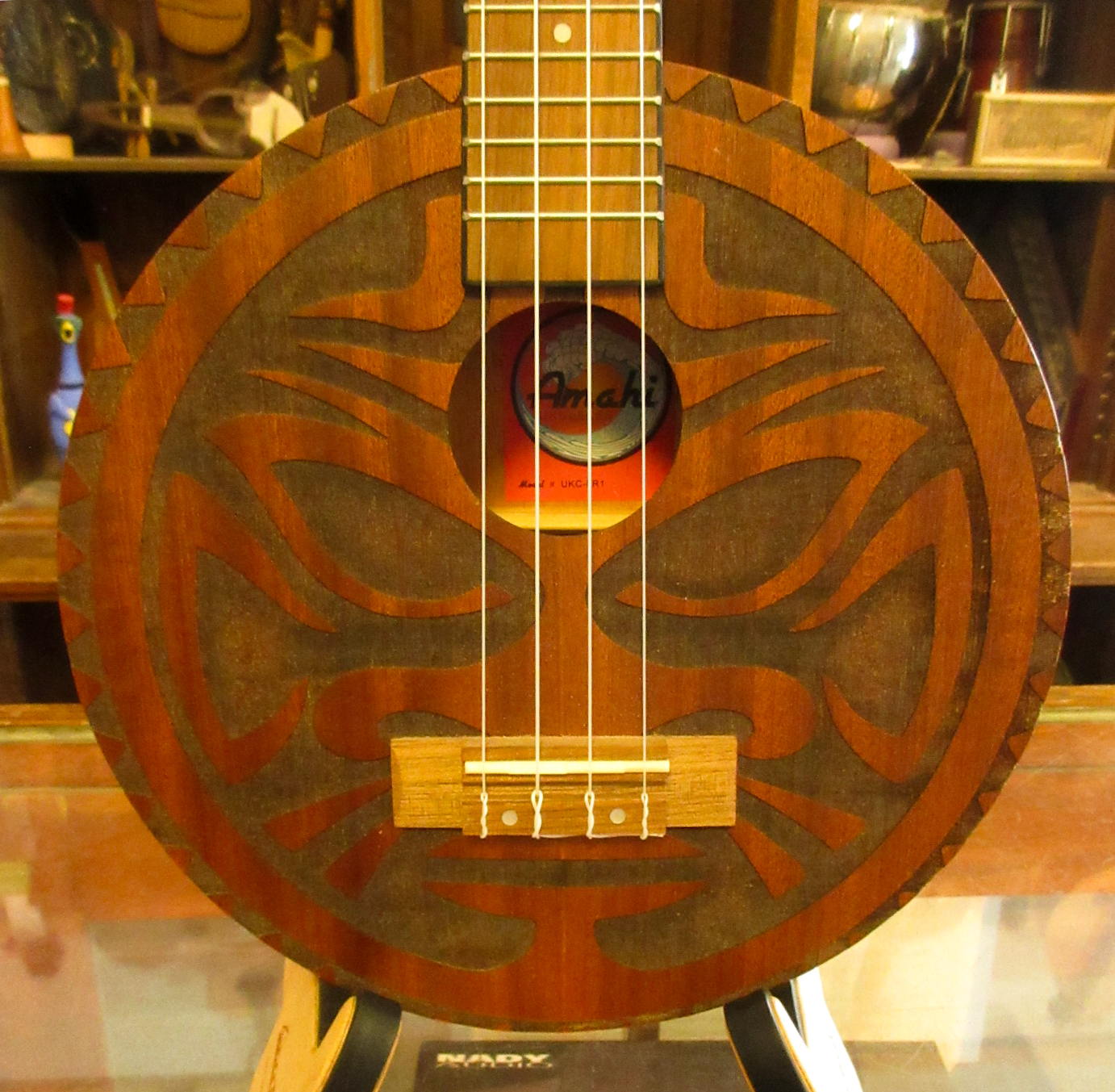 What fun! This concert sized uke from Amahi has a camp ukulele round shape (popular in the uke heyday of the 1920’s) and a cool, laser etched Tiki face graphic on it’s top. The uke itself plays easily and produces a nice, warm and friendly tone. There is a chip on the neck heel and other slight, and normal wear from play. This ukulele is in very good condition and comes with it’s original, shaped gig bag.