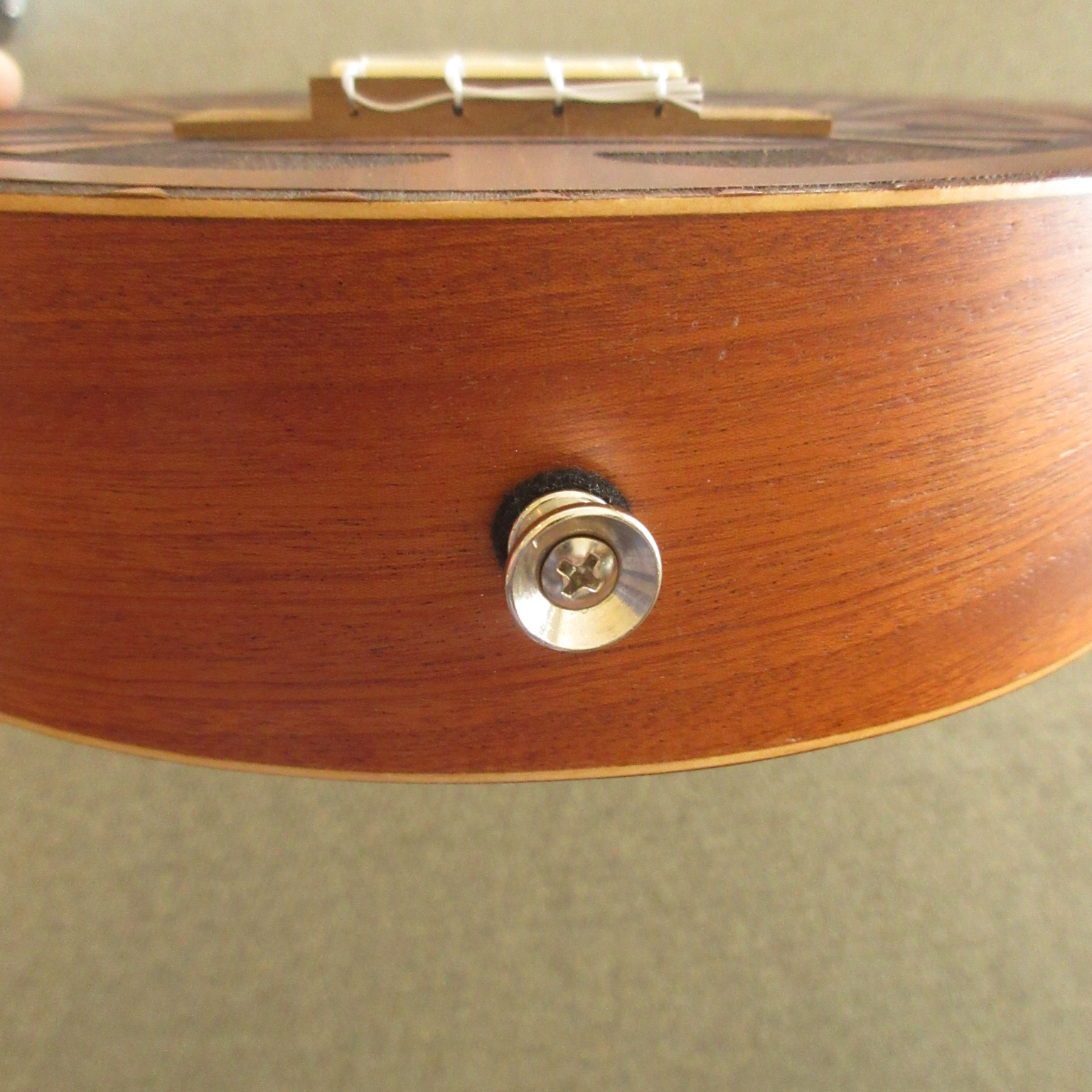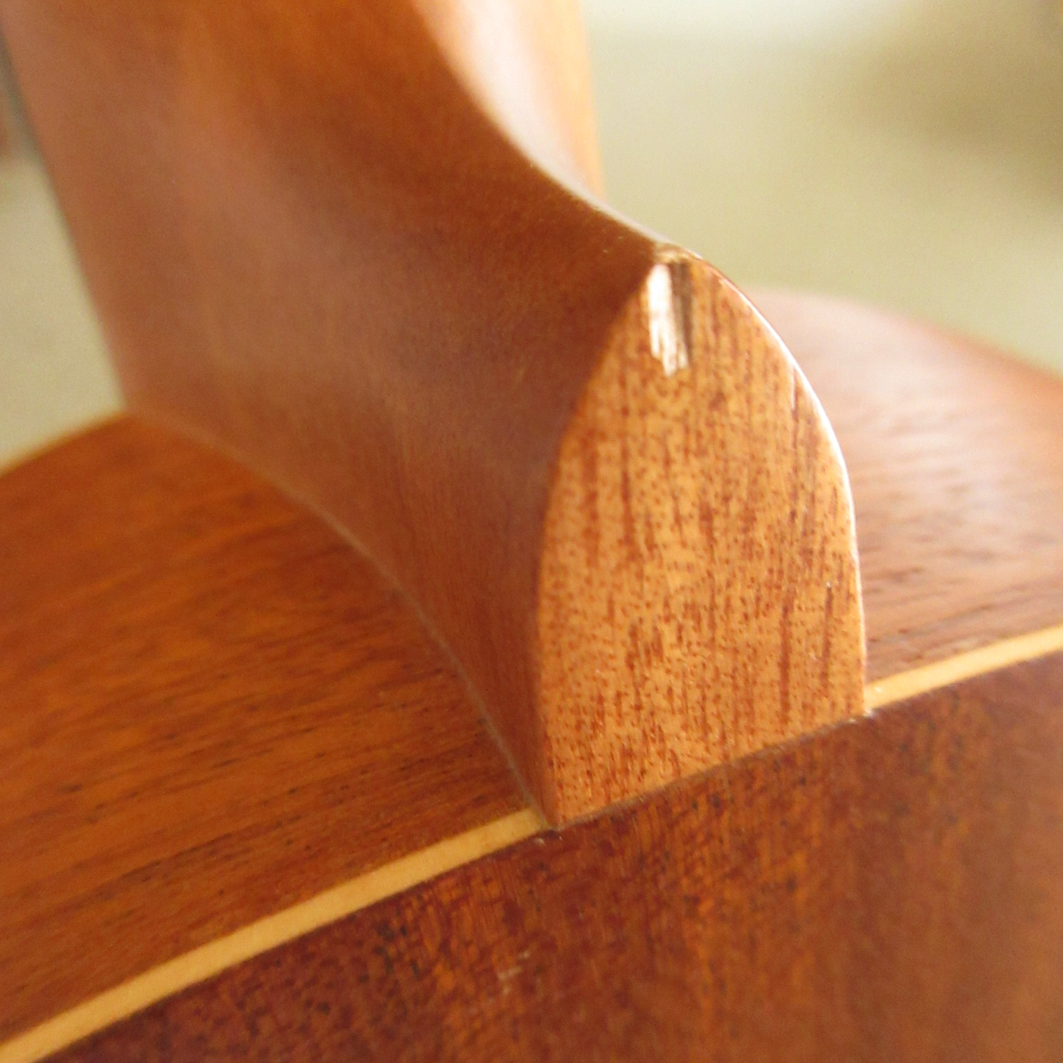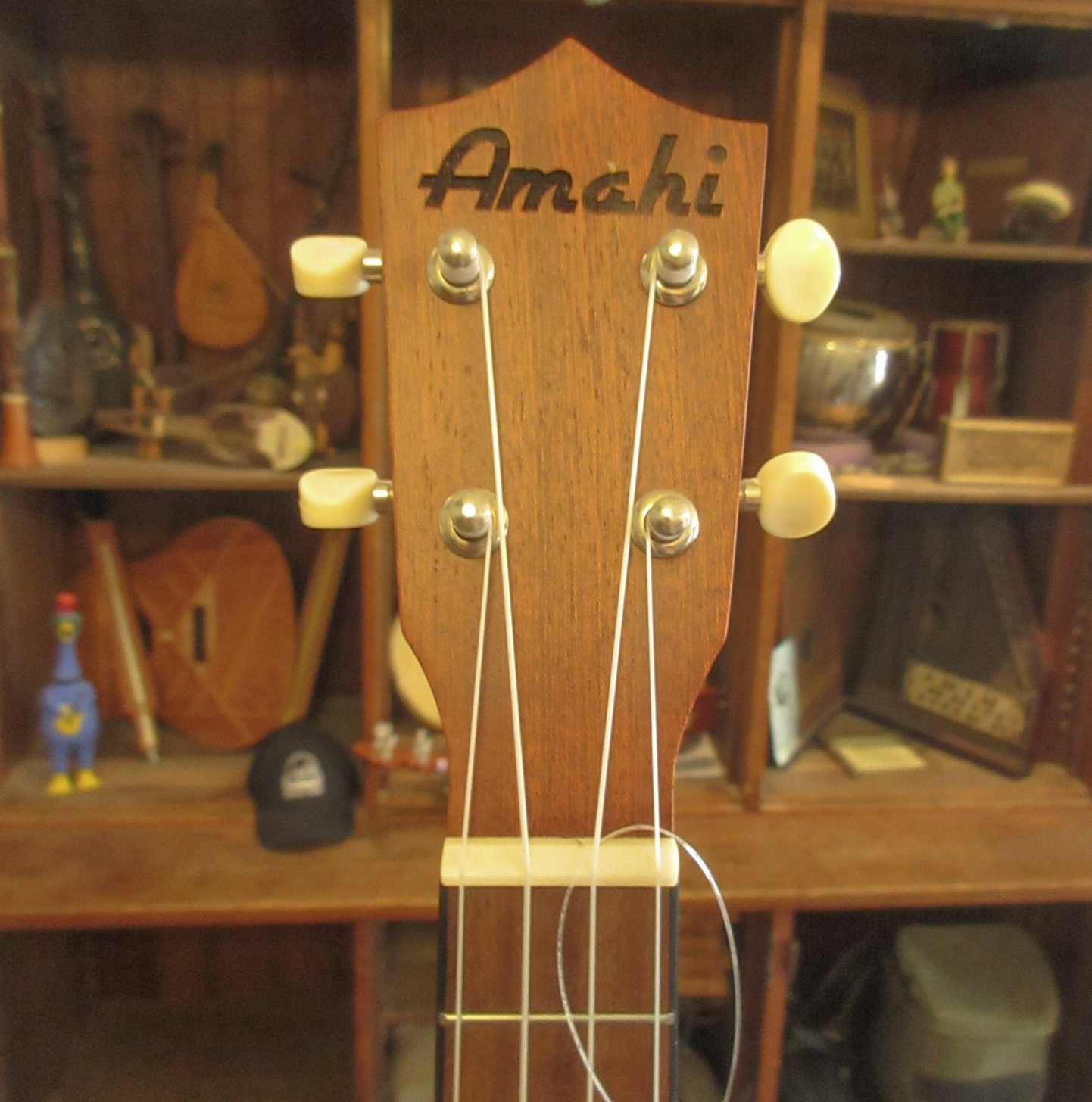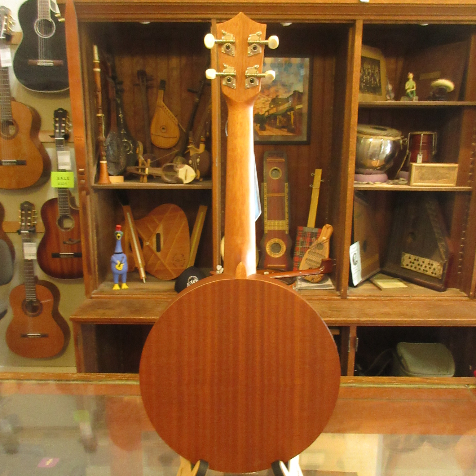 What fun! This concert sized uke from Amahi has a camp ukulele round shape (popular in the uke heyday of the 1920’s) and a cool, laser etched Tiki face graphic on it’s top. The uke itself plays easily and produces a nice, warm and friendly tone. There is a chip on the neck heel and other slight, and normal wear from play. This ukulele is in very good condition and comes with it’s original, shaped gig bag.