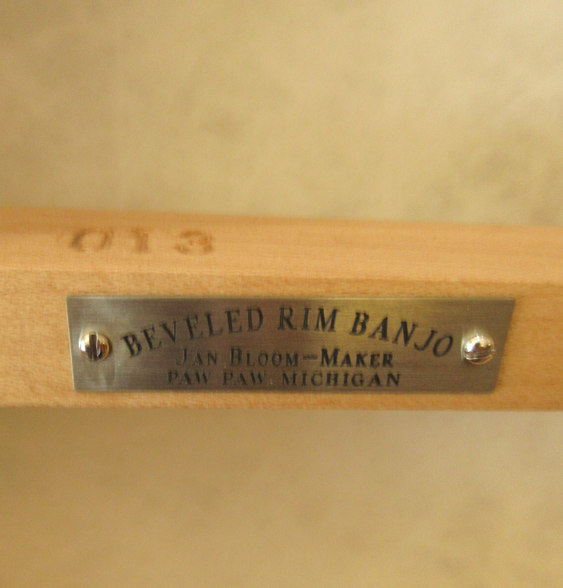 The basic Bloom Beveled Rim banjo features a neck shaped very similar to the Fairbanks Whyte Laydie and Regent banjos of the early 1900’s.The book matched Maple with the black center stripe neck is hand fit to the 11.5 inch top beveled rim. The neck features an Ebony finger board and a Galax scoop. An Ebony heel cap is used. The Ebony peghead overlay features an engraved Mythical Beast head. The beast is an interpretation of one found on a carved panel from a building in Venice. Planetary tuning gears in the peg head and a right angle 5th string gear with Ivoroid buttons are used in conjunction with a replica No Knot Tailpiece. A bone nut and bone 5th string pip are fit and a Fibreskin head is installed. The instrument is lightly colored to “Fairbanks Amber” finished in gloss lacquer. This banjo is in very good used condition. A tuner’s foot “melted’ into the headstocks finish. Other than that, it’s just light wear. This also comes with a hard case.