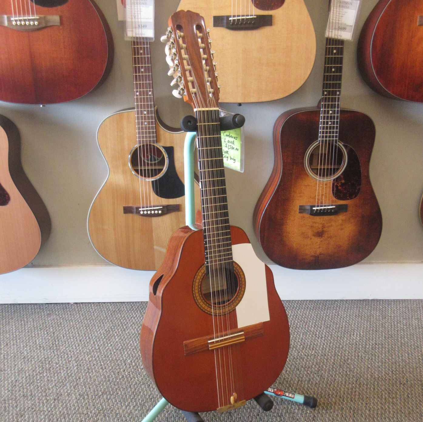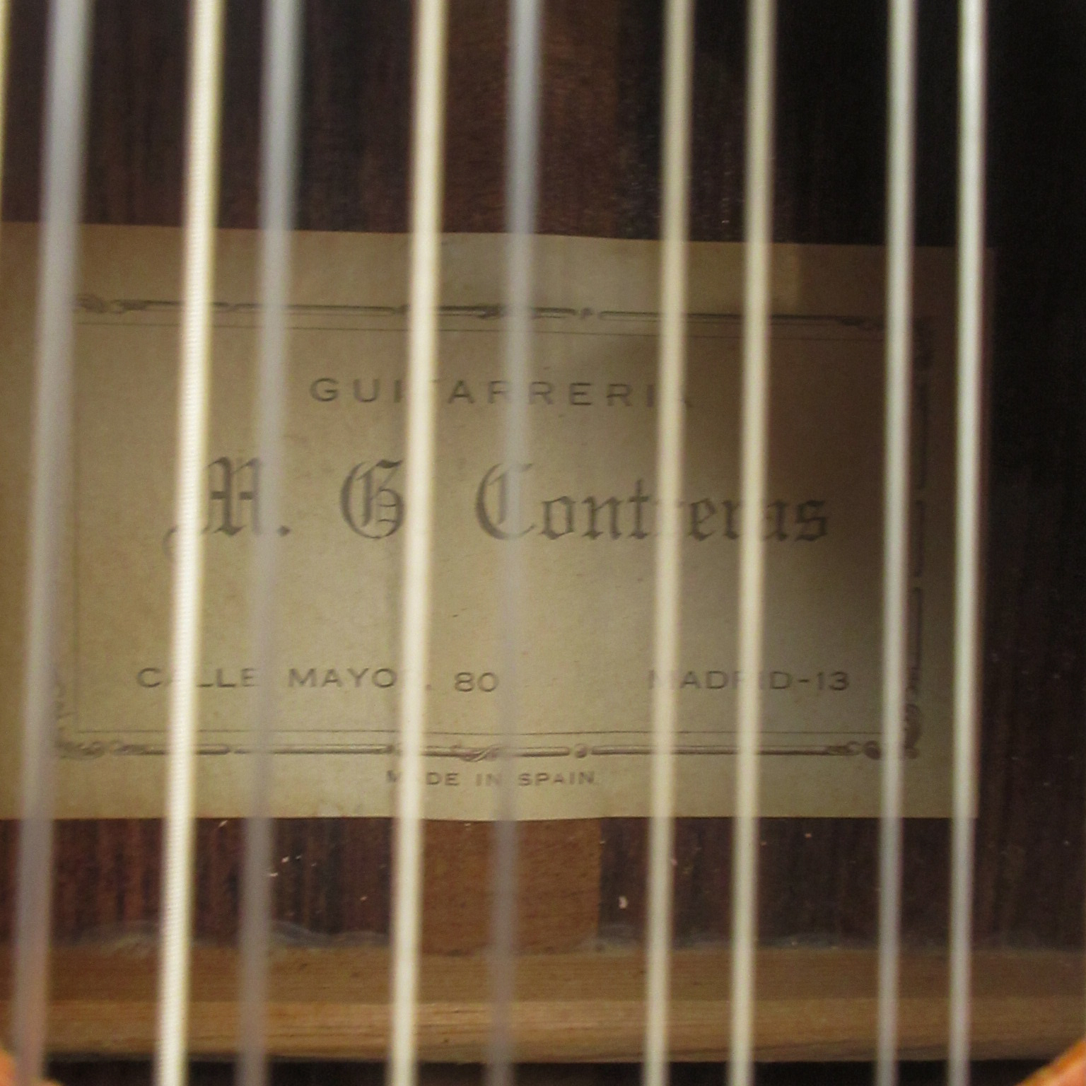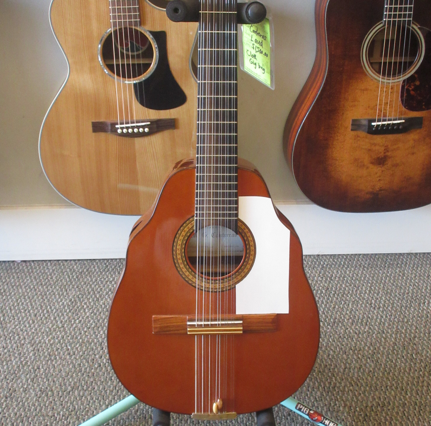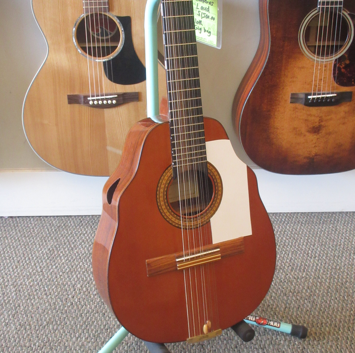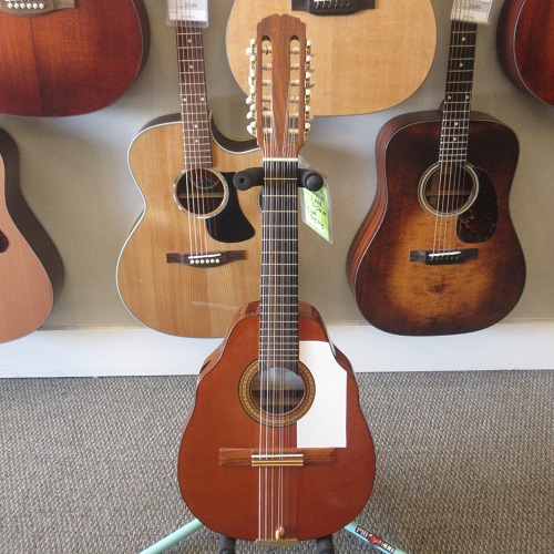 This Conteras Laud is a great sounding and super fun instrument to play. Manuel Contreras (I and II) were renowned Madrid-based luthiers, primarily famous for high-end classical guitars. While specializing in guitars, the Contreras workshop produced exceptional Spanish folk instruments, including the laud, adhering to a “Madrid school” style characterized by rich sound and premium materials. A Spanish folk instrument (cittern family), the laud is a flat-backed, pear-shaped instrument, larger than a bandurria. Features 12 strings in 6 pairs. Tuned one octave lower than the bandurria, G# G#, C#C#, F#F#, bb, ee, aa. Instruments from the Manuel Contreras workshop are characterized by high-quality tonewoods (spruce/cedar tops, rosewood/cypress bodies) and meticulous craftsmanship. The workshop legacy continues through Victoria Velasco and José Antonio Lagunar. We aren’t sure as to when it was made in their shop in Madrid, Spain. It’s tuners look to have been changed. There is some finish wear wear the headstock meets the neck and some on the sides, in the area where your arm goes over the guitar. It’s owner cut a sound port on it’s side and added a pickguard to it. The fret ends could use some filing, as there is some sharpness. The laud came with 3 inlaid pear side position markers. 3 white dots, in White Out, have been added farther up the neck. There are some tiny chips around the edges, light scratching and other light wear. The tailpieces string tangs are all bent slightly. One is missing and was replaced with a nail. The bridge has a dark strip of wood in front of where the bridge saddle sits. It is either purely ornamental, possibly a repurposed classical bridge (since they mostly made those, or was a result of moving the bridge saddle back, to improve intonation. Overall, this laud is in good condition and comes with a cloth gig bag.