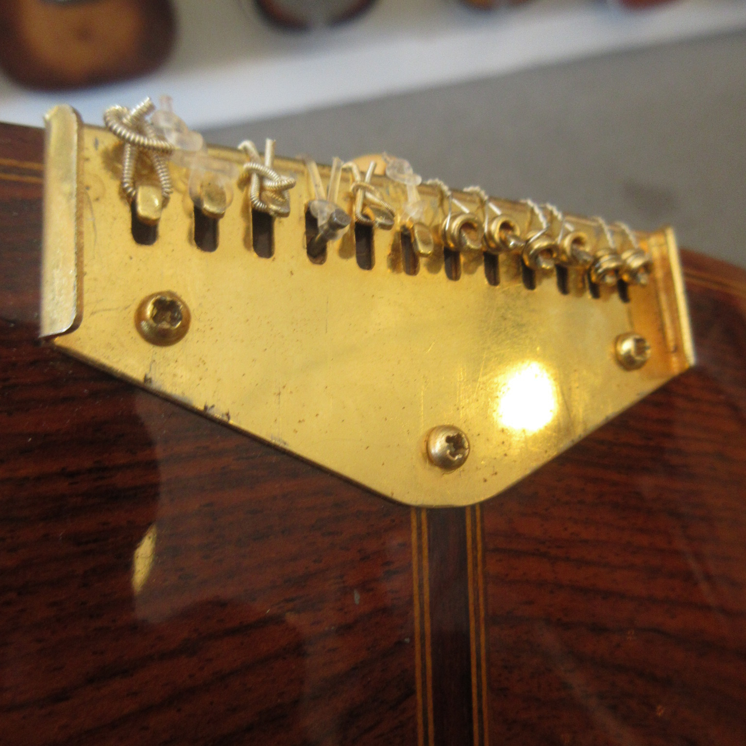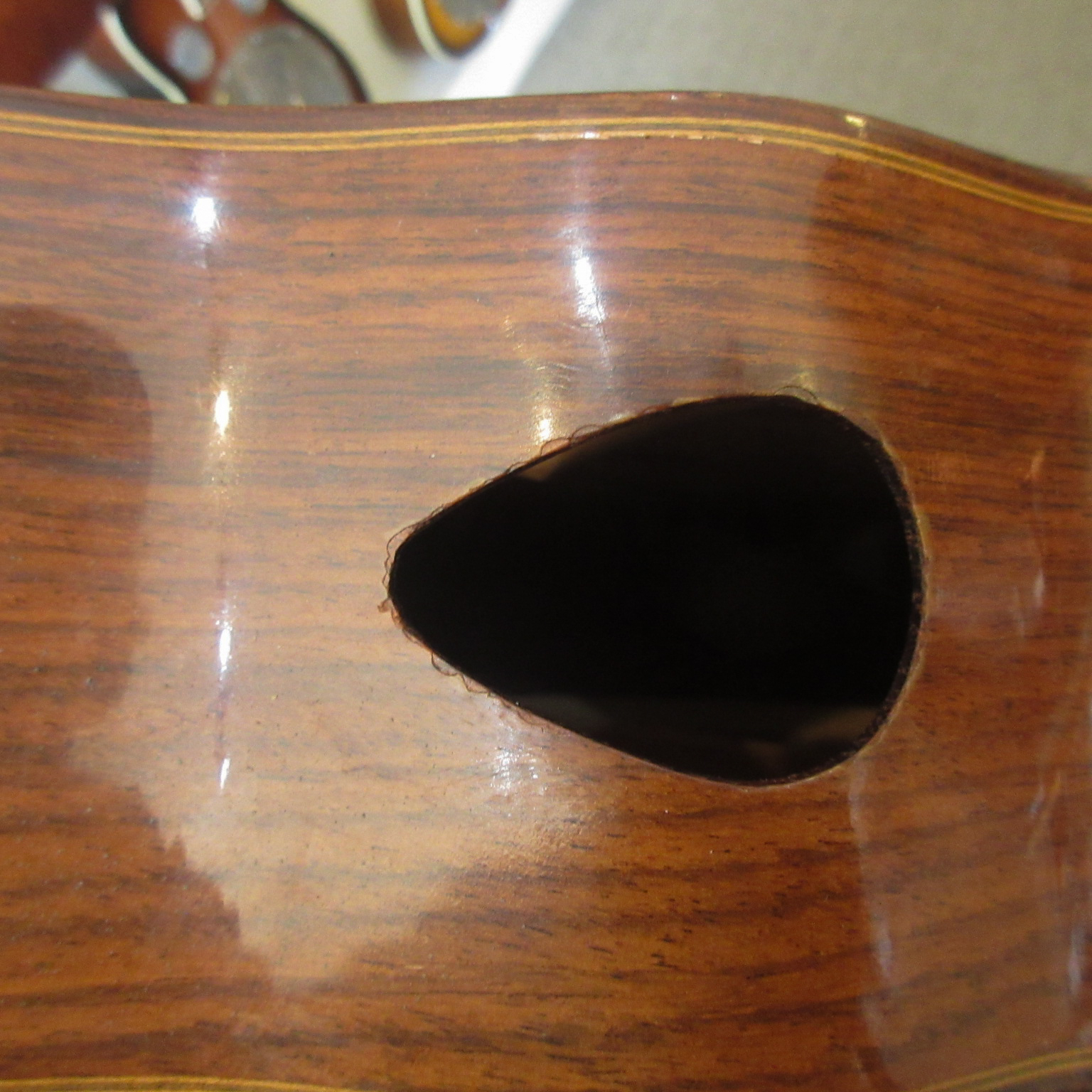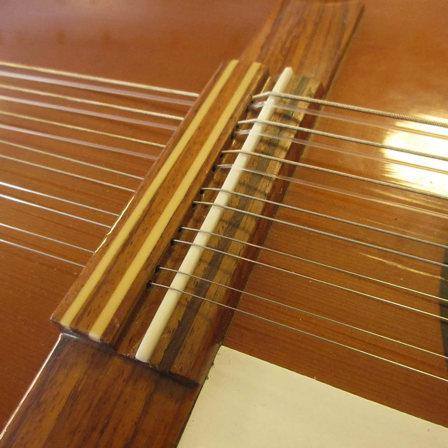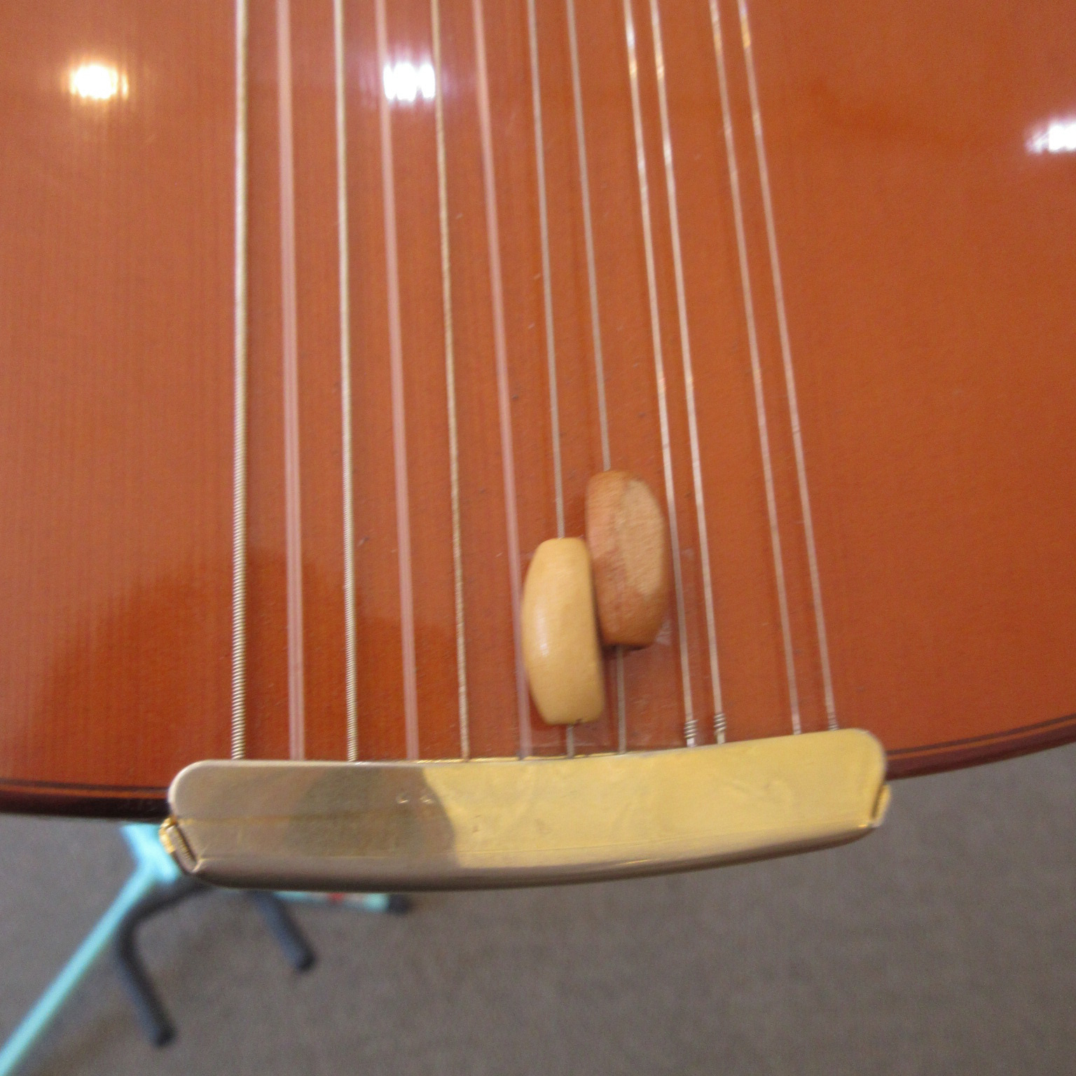 This Conteras Laud is a great sounding and super fun instrument to play. Manuel Contreras (I and II) were renowned Madrid-based luthiers, primarily famous for high-end classical guitars. While specializing in guitars, the Contreras workshop produced exceptional Spanish folk instruments, including the laud, adhering to a “Madrid school” style characterized by rich sound and premium materials. A Spanish folk instrument (cittern family), the laud is a flat-backed, pear-shaped instrument, larger than a bandurria. Features 12 strings in 6 pairs. Tuned one octave lower than the bandurria, G# G#, C#C#, F#F#, bb, ee, aa. Instruments from the Manuel Contreras workshop are characterized by high-quality tonewoods (spruce/cedar tops, rosewood/cypress bodies) and meticulous craftsmanship. The workshop legacy continues through Victoria Velasco and José Antonio Lagunar. We aren’t sure as to when it was made in their shop in Madrid, Spain. It’s tuners look to have been changed. There is some finish wear wear the headstock meets the neck and some on the sides, in the area where your arm goes over the guitar. It’s owner cut a sound port on it’s side and added a pickguard to it. The fret ends could use some filing, as there is some sharpness. The laud came with 3 inlaid pear side position markers. 3 white dots, in White Out, have been added farther up the neck. There are some tiny chips around the edges, light scratching and other light wear. The tailpieces string tangs are all bent slightly. One is missing and was replaced with a nail. The bridge has a dark strip of wood in front of where the bridge saddle sits. It is either purely ornamental, possibly a repurposed classical bridge (since they mostly made those, or was a result of moving the bridge saddle back, to improve intonation. Overall, this laud is in good condition and comes with a cloth gig bag.