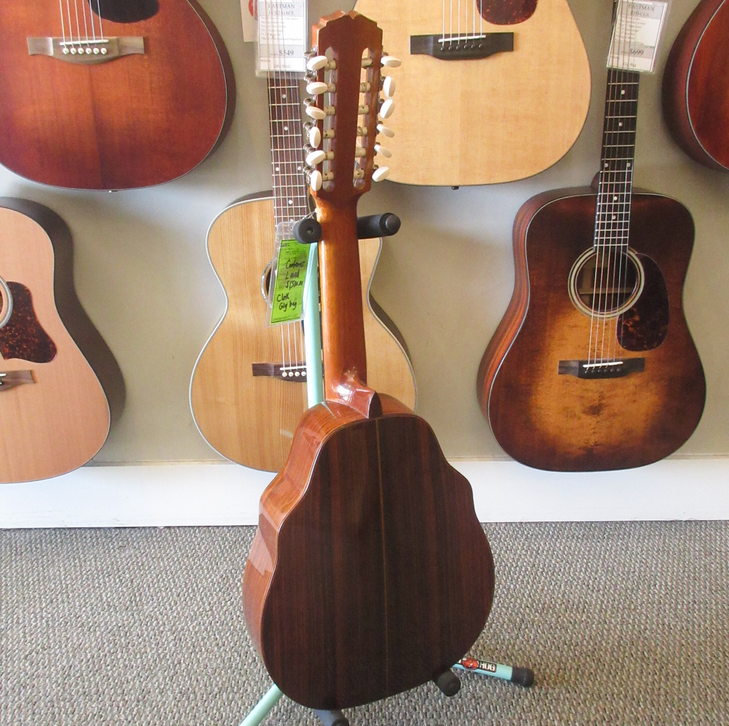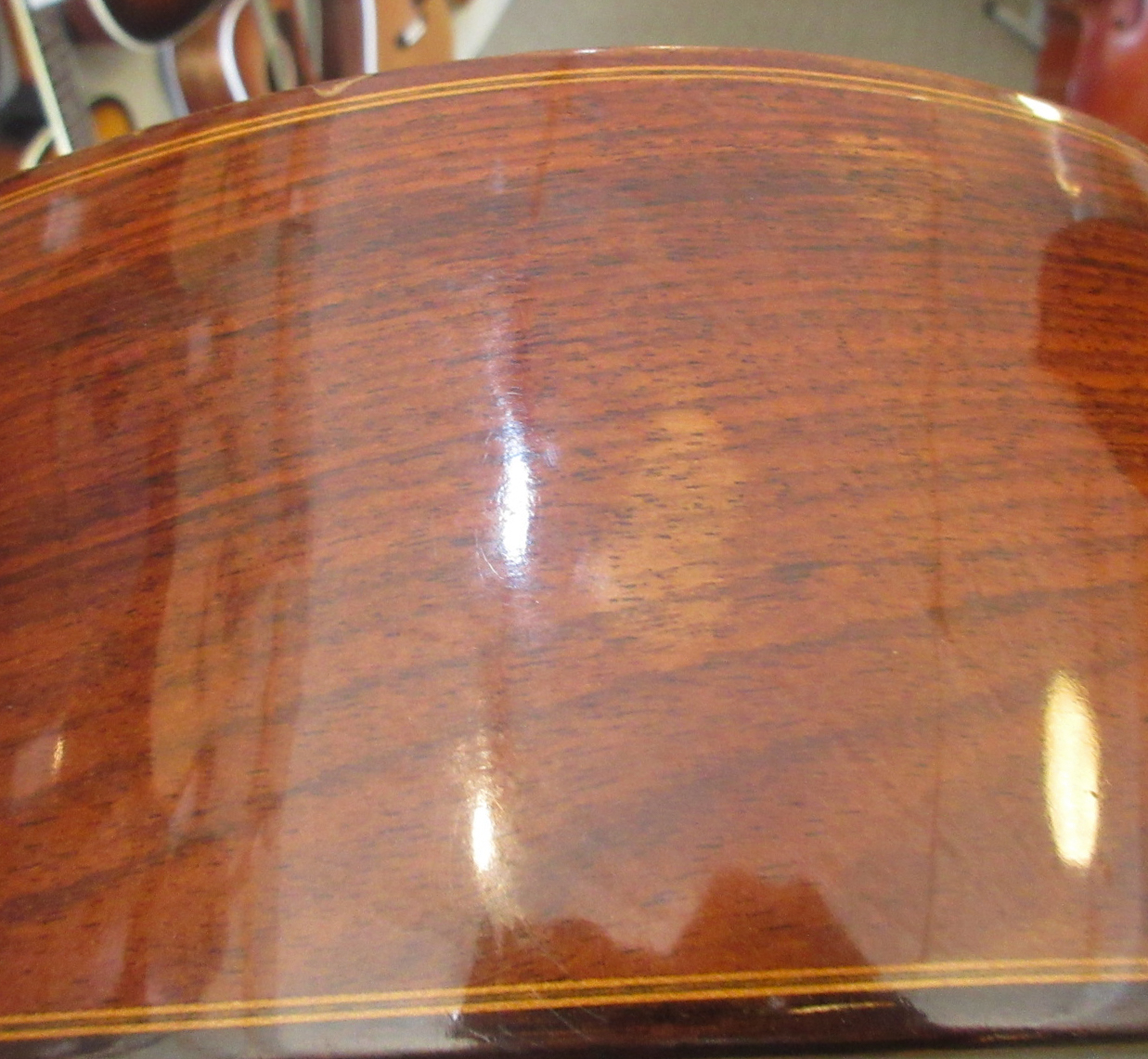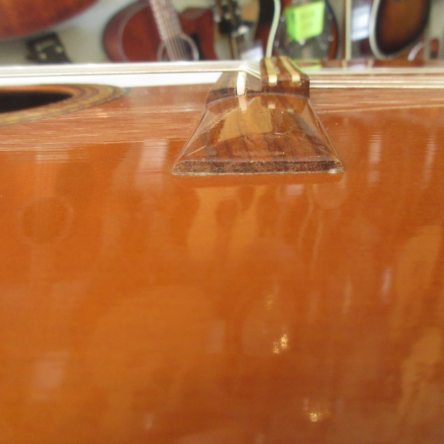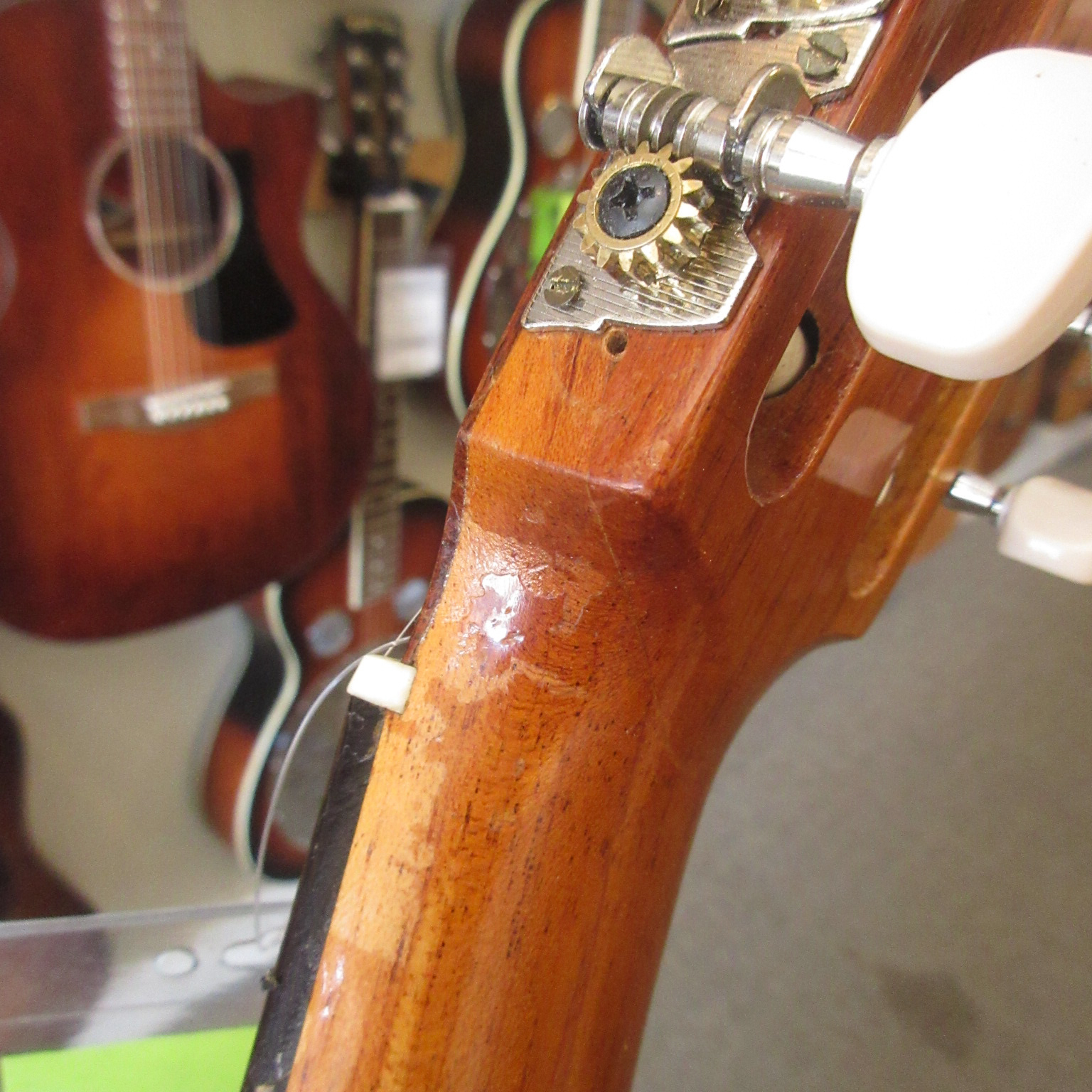 This Conteras Laud is a great sounding and super fun instrument to play. Manuel Contreras (I and II) were renowned Madrid-based luthiers, primarily famous for high-end classical guitars. While specializing in guitars, the Contreras workshop produced exceptional Spanish folk instruments, including the laud, adhering to a “Madrid school” style characterized by rich sound and premium materials. A Spanish folk instrument (cittern family), the laud is a flat-backed, pear-shaped instrument, larger than a bandurria. Features 12 strings in 6 pairs. Tuned one octave lower than the bandurria, G# G#, C#C#, F#F#, bb, ee, aa. Instruments from the Manuel Contreras workshop are characterized by high-quality tonewoods (spruce/cedar tops, rosewood/cypress bodies) and meticulous craftsmanship. The workshop legacy continues through Victoria Velasco and José Antonio Lagunar. We aren’t sure as to when it was made in their shop in Madrid, Spain. It’s tuners look to have been changed. There is some finish wear wear the headstock meets the neck and some on the sides, in the area where your arm goes over the guitar. It’s owner cut a sound port on it’s side and added a pickguard to it. The fret ends could use some filing, as there is some sharpness. The laud came with 3 inlaid pear side position markers. 3 white dots, in White Out, have been added farther up the neck. There are some tiny chips around the edges, light scratching and other light wear. The tailpieces string tangs are all bent slightly. One is missing and was replaced with a nail. The bridge has a dark strip of wood in front of where the bridge saddle sits. It is either purely ornamental, possibly a repurposed classical bridge (since they mostly made those, or was a result of moving the bridge saddle back, to improve intonation. Overall, this laud is in good condition and comes with a cloth gig bag.
