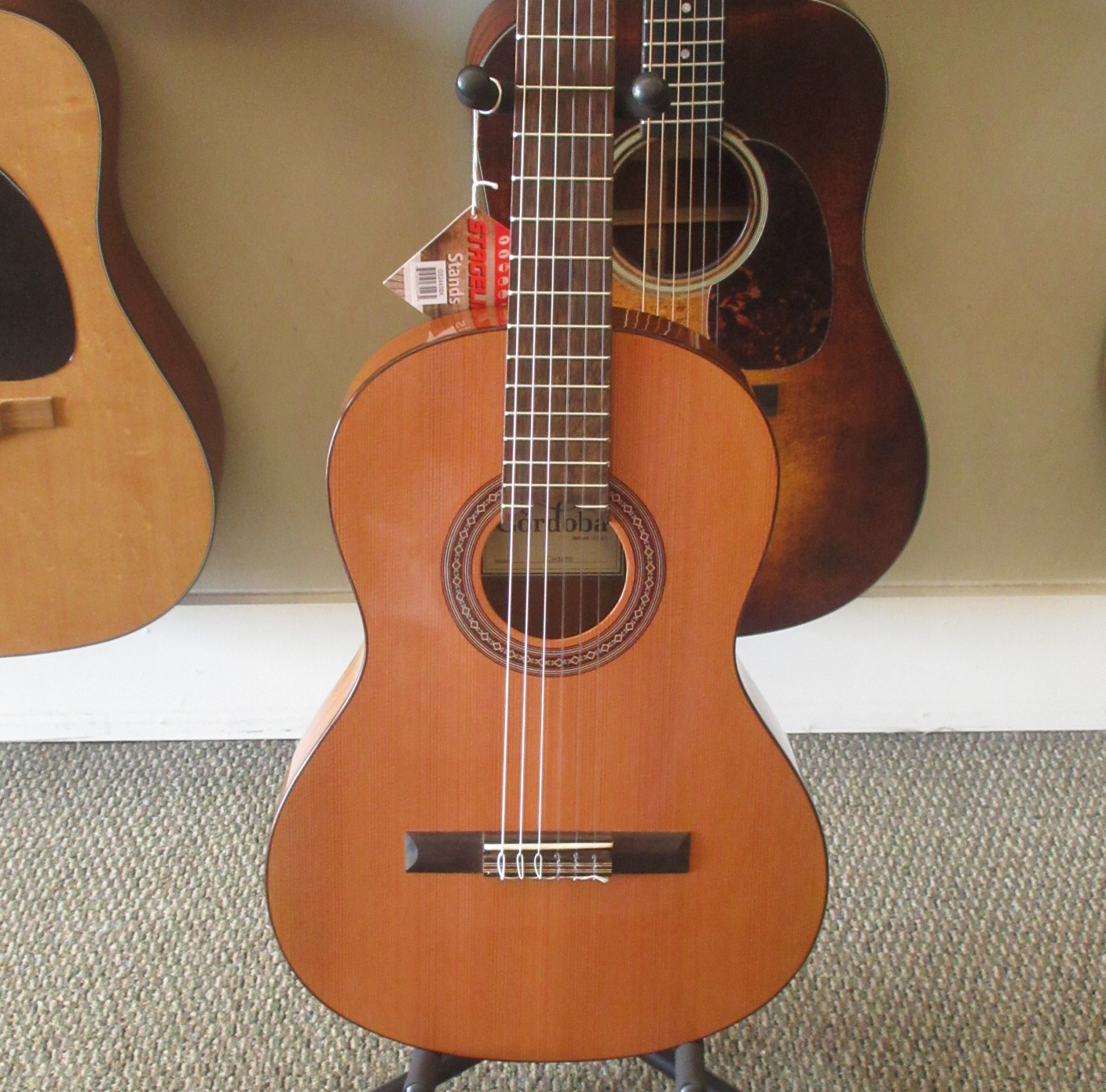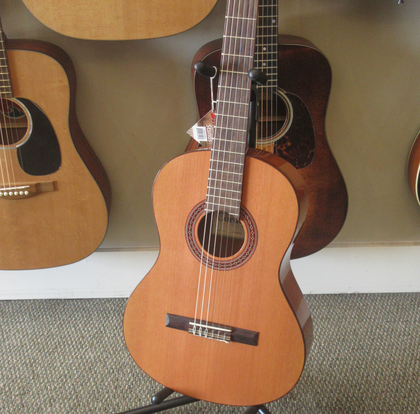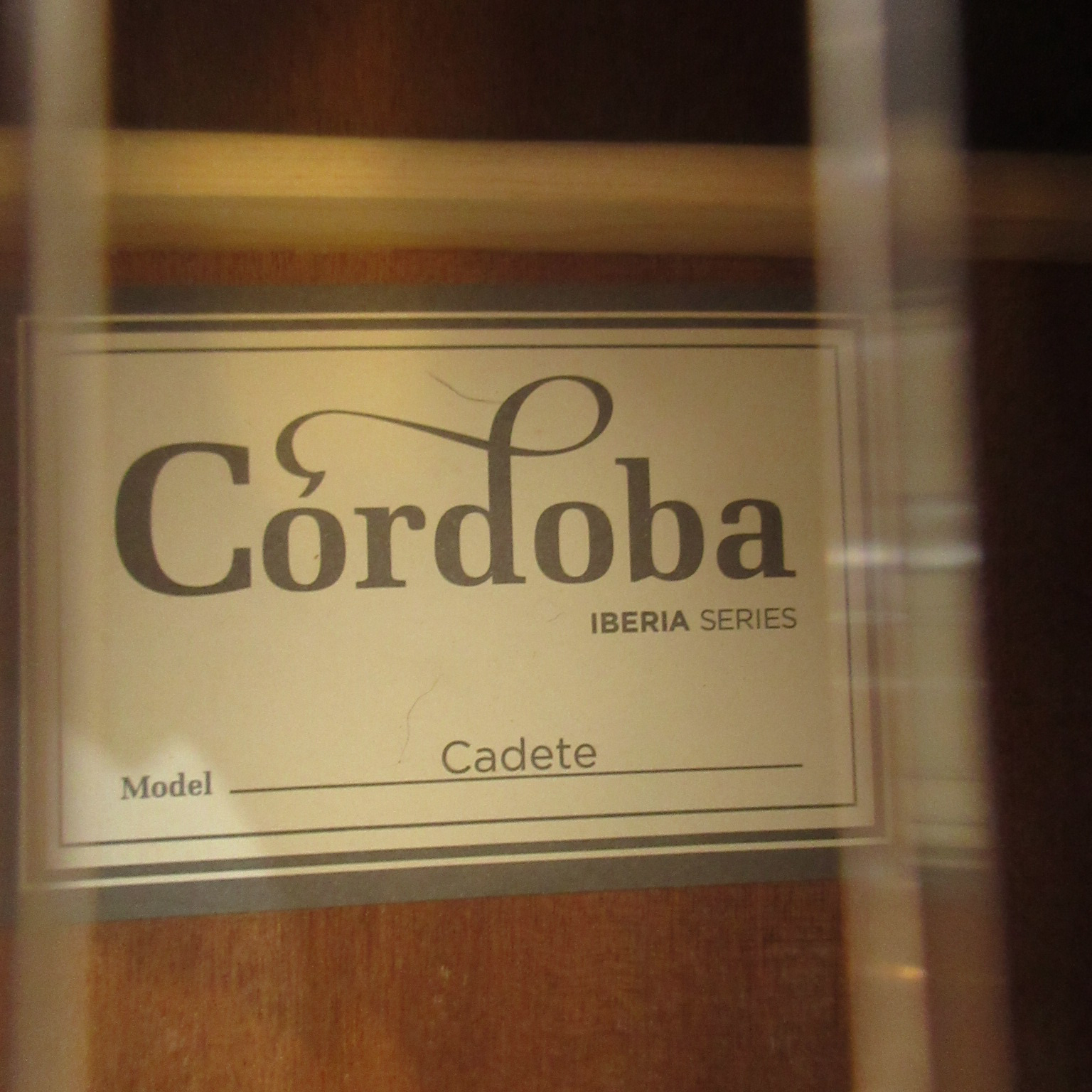 Slightly larger than the Requinto, the Cordoba Cadete is a 3/4 sized classical guitar. It has the traditional Spanish 7 fan bracing, a solid Canadian cedar top and mahogany back and sides. Additional features include a hand inlaid wooden rosette, gold tuning machines with pearl buttons and a rosewood fingerboard. An adjustable truss rod is built into the neck. This is a great guitar for anyone looking for a lightweight, comfortable, and easy playing instrument. This lightly used guitar was only played for a few months, before it was traded back in for a full-scale Cordoba. There are some light fingernail scratches in the finish and one tiny impression on the top by the edge. Neither of these slight cosmetic issues show well in photos, but we’d thought we’d tell you about them. We put on some fresh strings and did some minor tweaking to it, getting it ready for you. This guitar plays easily and has an inspiring tone. It is in very good condition, waiting on it’s new owner.