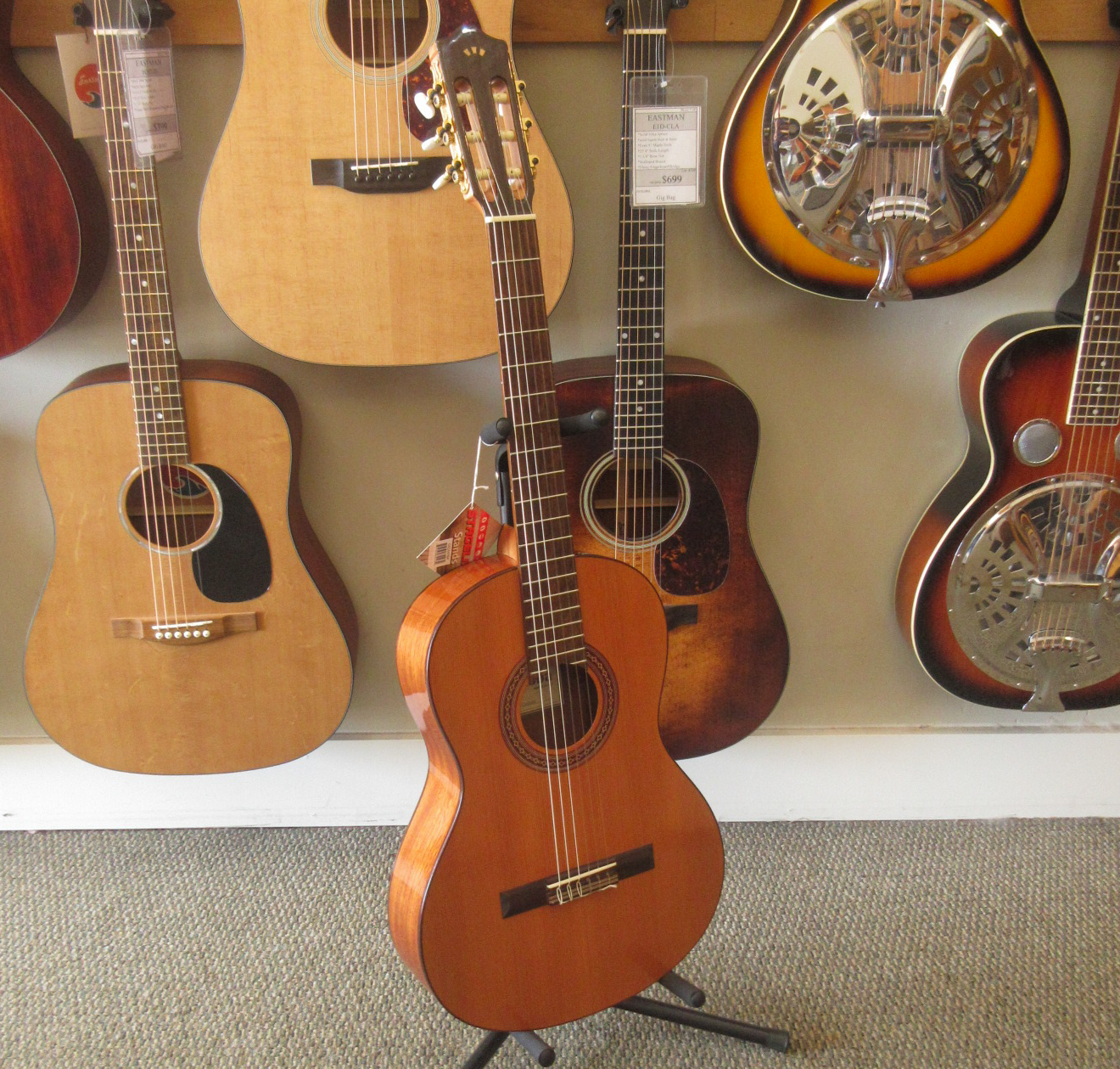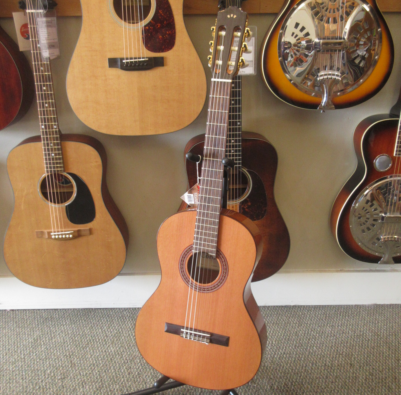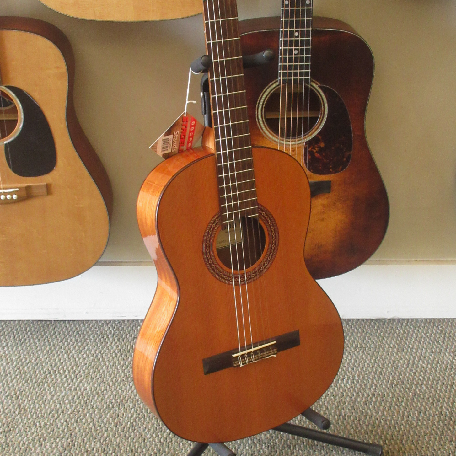 Slightly larger than the Requinto, the Cordoba Cadete is a 3/4 sized classical guitar. It has the traditional Spanish 7 fan bracing, a solid Canadian cedar top and mahogany back and sides. Additional features include a hand inlaid wooden rosette, gold tuning machines with pearl buttons and a rosewood fingerboard. An adjustable truss rod is built into the neck. This is a great guitar for anyone looking for a lightweight, comfortable, and easy playing instrument. This lightly used guitar was only played for a few months, before it was traded back in for a full-scale Cordoba. There are some light fingernail scratches in the finish and one tiny impression on the top by the edge. Neither of these slight cosmetic issues show well in photos, but we’d thought we’d tell you about them. We put on some fresh strings and did some minor tweaking to it, getting it ready for you. This guitar plays easily and has an inspiring tone. It is in very good condition, waiting on it’s new owner.