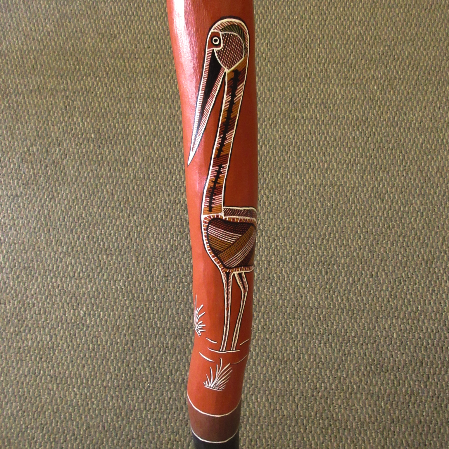 Locally made with imported Australian eucalyptus, this is a charming digeridoo. It produces a nice, haunting tone. Painted body with a bird motif. Beeswax mouthpiece.