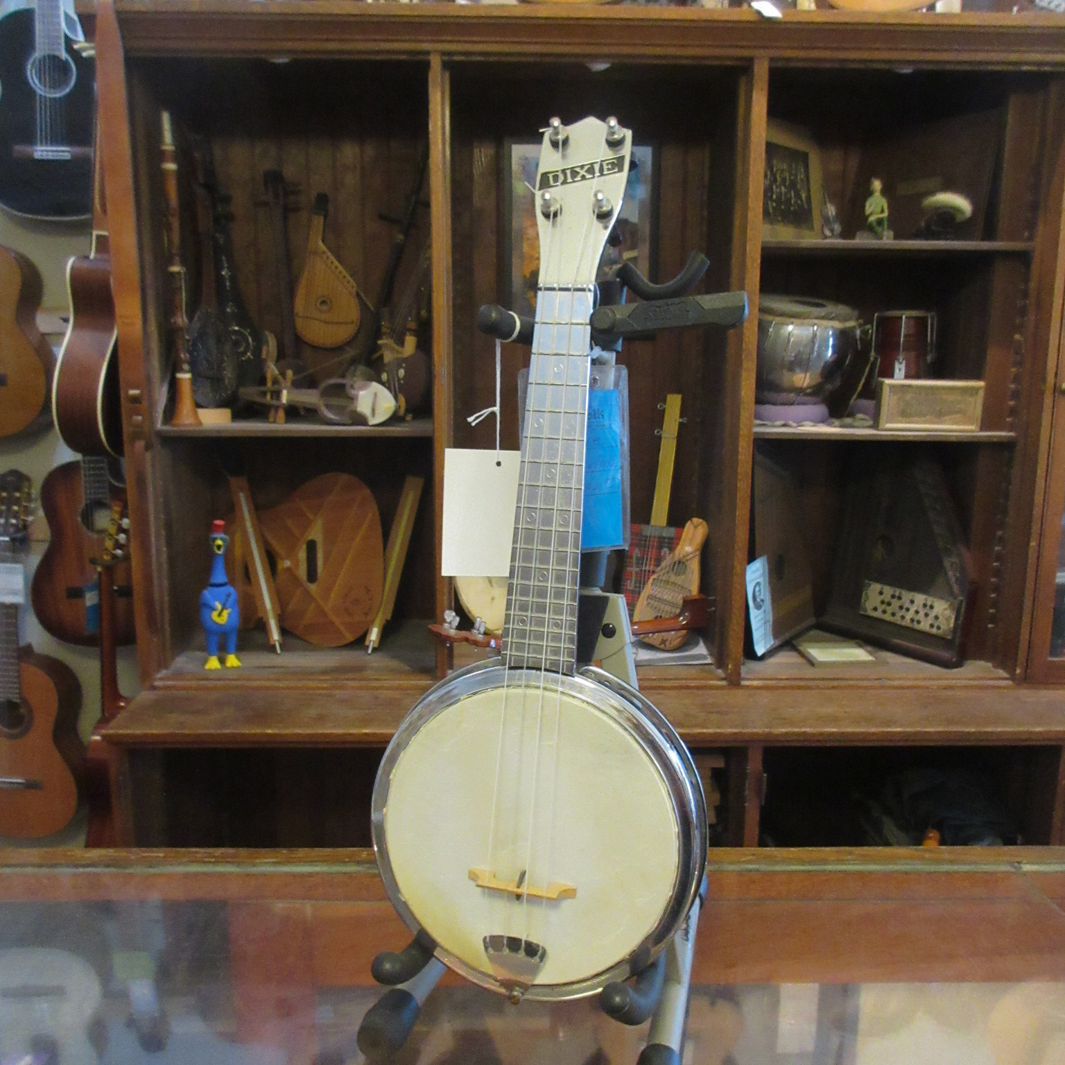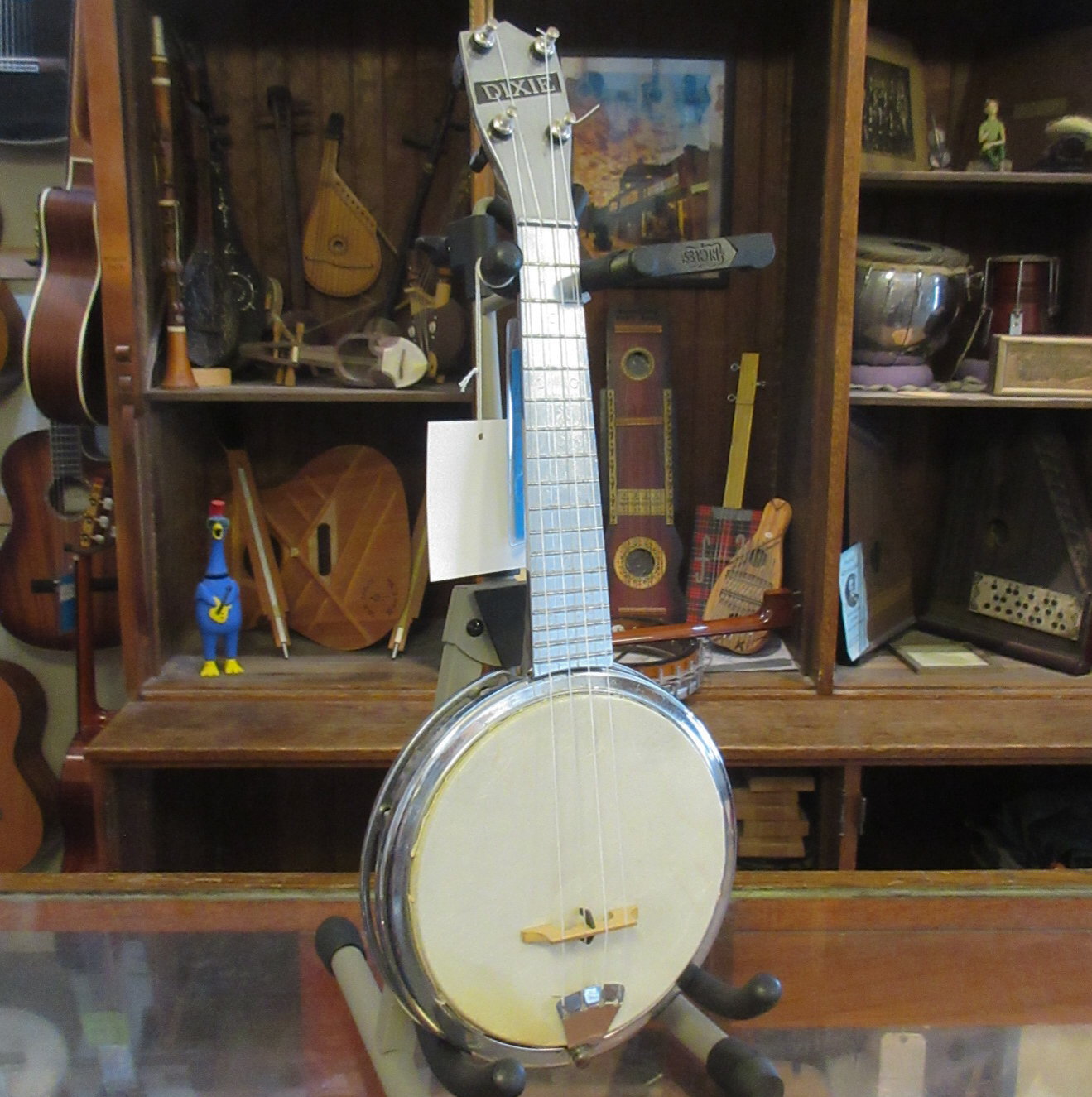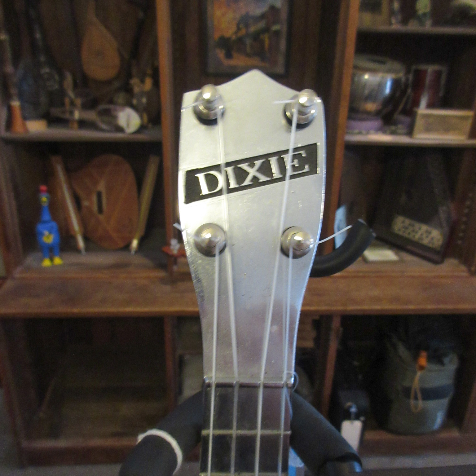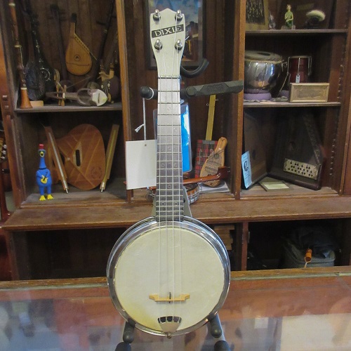 Dixie were cool soprano banjo ukuleles that had cast aluminum necks, rims and tension hoops. They were made during the 1950’s. This one plays really well and sounds really good. It’s a great, fun uke! There is typical pitting but this uke is in very good condition and comes with a gig bag