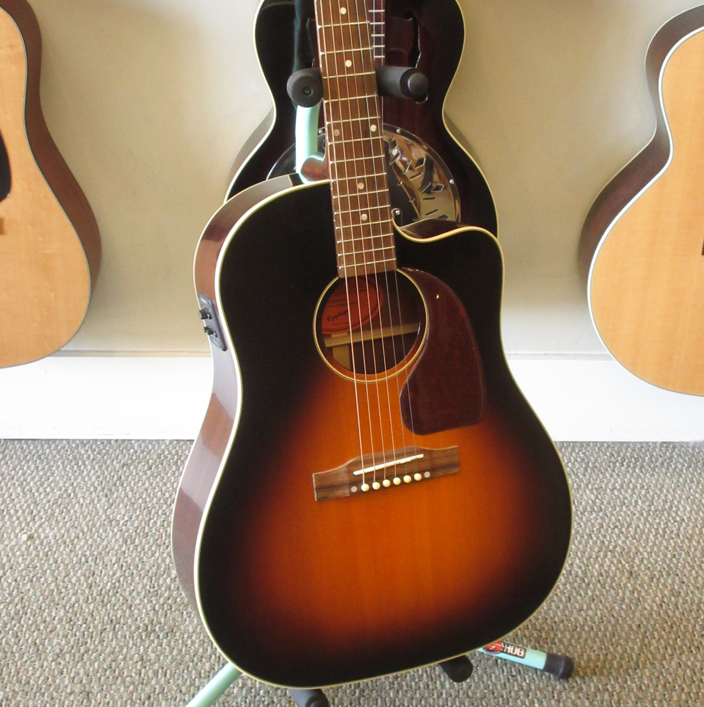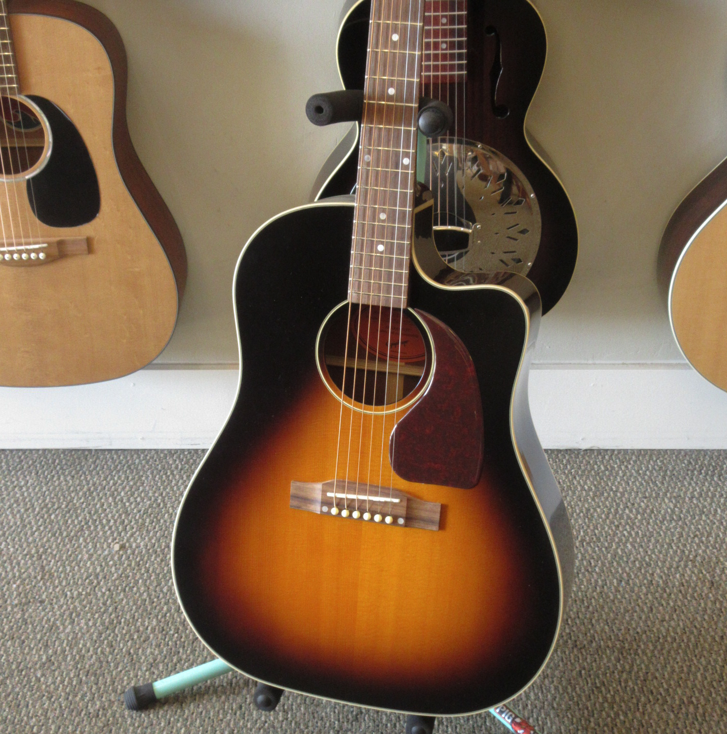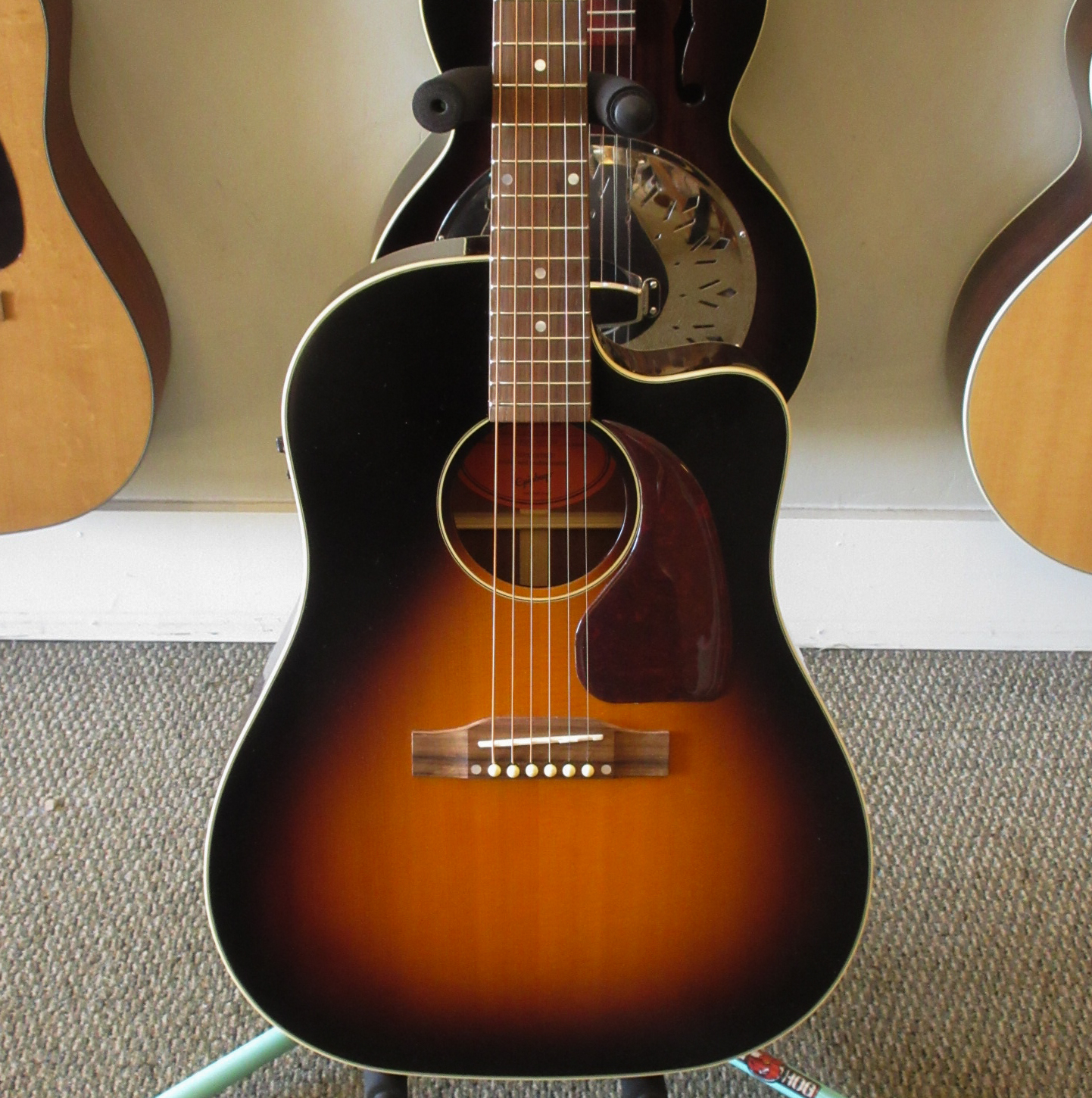 The Epiphone J-45 EC (or “Inspired by Gibson” J-45 Cutaway) is an acoustic-electric slope-shoulder dreadnought featuring a solid Sitka spruce top, solid mahogany back/sides, and a cutaway for upper fret access. It boasts an aged vintage sunburst finish, a 24.72″ scale mahogany neck, Indian laurel fingerboard, and Fishman Sonicore electronics.