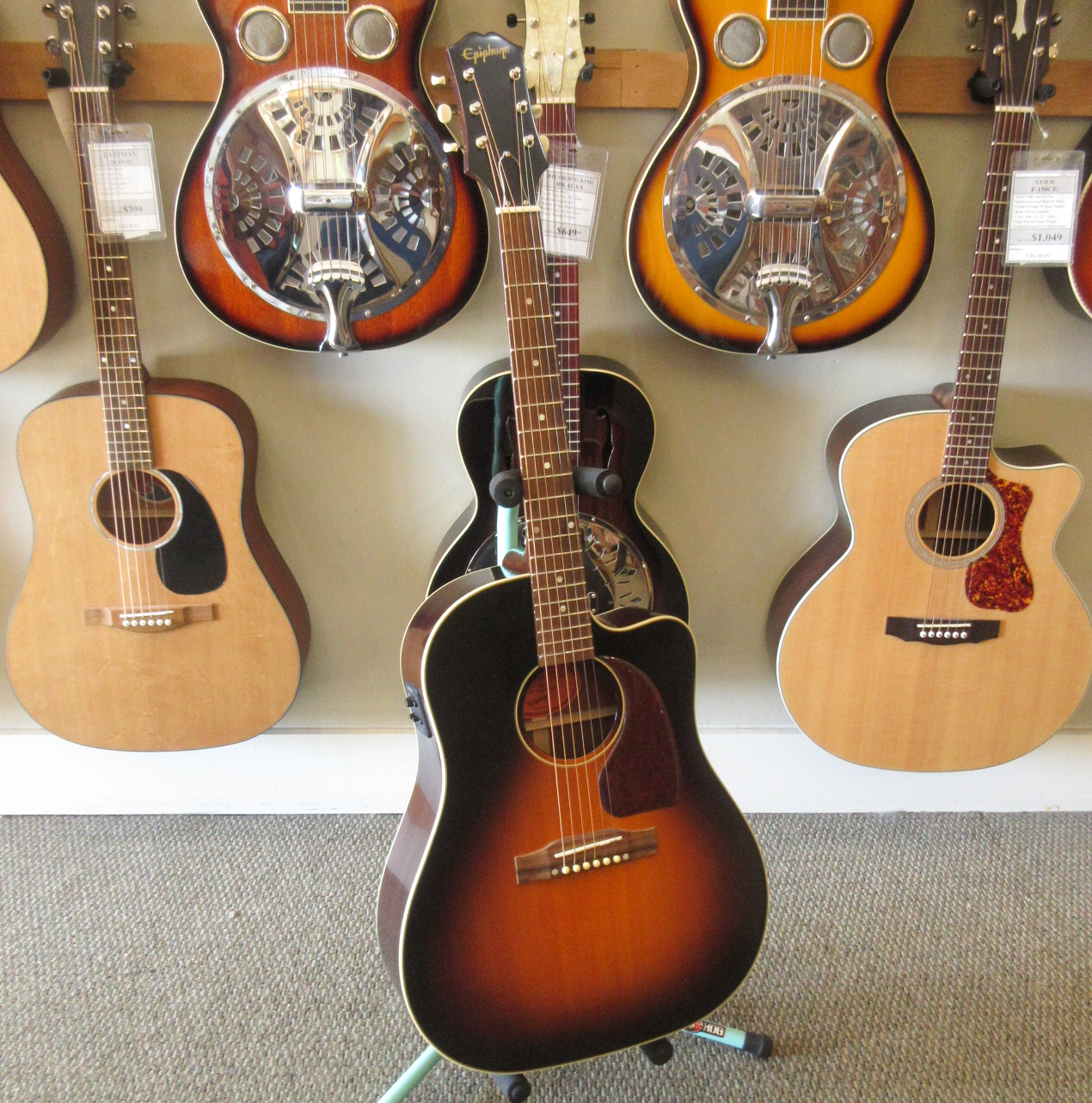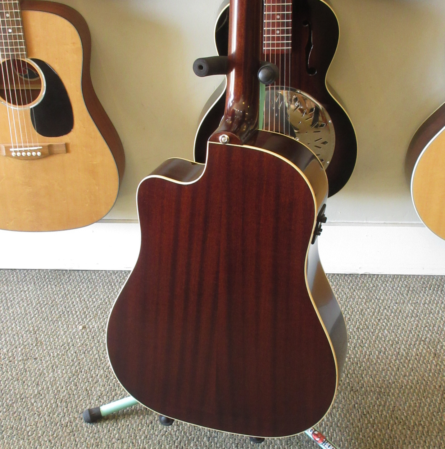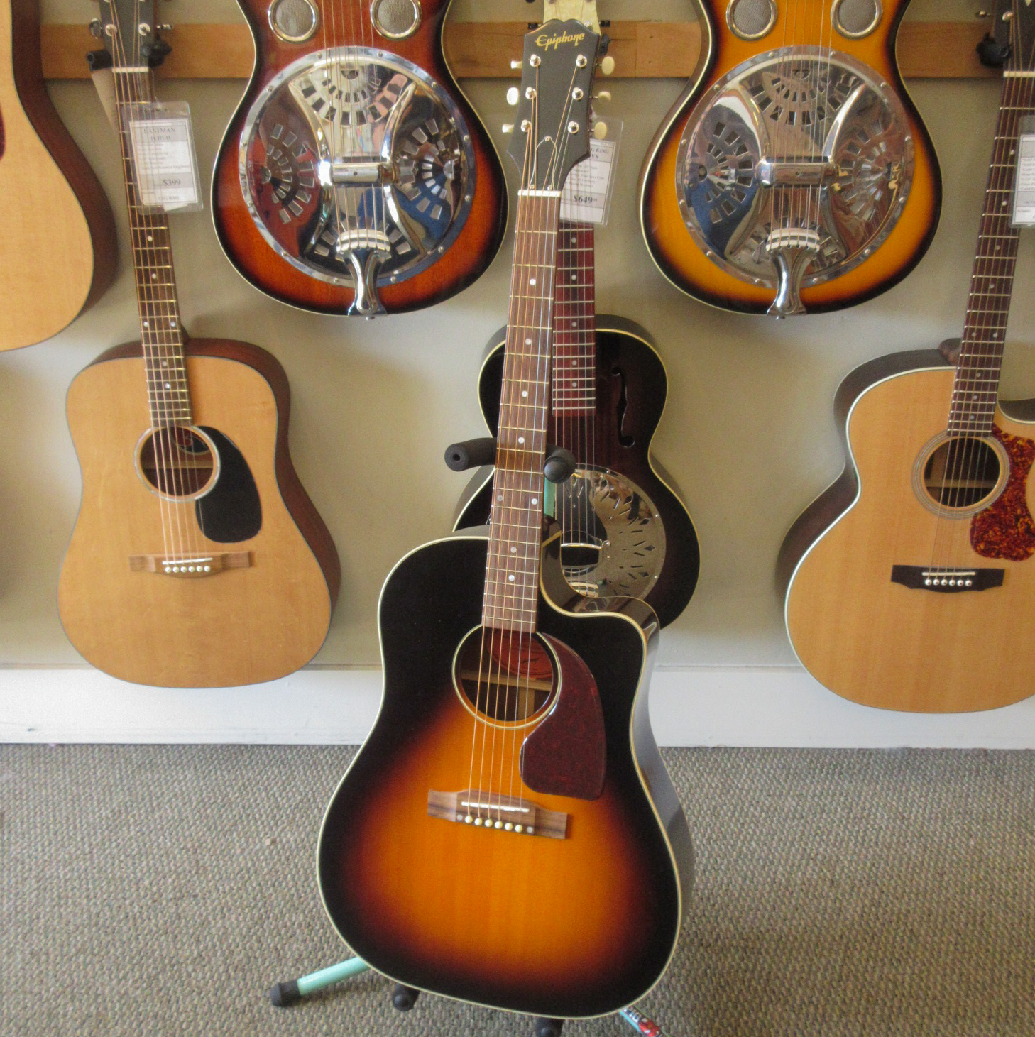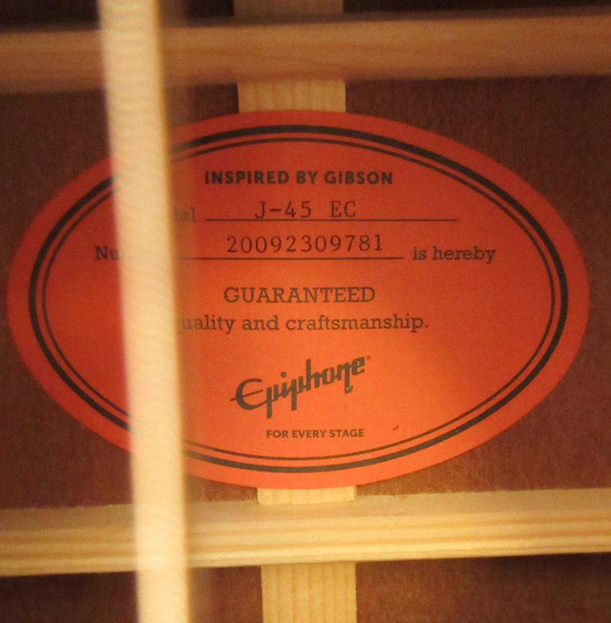 The Epiphone J-45 EC (or “Inspired by Gibson” J-45 Cutaway) is an acoustic-electric slope-shoulder dreadnought featuring a solid Sitka spruce top, solid mahogany back/sides, and a cutaway for upper fret access. It boasts an aged vintage sunburst finish, a 24.72″ scale mahogany neck, Indian laurel fingerboard, and Fishman Sonicore electronics.