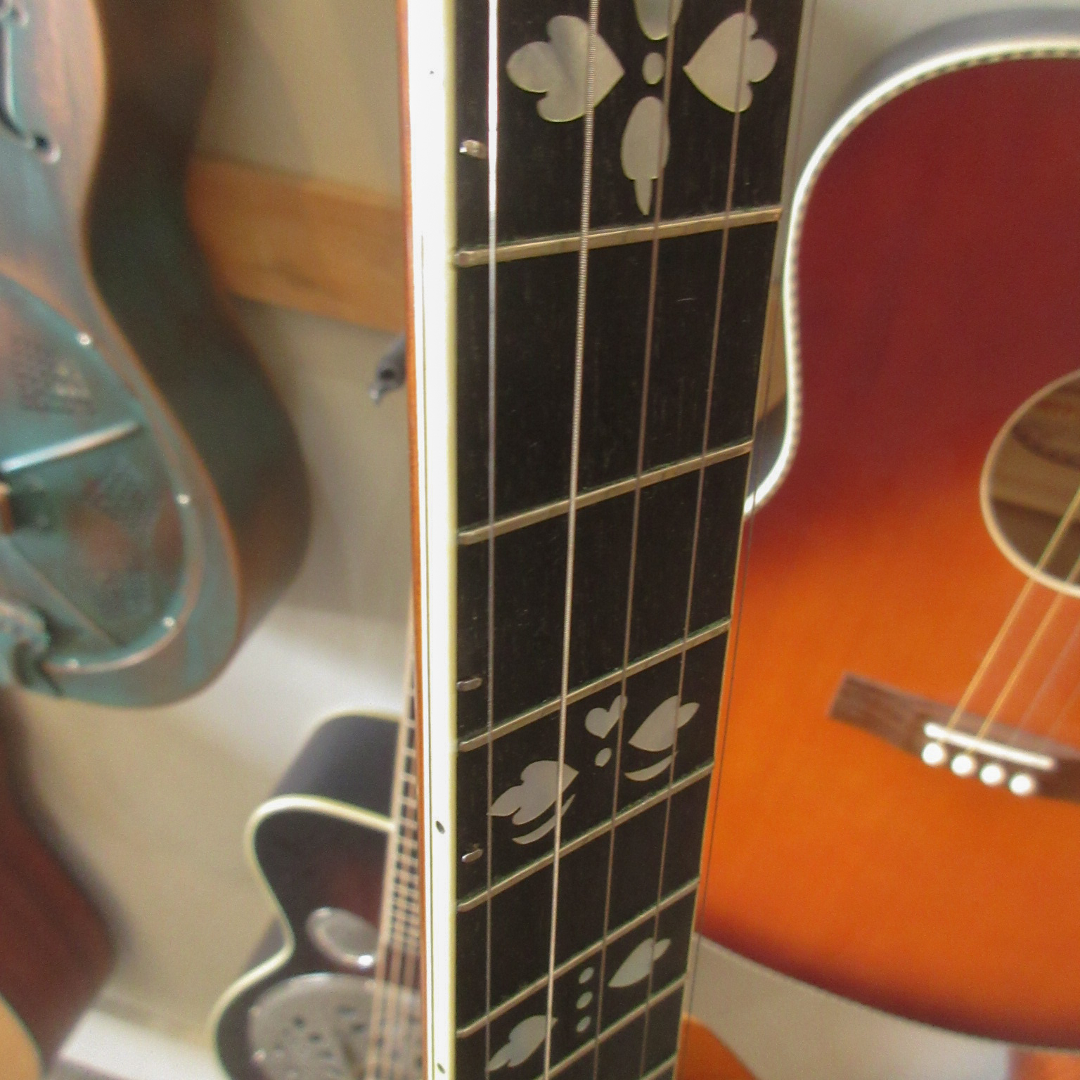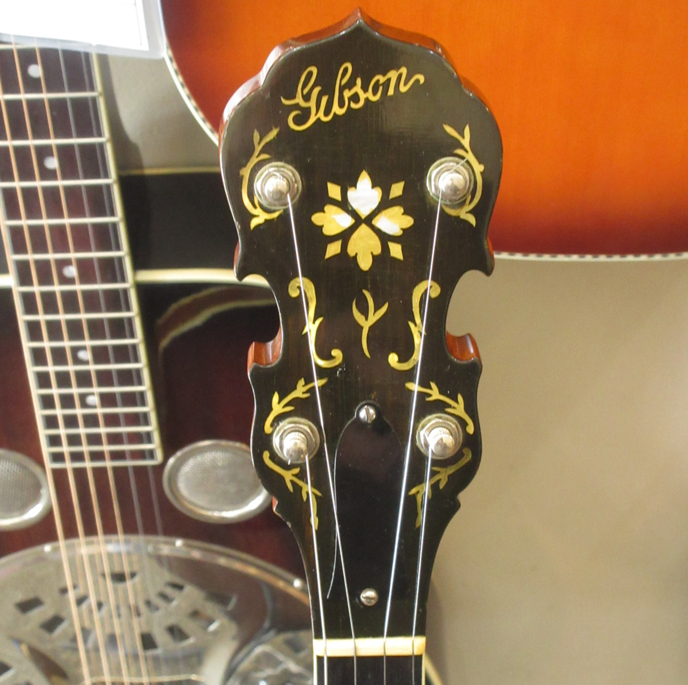 An amazing banjo! This one started out in 1927 as a 4-string plectrum banjo. An Ed Fuchs conversion 5-string neck is on it now, making this an amazing bluegrass machine! It has the tone, projection and playability you expect. A remarkable banjo. Fret spike capos are installed at the 7th, 9th and 10th frets. There is some wear to it over the years. The arm rest’s plating is worn, the rest of the metal parts show normal age. The head has some wear. The resonator has an edge that is a little pushed in under the armrest, it looks like glue had been worked in the binding gap. The original tailpiece is still there. To accommodate the extra string a hole was drilled in it and the string loop needs to double on one of the 4 posts. The new neck has some finish wear on the back and it’s headstock face has checking and some of the gold flake has come off. Archtop tone ring. A compensated bridge is on this. A really great, mostly original, pre-war Gibson (Neck, 5th string tuner, bridge, spike capos, head are not original. The rim and resonator numbers match on it, but the one on the resonator has been modified Original tailpiece has been modified with marker(?).)!!! This awesome banjo is in very good condition and comes with a vintage hard case, possibly original.