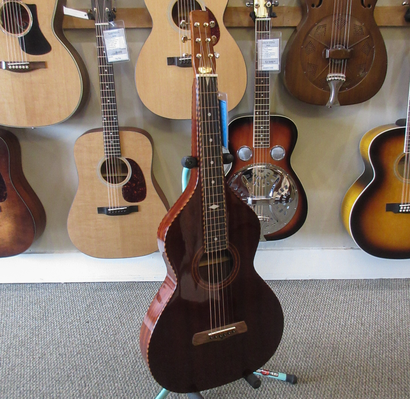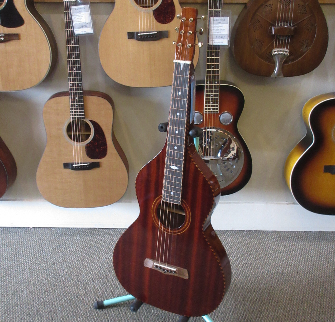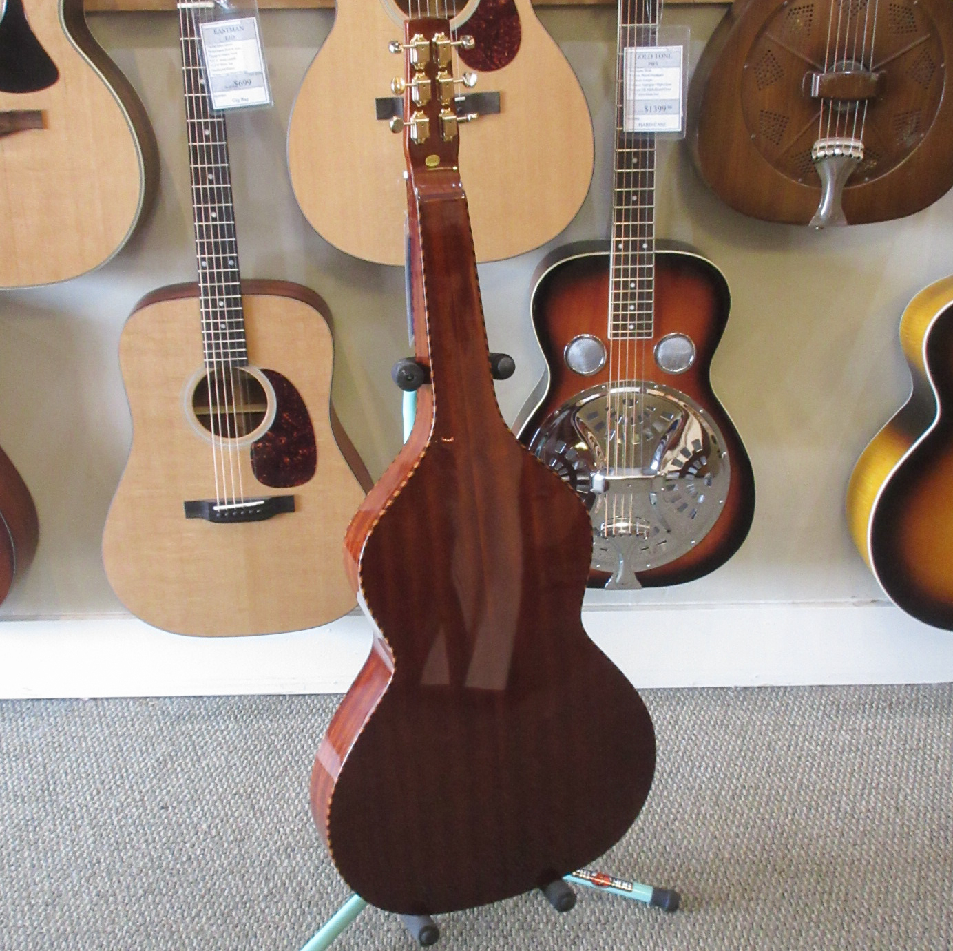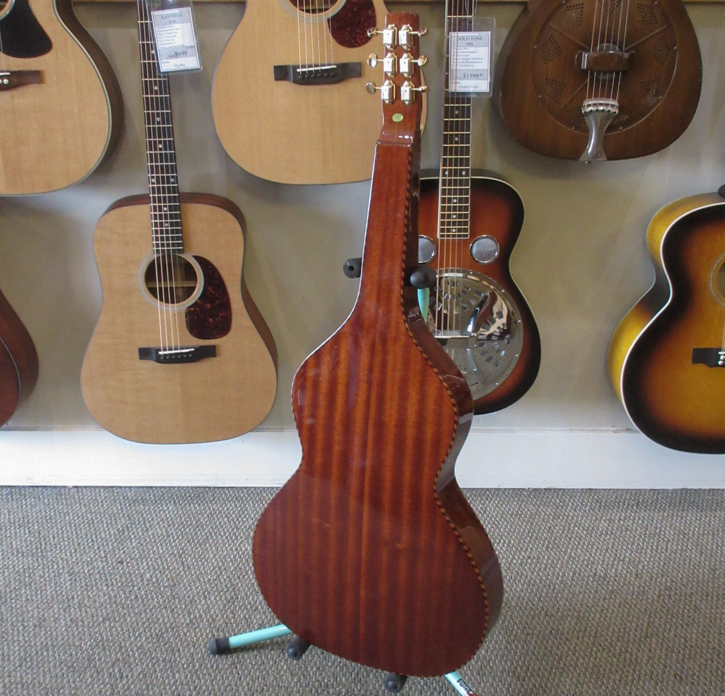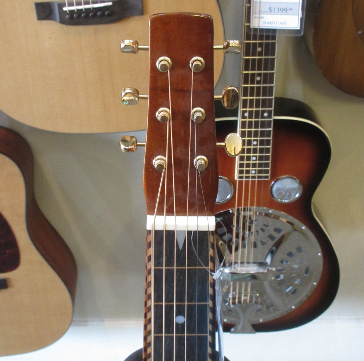 Because of the Weissenborn guitar’s original-style construction, due care must be taken to use the correct tunings and string gauges in order to avoid bridge, bracing or neck problems. The strings supplied (gauged .014, .018, .026w, .034w, .044w, .056w) allow for G (DGDGBD), D (DADF#AD) and similar tunings. Your Weissenborn will not tolerate the excessive tension exerted by E tuning (EBEG#BE), Dobro G tuning (GBDGBD) or similar tunings. The total string tension exerted on ANY Gold Tone Weissenborn guitar should be no more than 175 lbs. when tuned to standard (A440) pitch.