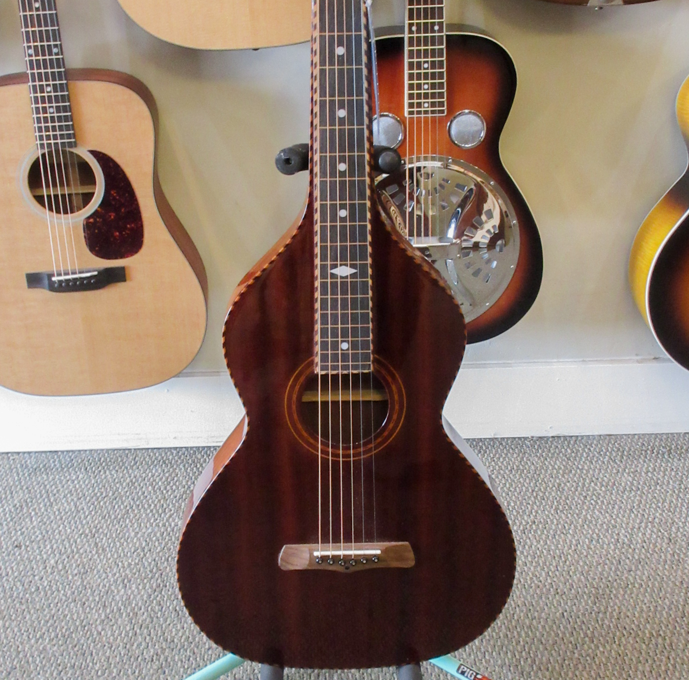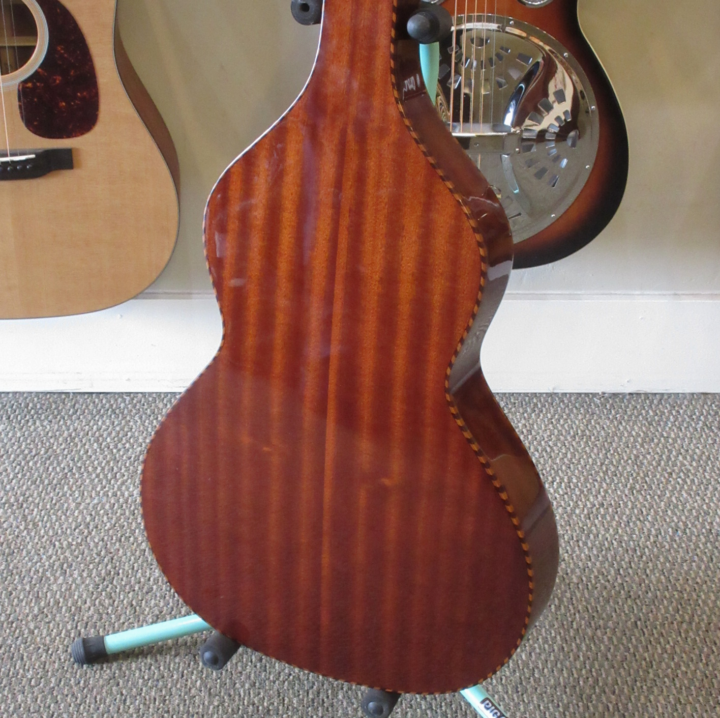 The mahogany back, sides and neck of the SM+ are beautifully set off by original-style maple/mahogany “rope” bindings and a rich honey brown finish. This instrument plays easily and sounds absolutely great, mellow, lively, warm and has good projection and has sustain for days. The guitar has only slight play wear, and not much of it. This instrument is in very good condition and comes with a hard case.
