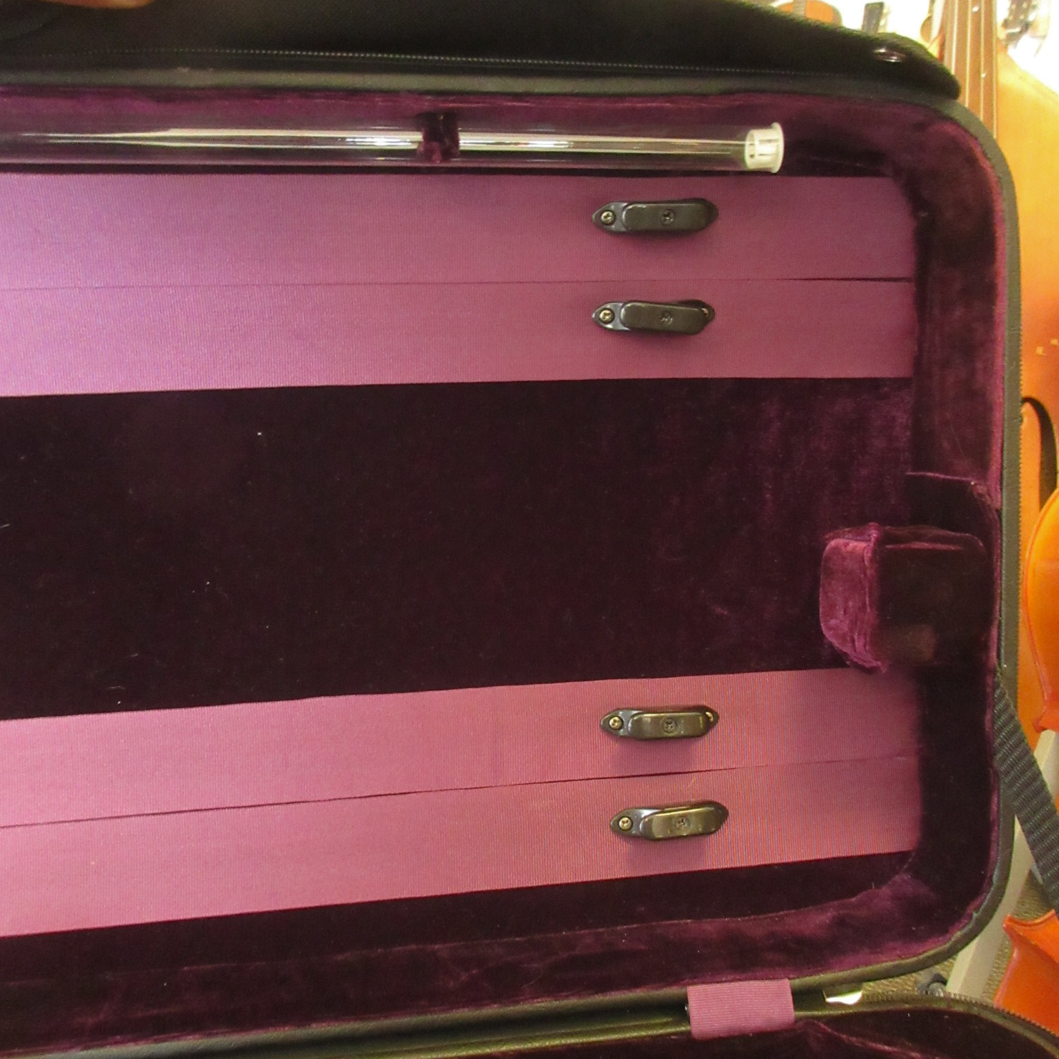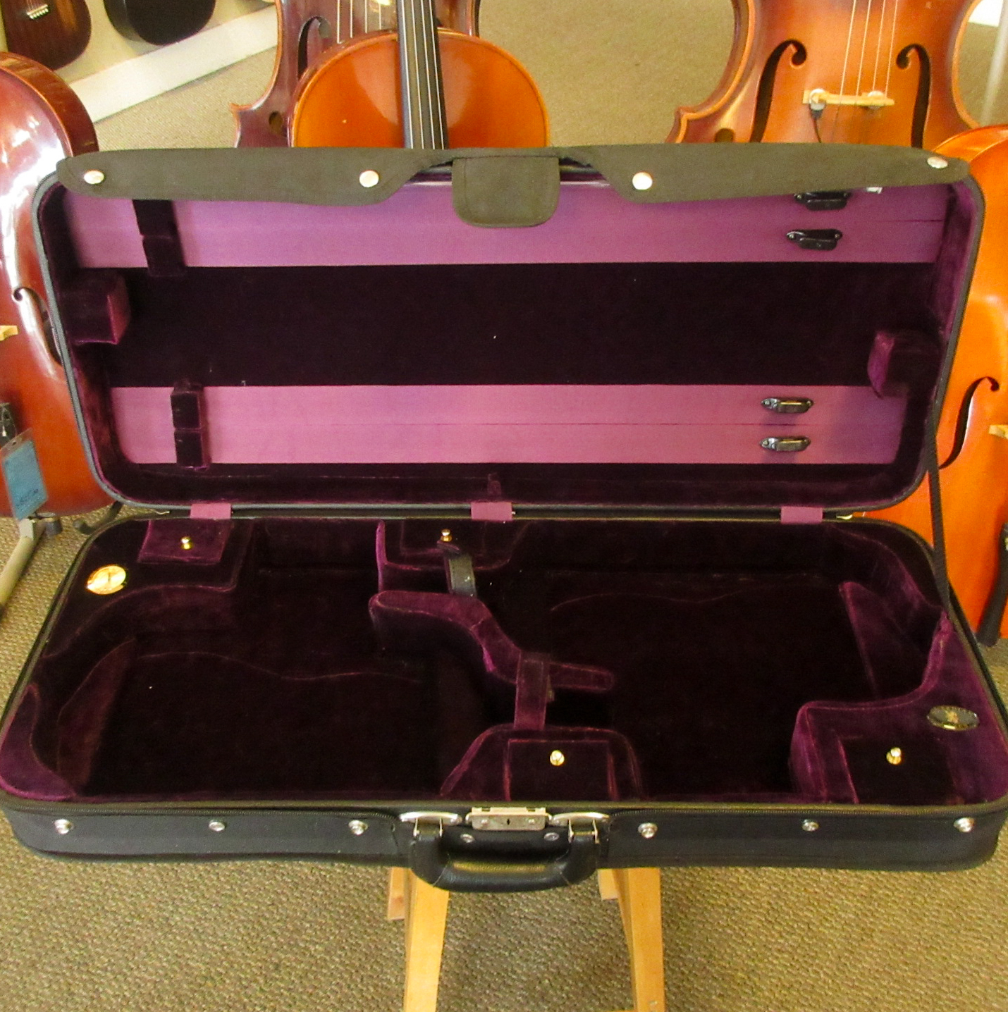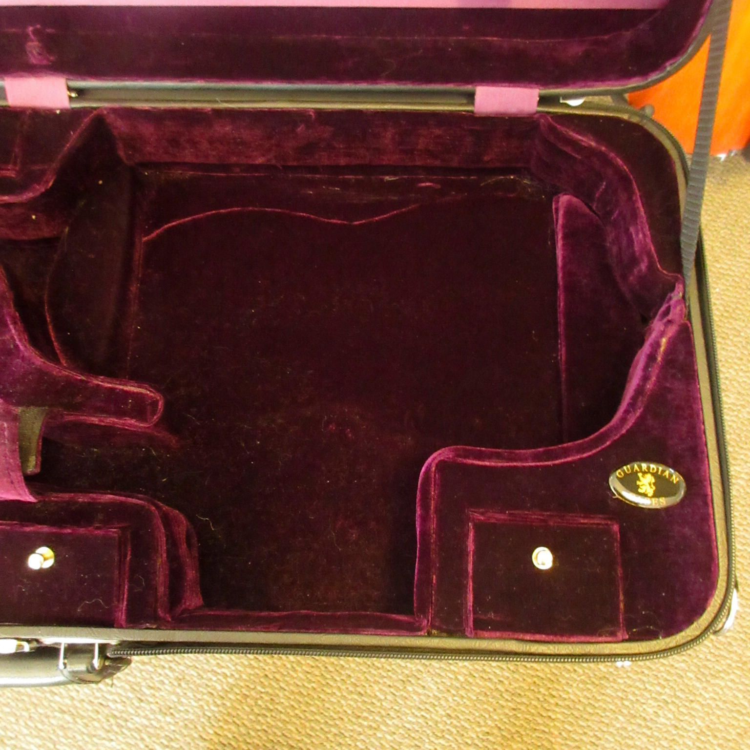 Here is a nice DOUBLE VIOLIN case from Guardian. They are no longer in business and haven’t made the double violin case for a while before they ended. (They still made the violin/F-style mandolin case for a while) They case itself fits 2 4/4 size violins, has cases for 4 bows, a bow hair tube and has 4 internal small item compartments. It’s a used case in good condition, but it doesn’t have straps or the internal case blanket. The velcro that secures the necks is worn, but still has life. It once had stickers on it and there is some glue/adhesive left on it. Overall, this is a great case for 2 fiddles and really isn’t much larger than a rectangular single case.