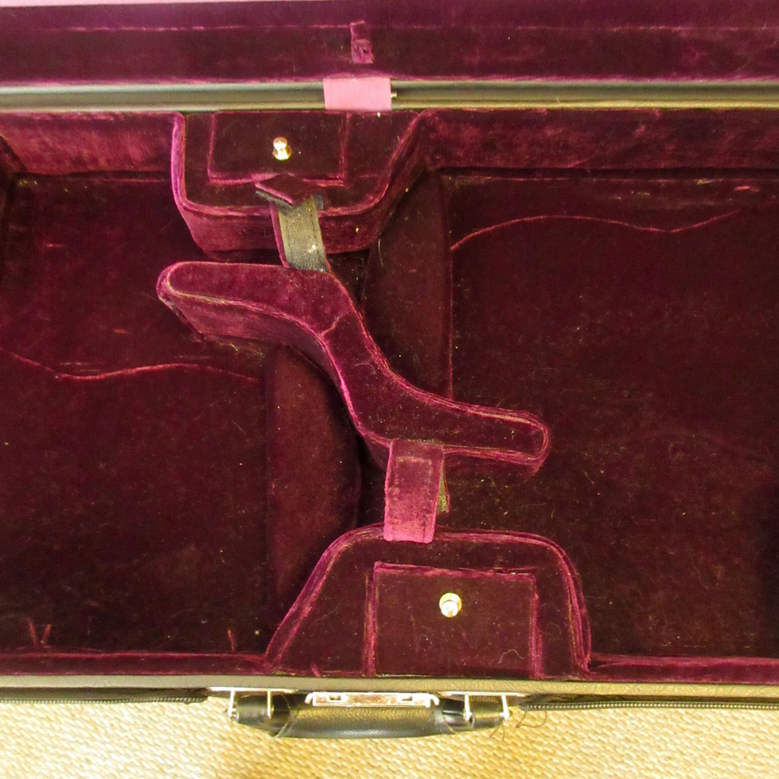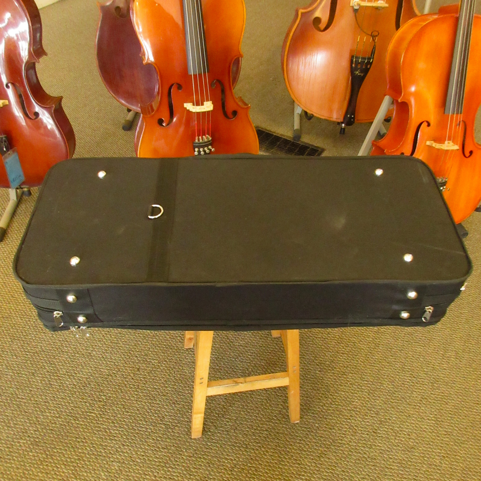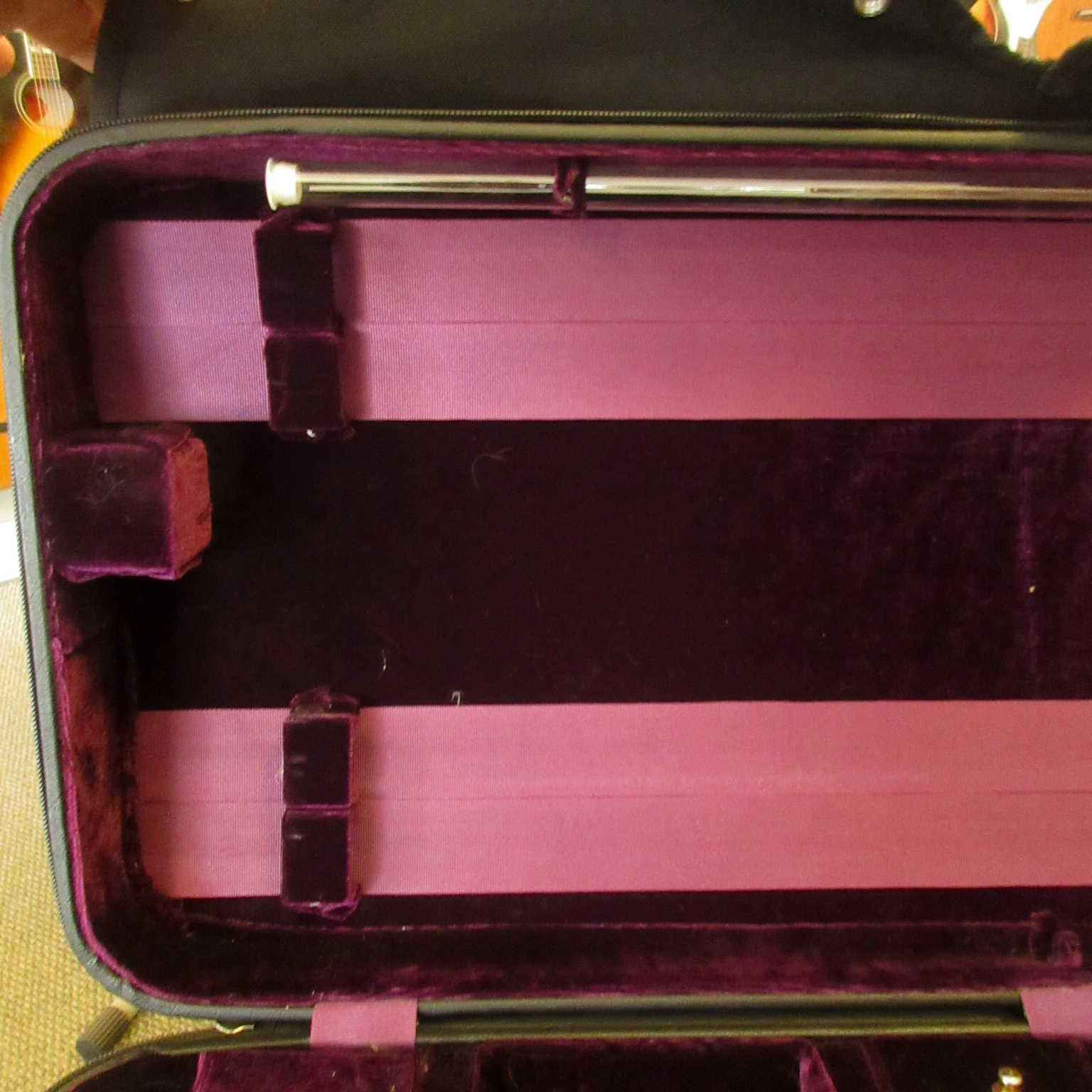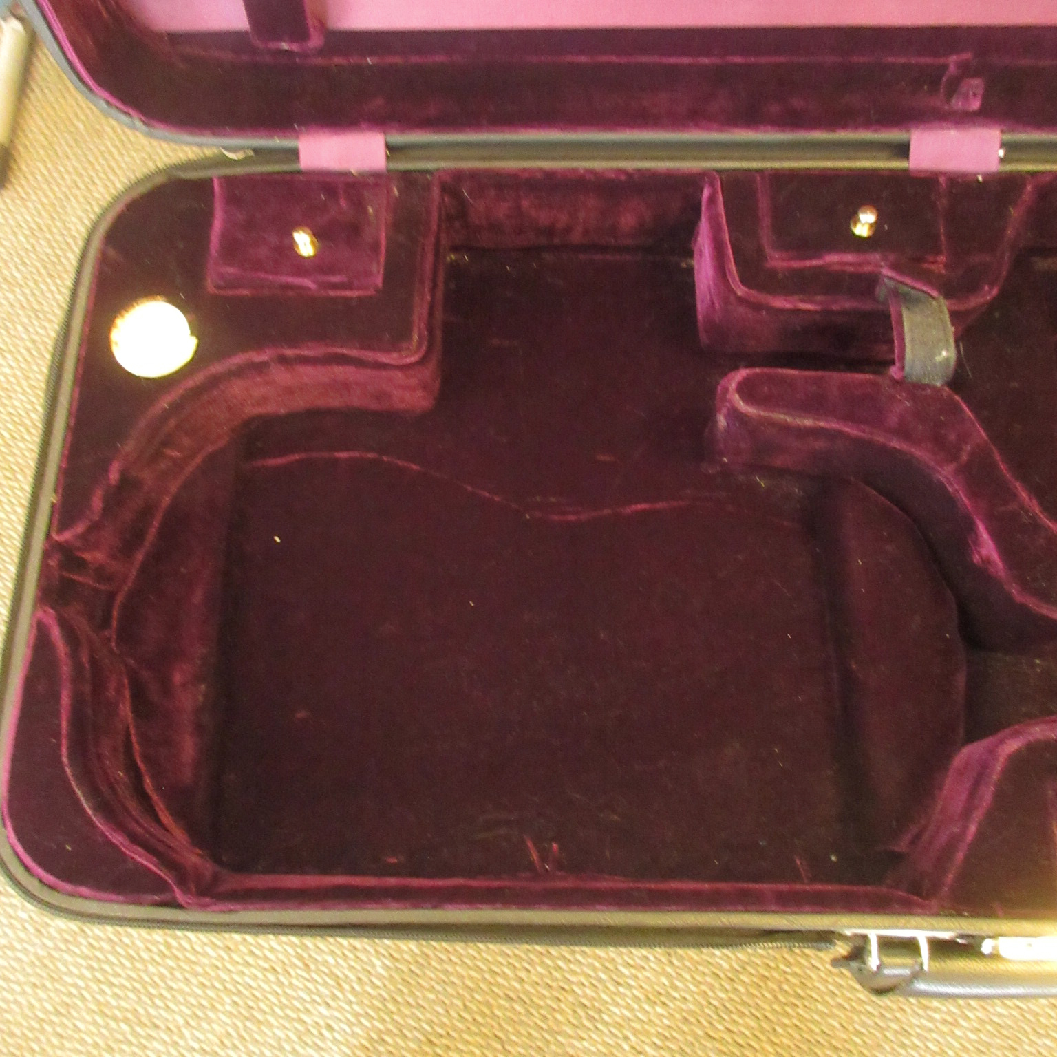 Here is a nice DOUBLE VIOLIN case from Guardian. They are no longer in business and haven’t made the double violin case for a while before they ended. (They still made the violin/F-style mandolin case for a while) They case itself fits 2 4/4 size violins, has cases for 4 bows, a bow hair tube and has 4 internal small item compartments. It’s a used case in good condition, but it doesn’t have straps or the internal case blanket. The velcro that secures the necks is worn, but still has life. It once had stickers on it and there is some glue/adhesive left on it. Overall, this is a great case for 2 fiddles and really isn’t much larger than a rectangular single case.