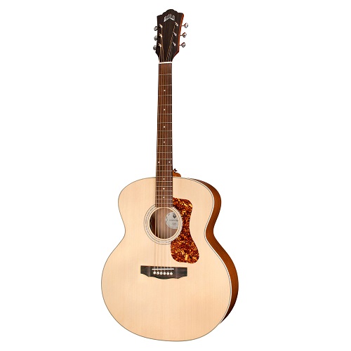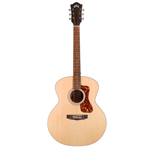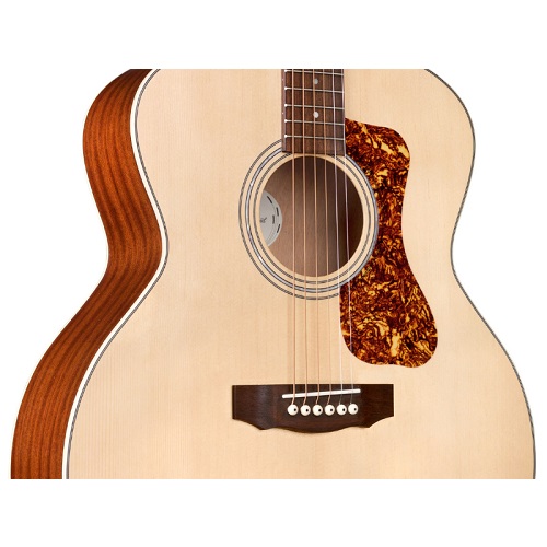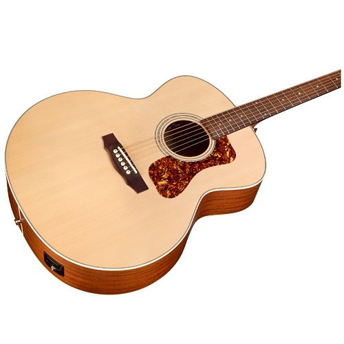 Jumbo shape at a player’s price, the F-240E is an affordable tone cannon. Built with a solid spruce top, mahogany sides, and an arched mahogany back, the full-bodied and powerful voice of this Guild Jumbo provides guitarists with historically-Guild acoustic tone and voicing. Guild’s signature arched back design allows for enhanced volume and projection, long sustain, and a lush, full sound. The F-240E features Guild’s Fishman-designed AP-1 electronics, a pau ferro fingerboard and bridge, bone nut and saddle, mother-of-pearl rosette, period-correct tortoiseshell pickguard, and a satin polyurethane finish.