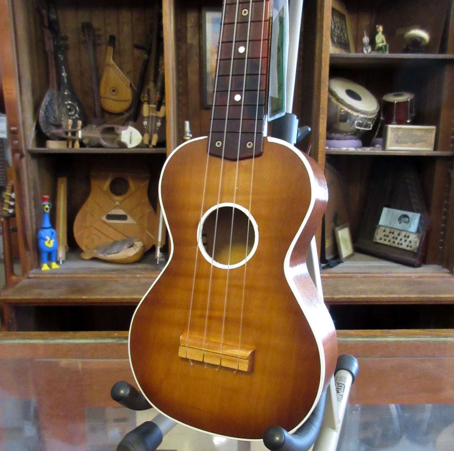 A great piece of vintage Americana, the Harmony soprano ukulele. These were popular gifts and tons of them were sold. This one is in amazingly good condition, with just a little light wear. The Art Deco styled friction tuning pegs work well and stay in tune. The ukulele plays easily, with correct action. It is in very good condition and comes with a hard case.