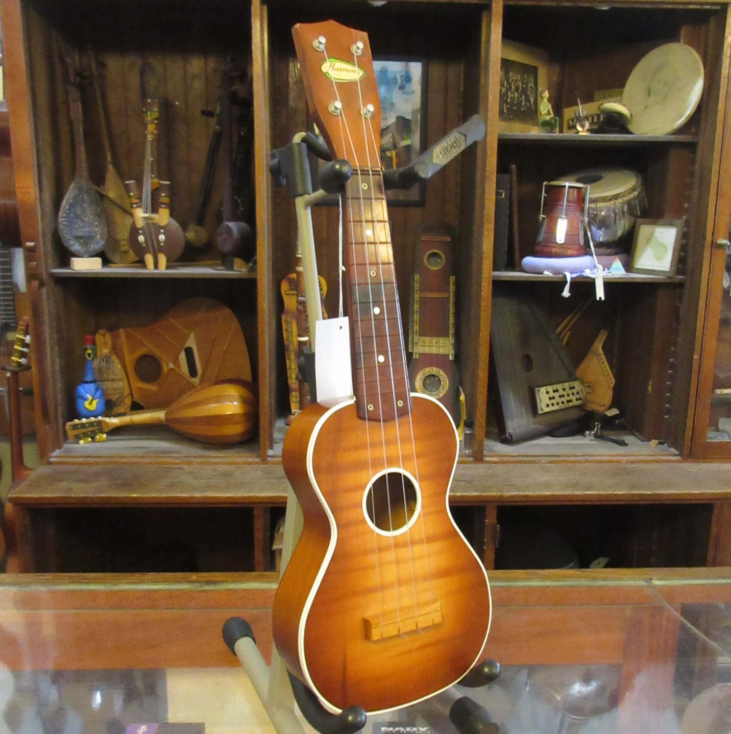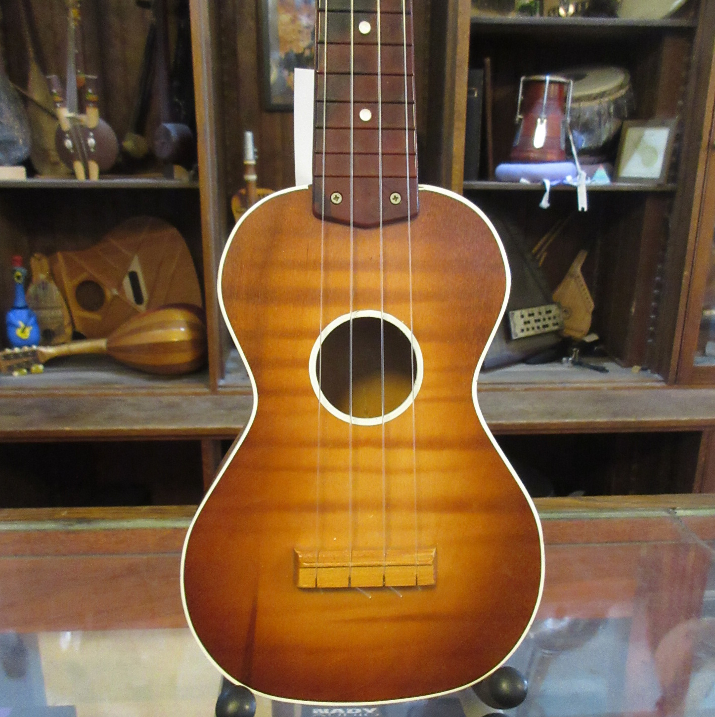 A fine 1950’s era Harmony soprano ukulele. This is the model with the composite fingerboard and the cool Art Deco friction tuners. Solid birch body. We gave this a full set up and new strings, so she’s all ready to take home and enjoy! This one is in much better condition than these normally are. The finish colors are much more vibrant and there is very little wear, the worst is on the headstock face by the A tuner. A cool uke!