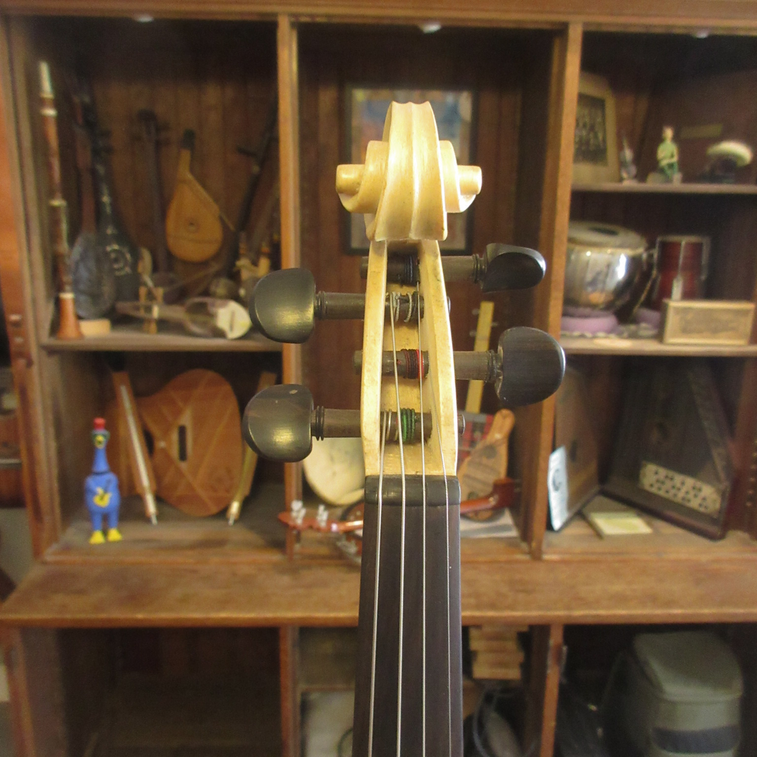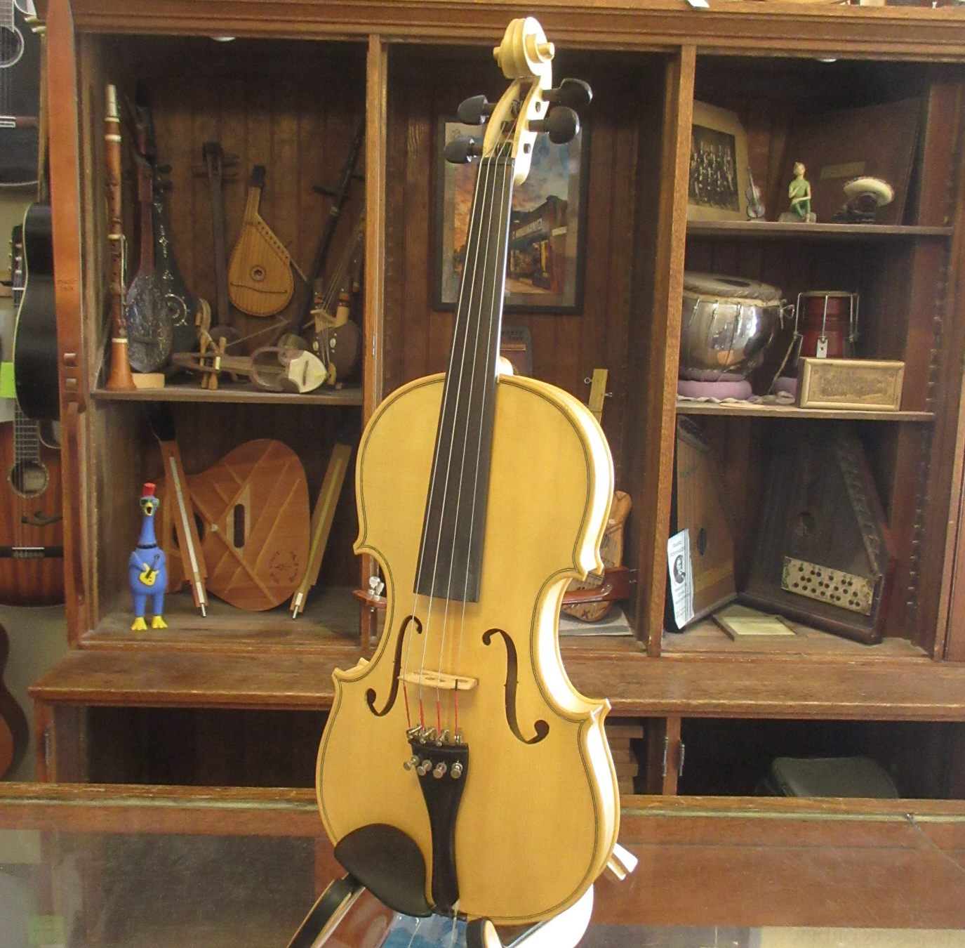 Ever think about learning to play the fiddle, but don’t want to spend a lot for one? This violin should be right up your alley! This instrument’s label said it is the product is by “German Engineering,” but is Chineese in origin. The instrument tunes up easily and holds tune well. 4-fine tuners are fitted to the bridge for making the smaller increments easier to tune. This violin plays easily and has a decent tone, perfect for beginners. There is some light wear from play and that’s it. This instrument is in very good condition and comes with a hard case. — All for $90! This one won’t last long!