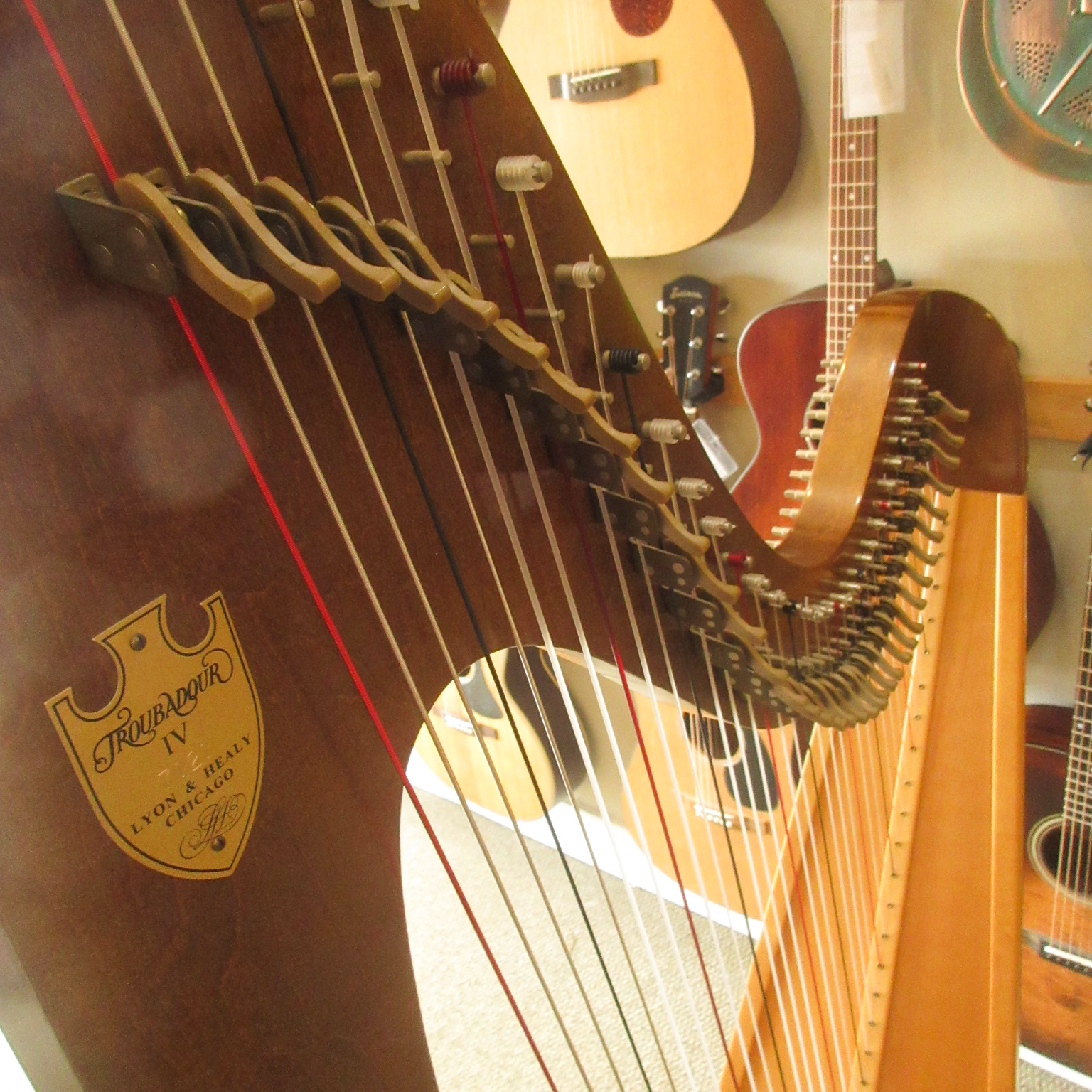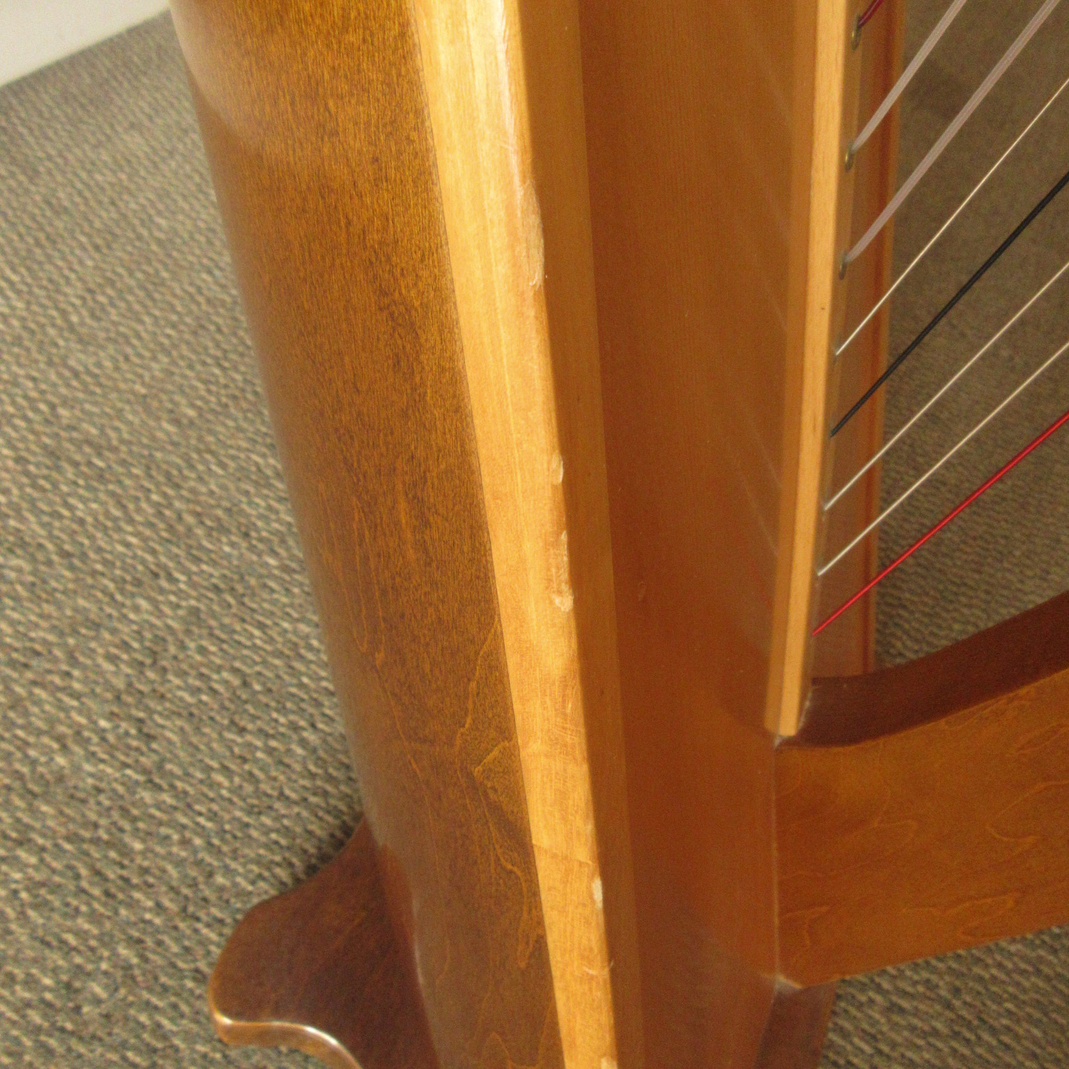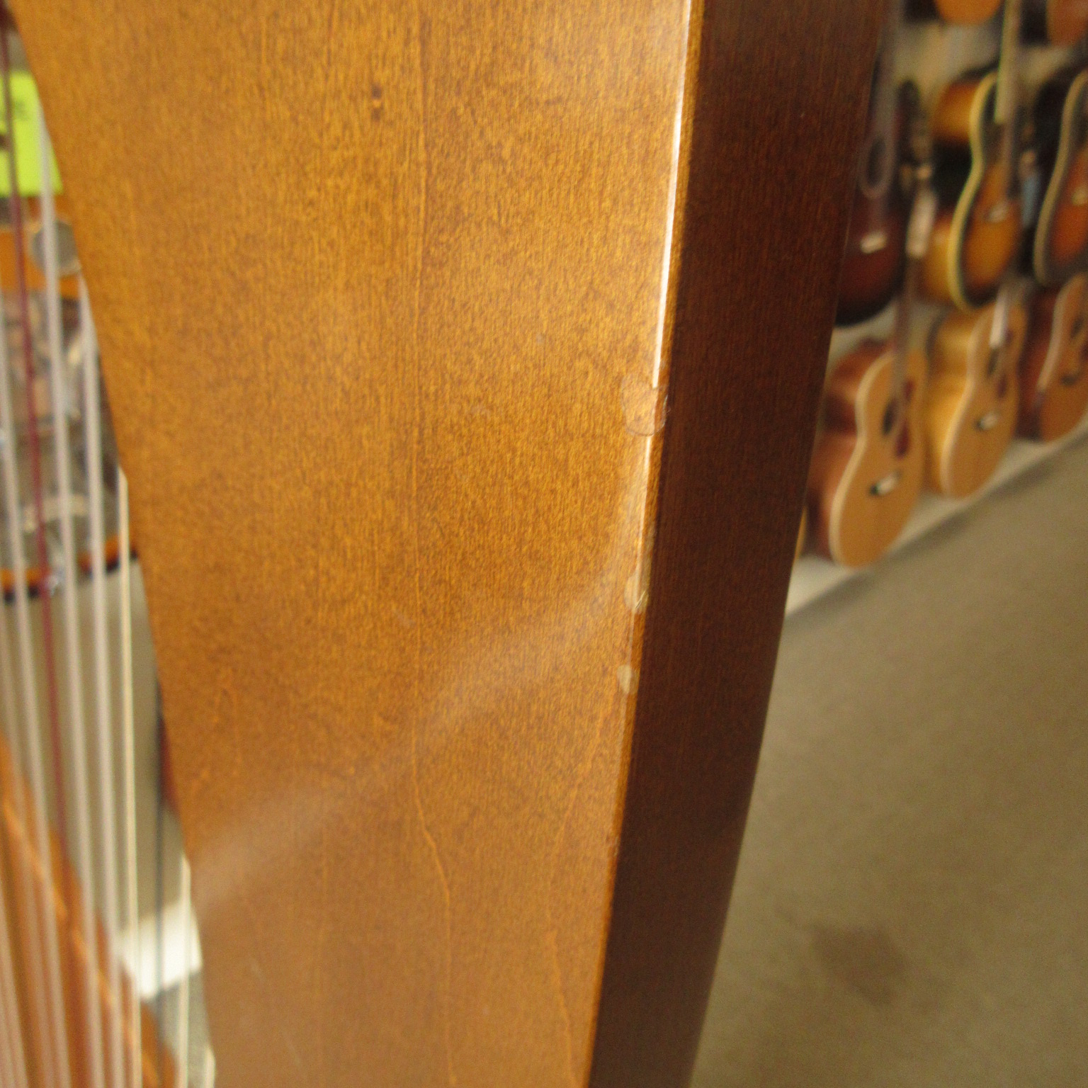 The Troubadour is a foundationstone of the Lyon and Healy lever harps, having been in circulation, with developing configurations since the mid 1960’s. Trobadour IV’s were made from 1992-2001. The Troubadour IV is a 36 string harp, tall with strong, expressive tone. The Troubadour is a pedal-tensioned harp, with strong response and spacing appropriate for the professional harpist wanting a lever harp in his or her stable of harps and for the beginner looking to launch a harp journey with an economical, yet properly expressive for any performing artist. We replaced all of the strings. There are some small dings along the edge of the body and at the bottom of the soundboard. The sound of this is amazing. It’s rich and penetrating, bold and beautiful! It is in very good condition and comes with a cover.