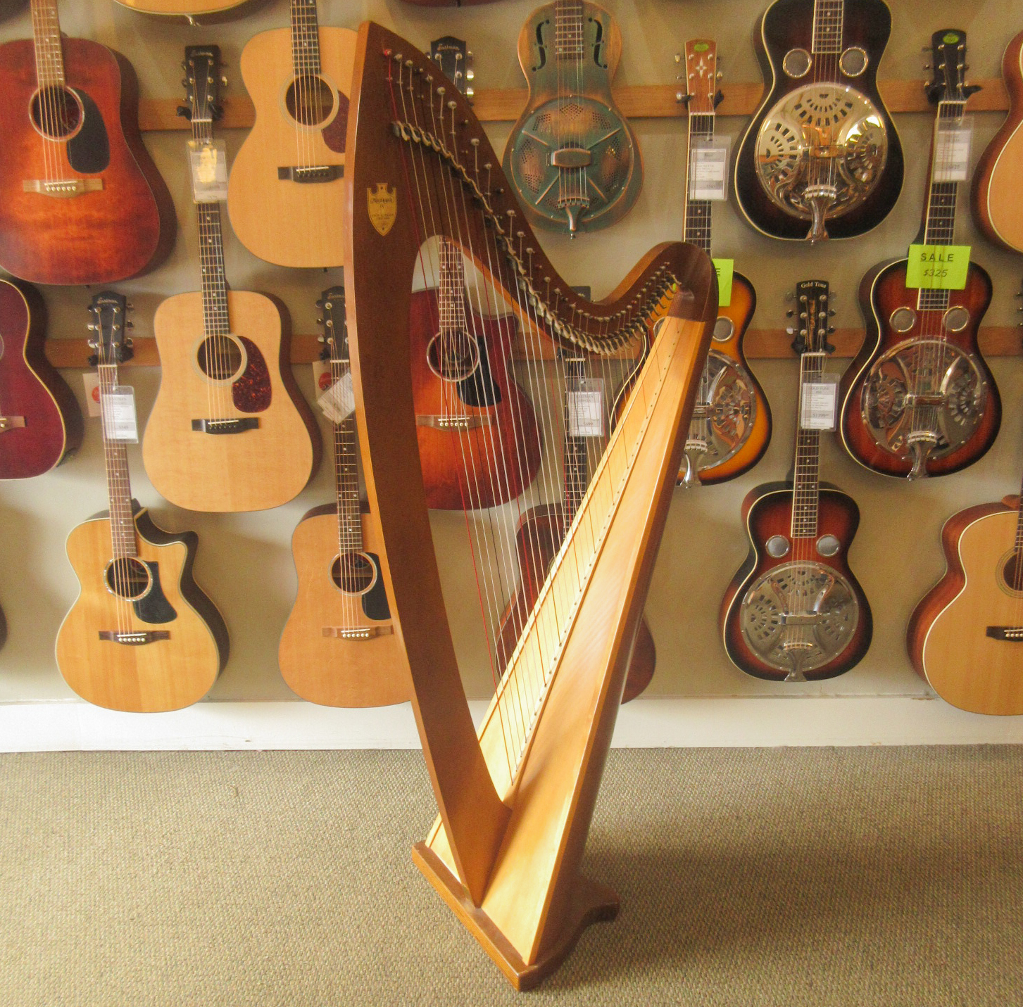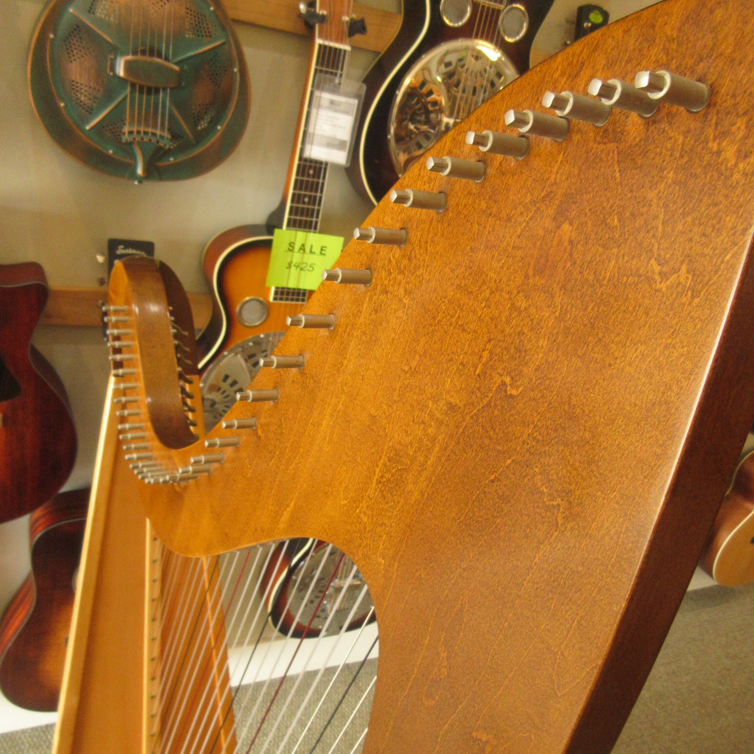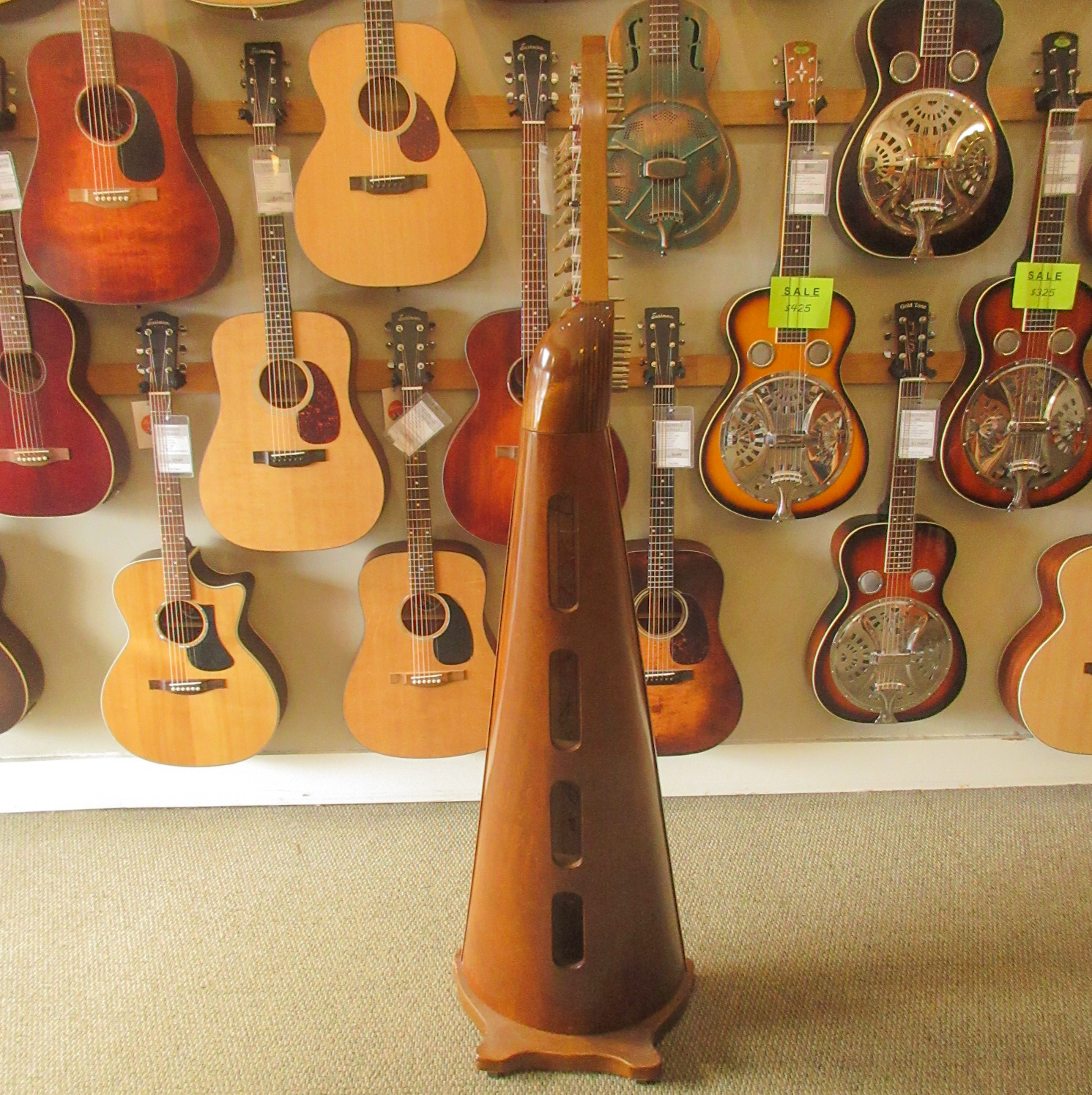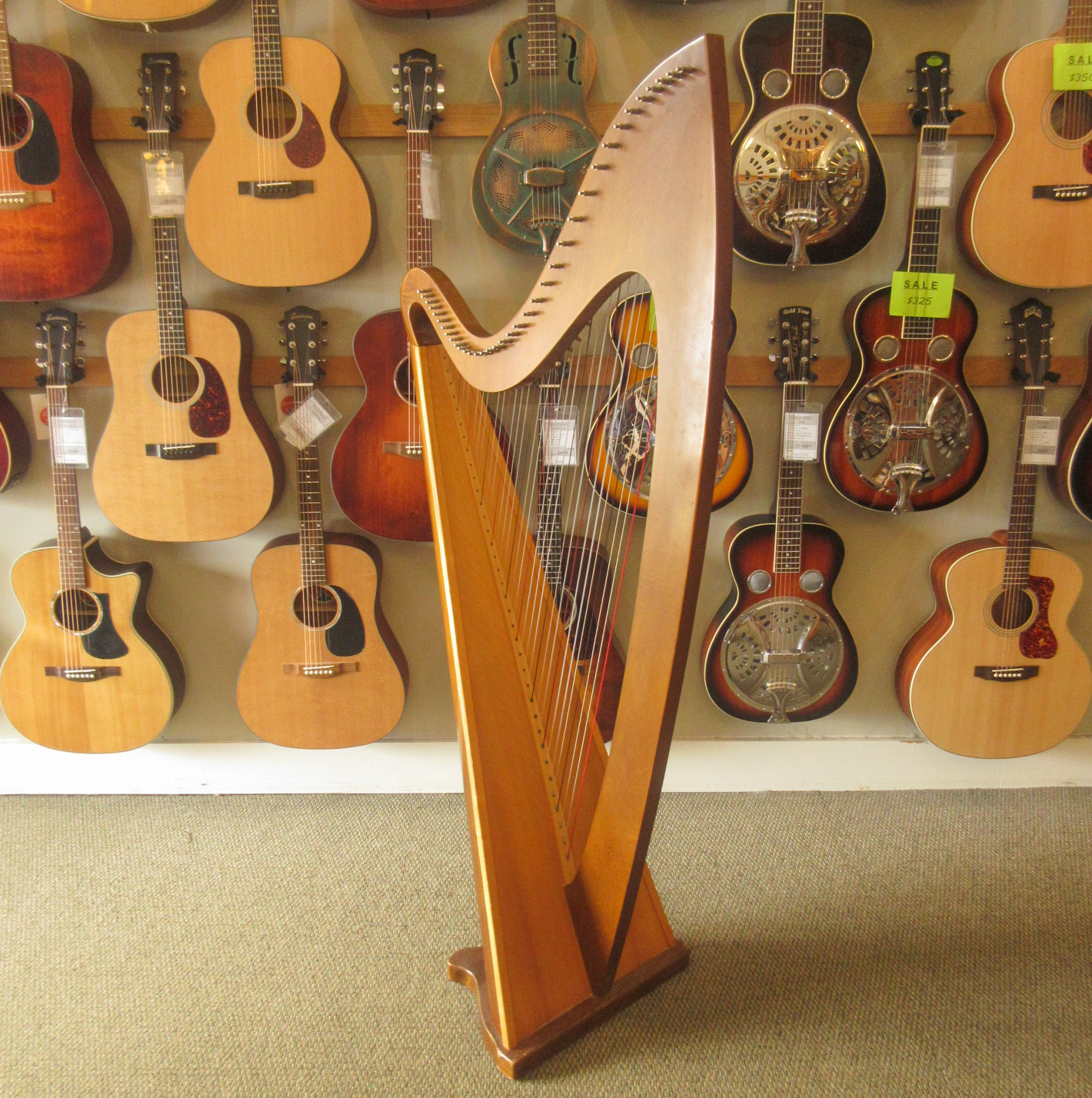 The Troubadour is a foundationstone of the Lyon and Healy lever harps, having been in circulation, with developing configurations since the mid 1960’s. Trobadour IV’s were made from 1992-2001. The Troubadour IV is a 36 string harp, tall with strong, expressive tone. The Troubadour is a pedal-tensioned harp, with strong response and spacing appropriate for the professional harpist wanting a lever harp in his or her stable of harps and for the beginner looking to launch a harp journey with an economical, yet properly expressive for any performing artist. We replaced all of the strings. There are some small dings along the edge of the body and at the bottom of the soundboard. The sound of this is amazing. It’s rich and penetrating, bold and beautiful! It is in very good condition and comes with a cover.