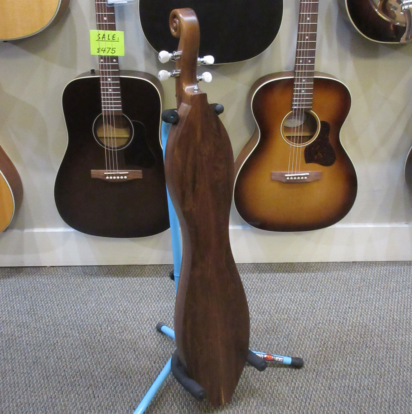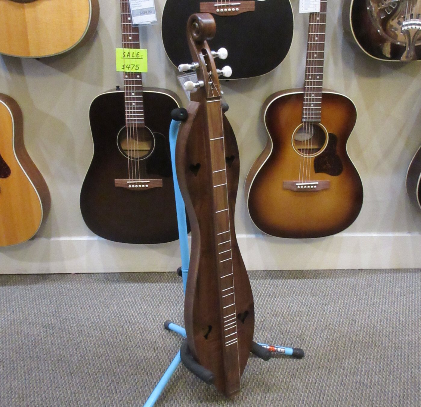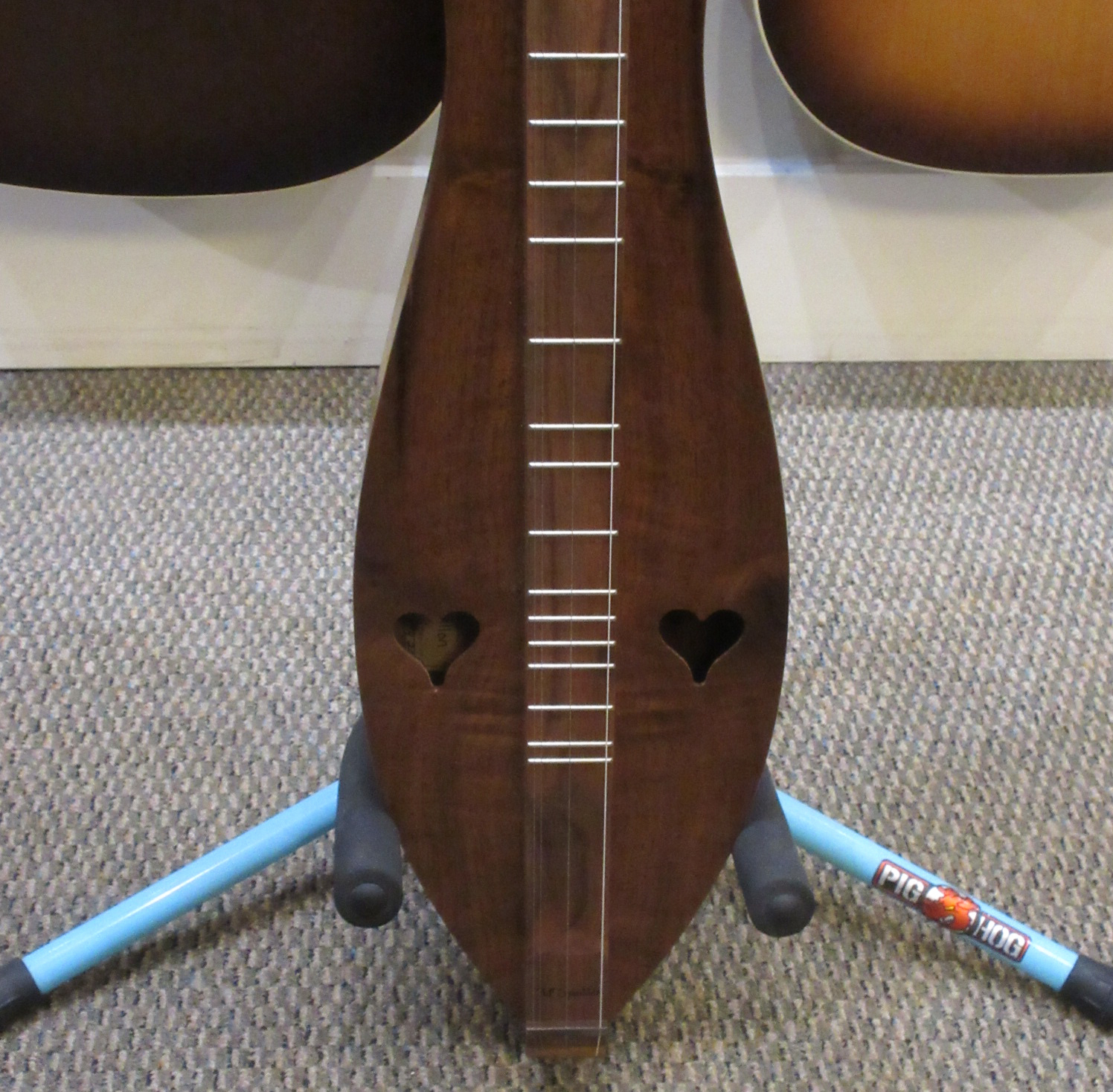 The dulcimer shown is an example of this model. These incredible handcrafted instruments are built with pride, one at a time. The natural wood retains the character making it unique and is part of the story that makes this heirloom dulcimer one of a kind. Each dulcimer is signed and numbered and comes with a gig bag.
