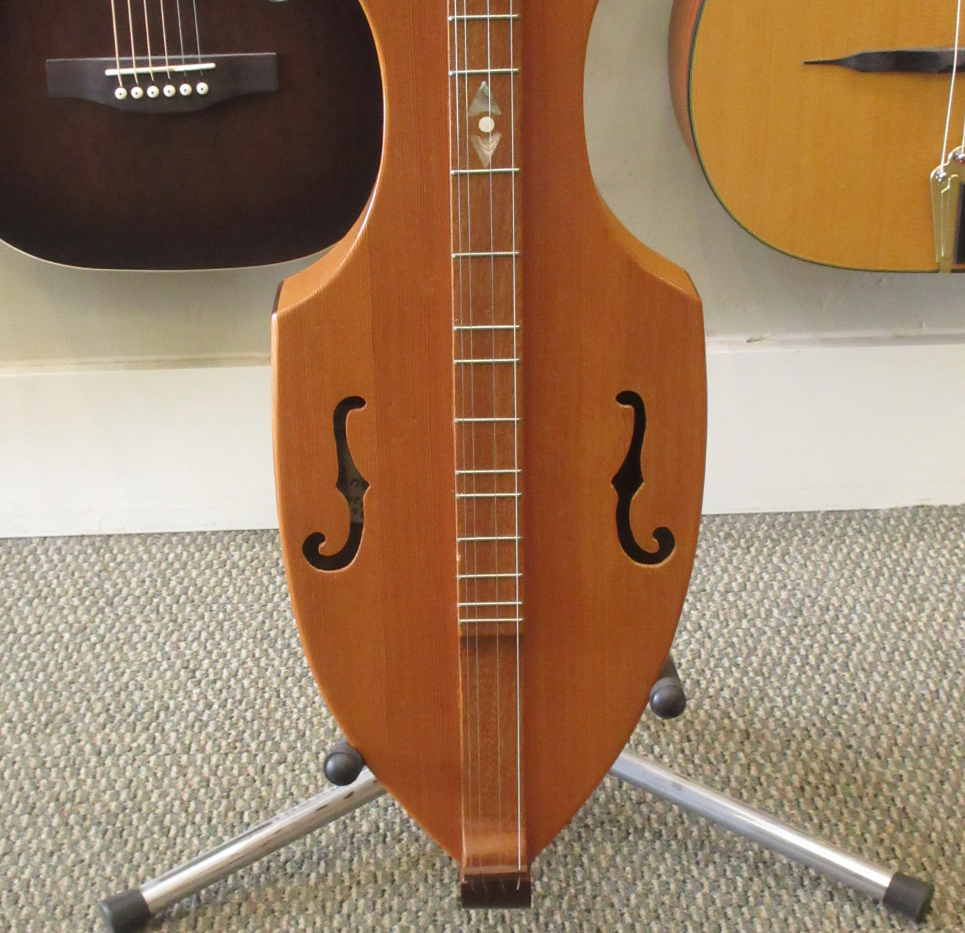 This unique mountain dulcimer has a HUGE voice. It is set up as a standard dulcimer, with DAA tuning, but has a 29 1/4″ scale length and a body that’s nearly 3″ deep, so it likely started it’s life a baritone and can certainly be strung that way again. We did a little setup to it and worked glue into an open seam. It plays easily and sounds great! It has some very light and normal wear, but nothing bad, just light scratches, tiny dings and some finish discoloration here and there. It is in very good condition and is all ready to play!