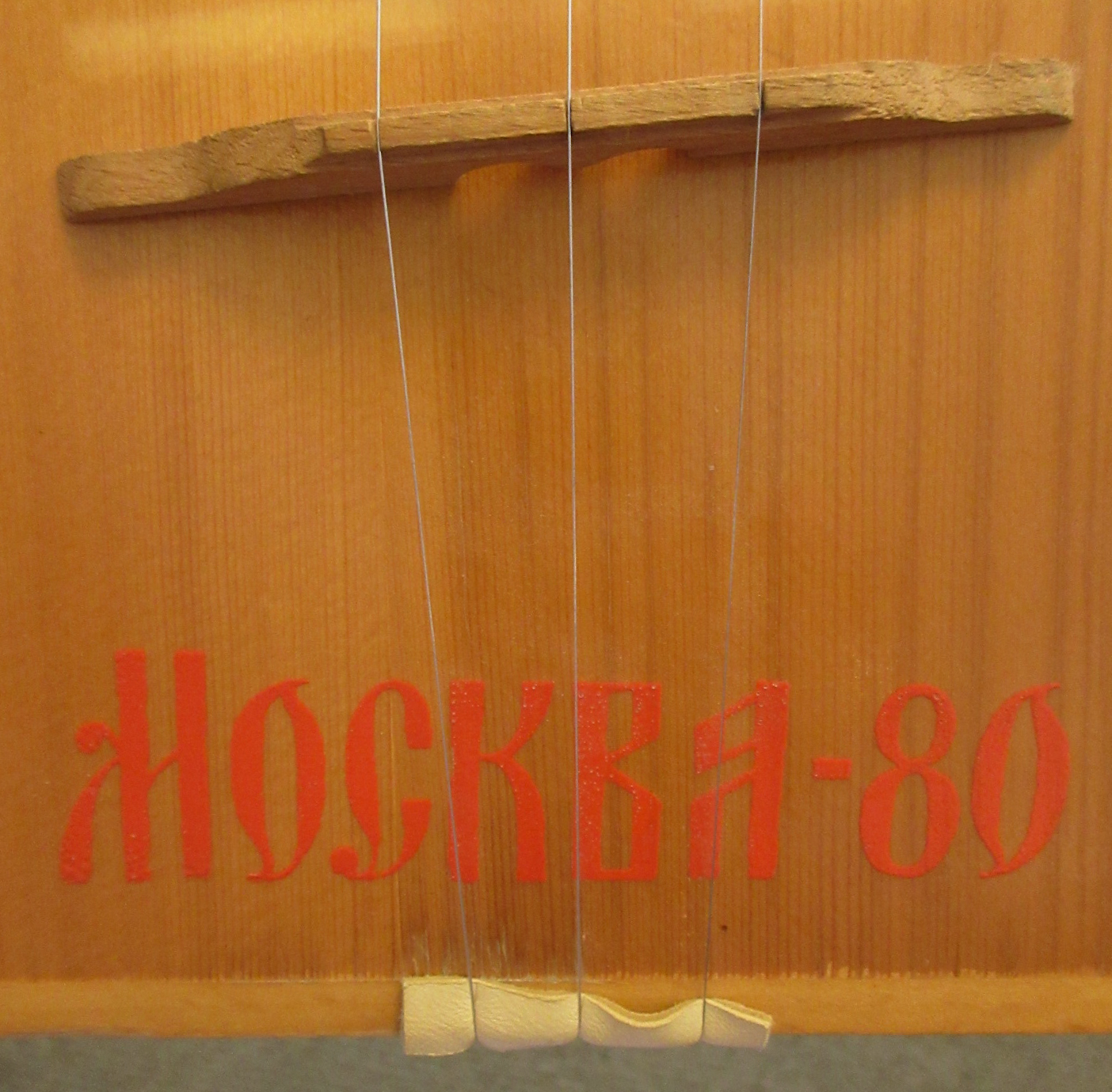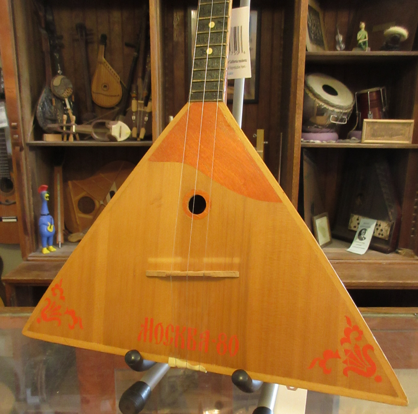 Step back in time to the 1980 Moscow Olympics. Since the balalaika is the most known Russian instrument, they made a bazillion of these for sale by street corner vendors during the event. We put new strings on and did some light set up to this, to get it ready for you. The instrument has some wear to it’s body, mostly on the back/sides. The top does have a few impressions and the bridge had been in the wrong place a long time, leaving a suntan mark. Other than that, it’s just light wear to it. There are 2 labels inside of it, but they are in Russian. The instrument plays easily and sounds surprisingly nice. In very good condition.