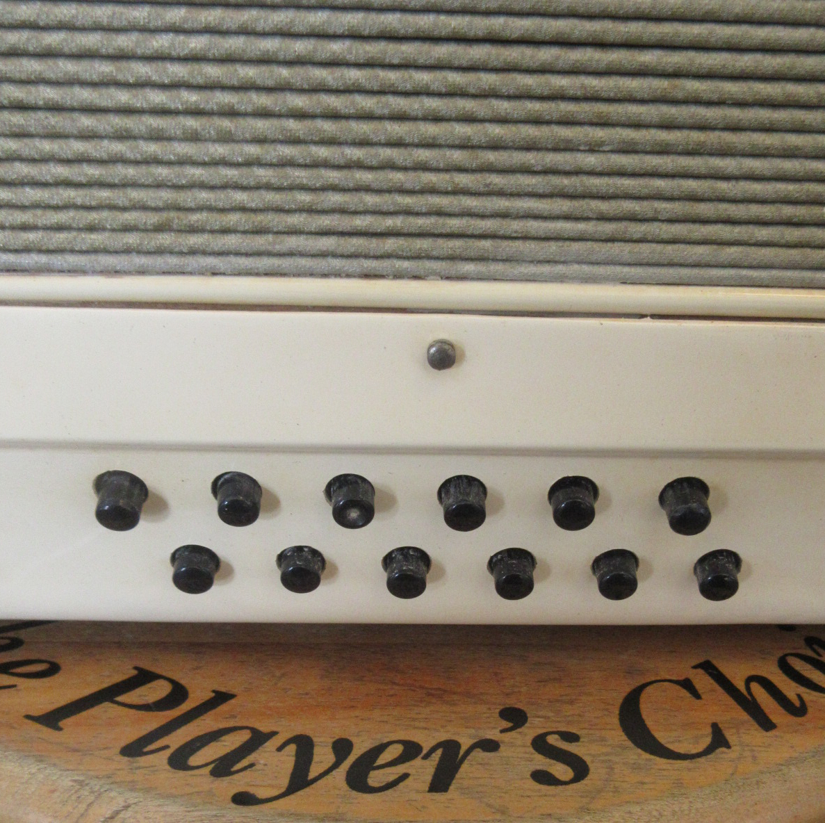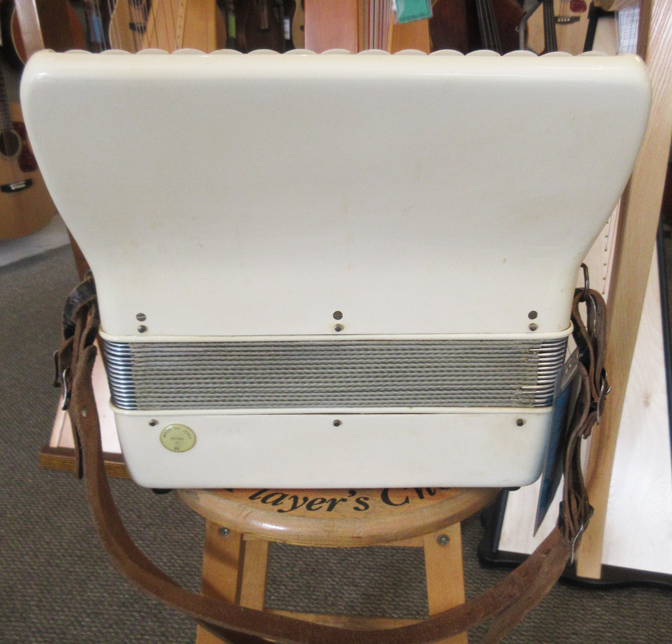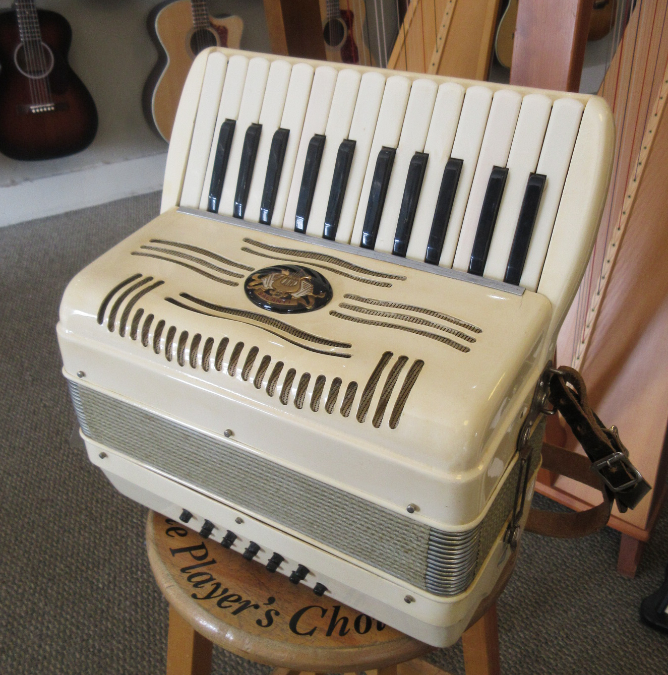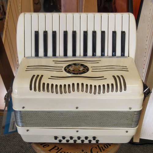 A great sounding and fun playing, smaller size accordion. This Italian made instrument has an 11-inch keyboard and 12 bass buttons. This will be great for someone with smaller hands, a new student or as a “travel” instrument. Our ace reed instrument tech has been through it and made any necessary adjustments, it’s all ready to take home and play! The instrument shows light aging. There is discoloration and 2 small cracks on the plastic covering, tarnish on the metal bits, things like that. Overall, this quality instrument is in very good condition. It comes with a hard case too!