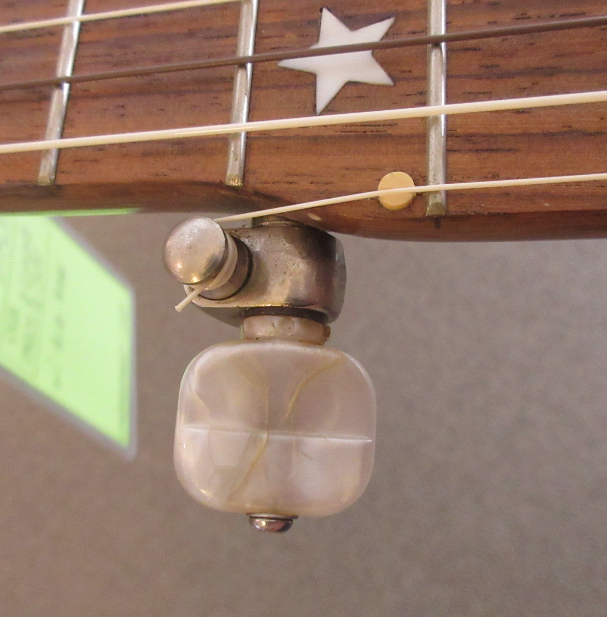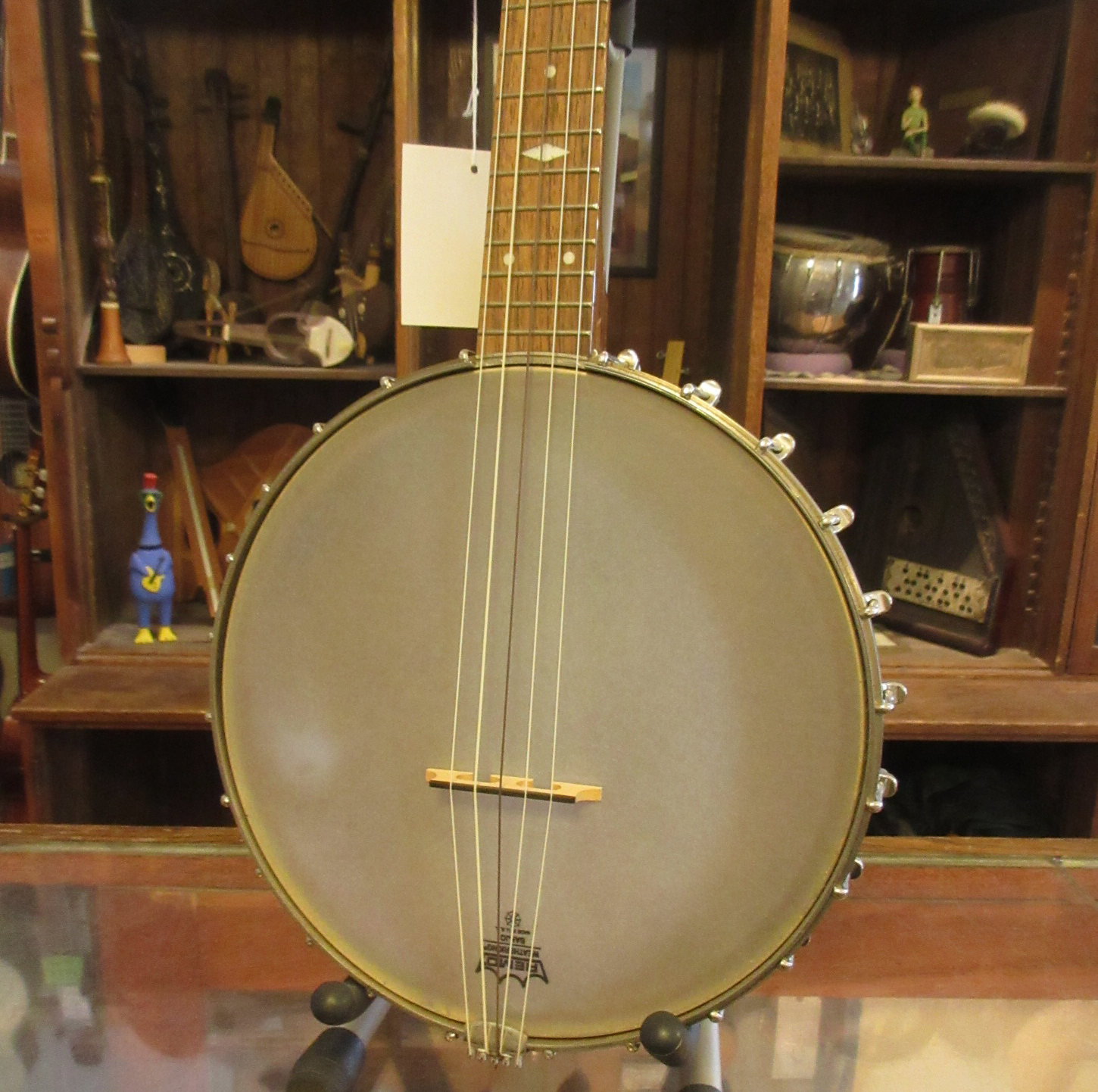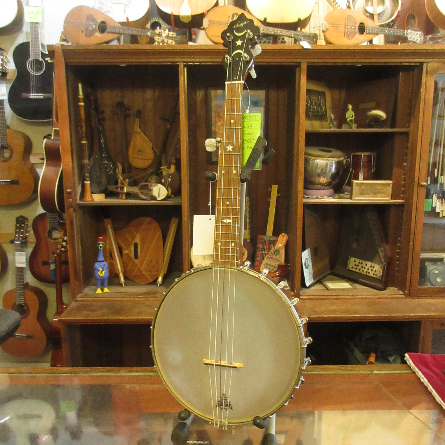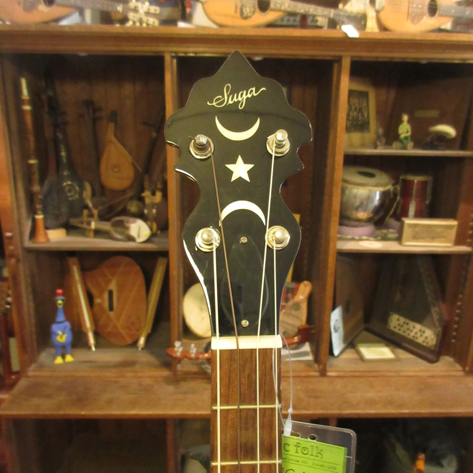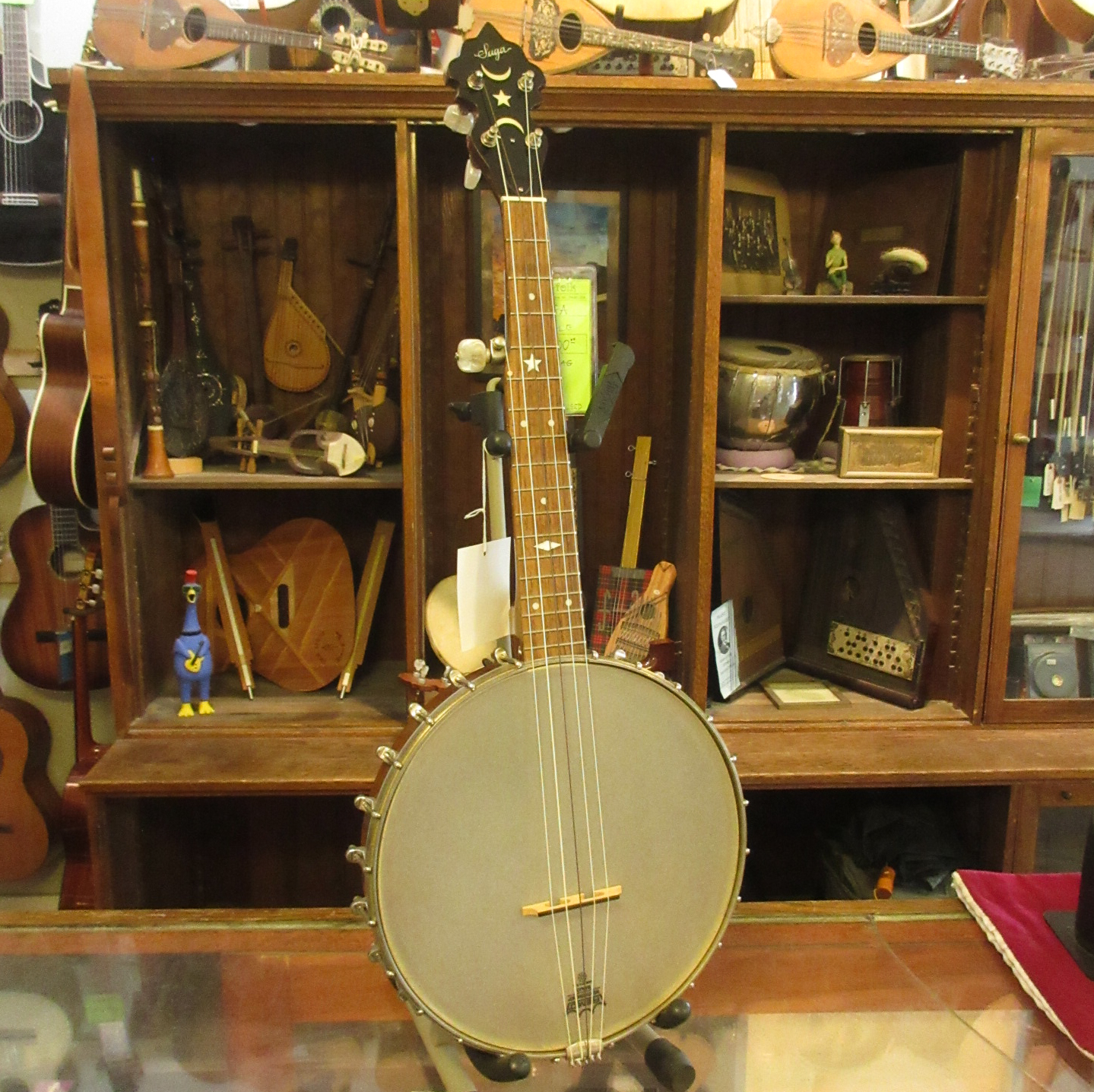 This is an amazingly cool a-scale banjo! The headstock says Suga on it, but everything on it looks like it was made by Saga, who’s logo is almost identical. Tuned aEAC#E, a step higher than a typical 5-string. It’s great for playing old-time fiddle tunes in the key of A!!! No capo! The banjo has a lively tone and is a lot of fun to play. There is normal wear to it, some tarnished metal parts and the 5-th string tuner button has been repaired. This instrument is in very good condition and comes with a gig bag.