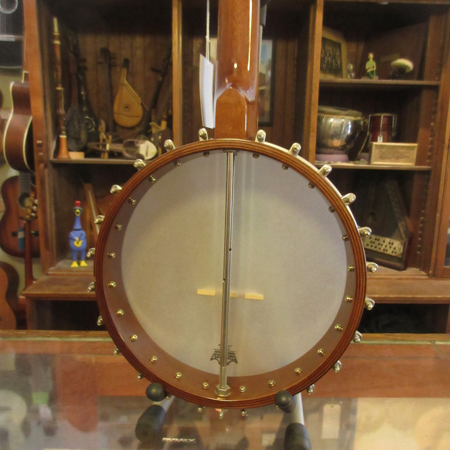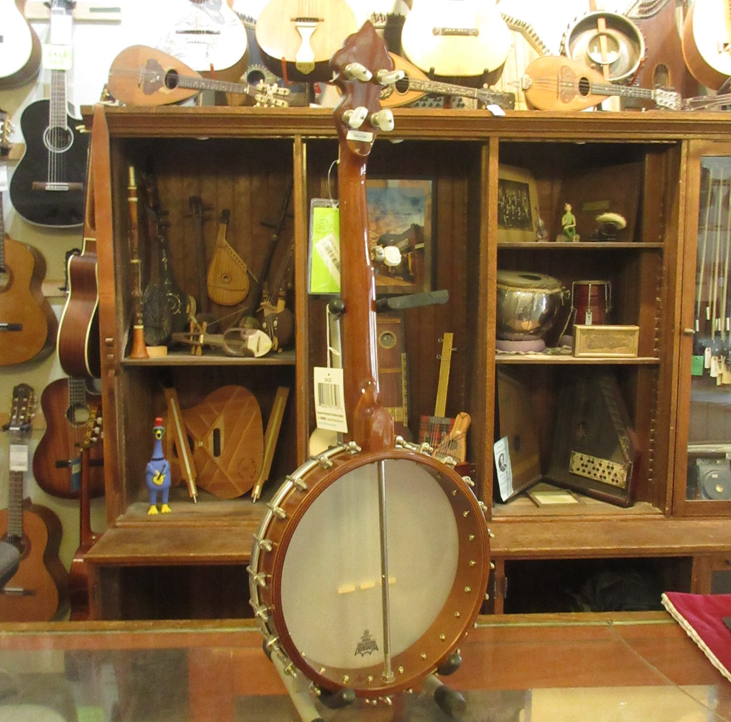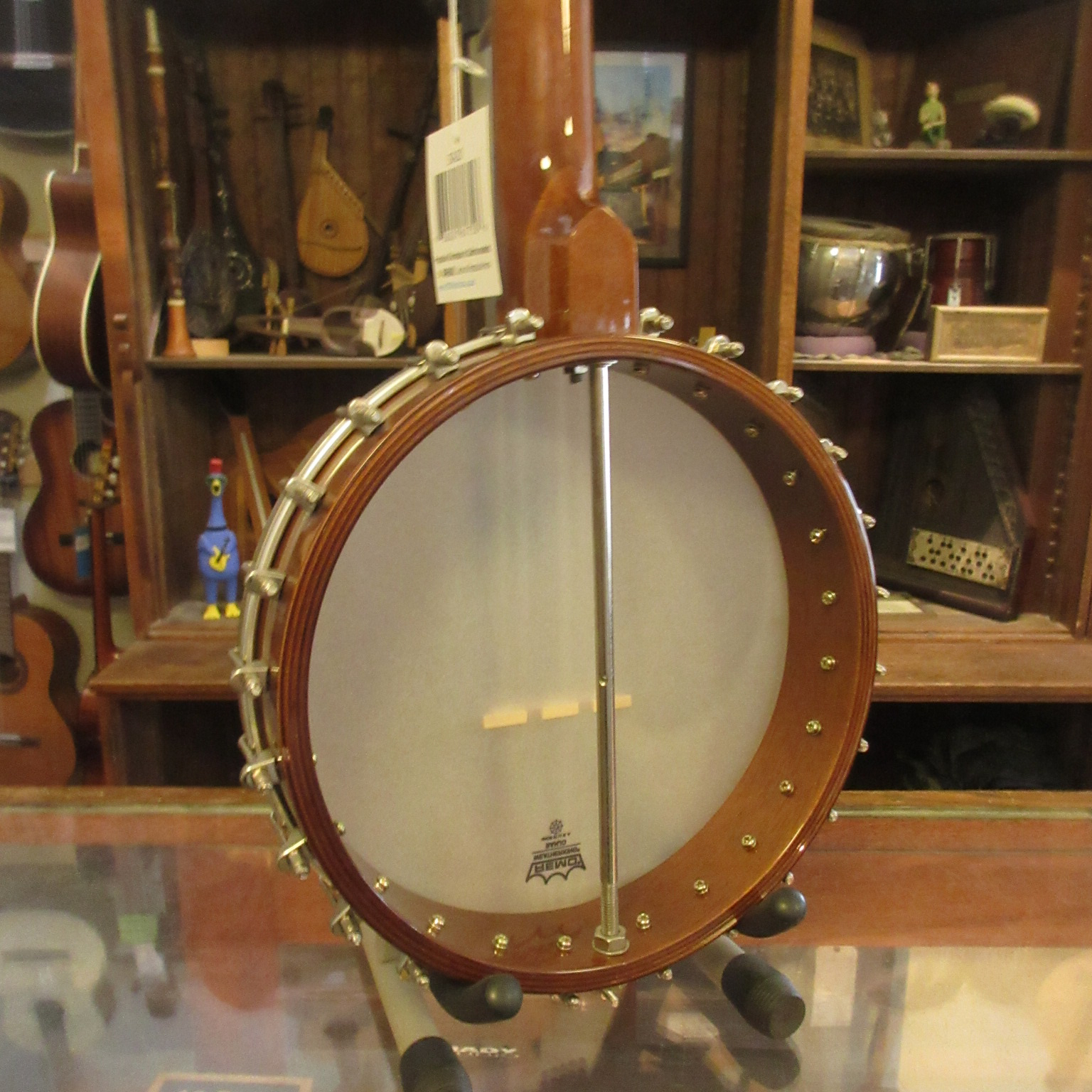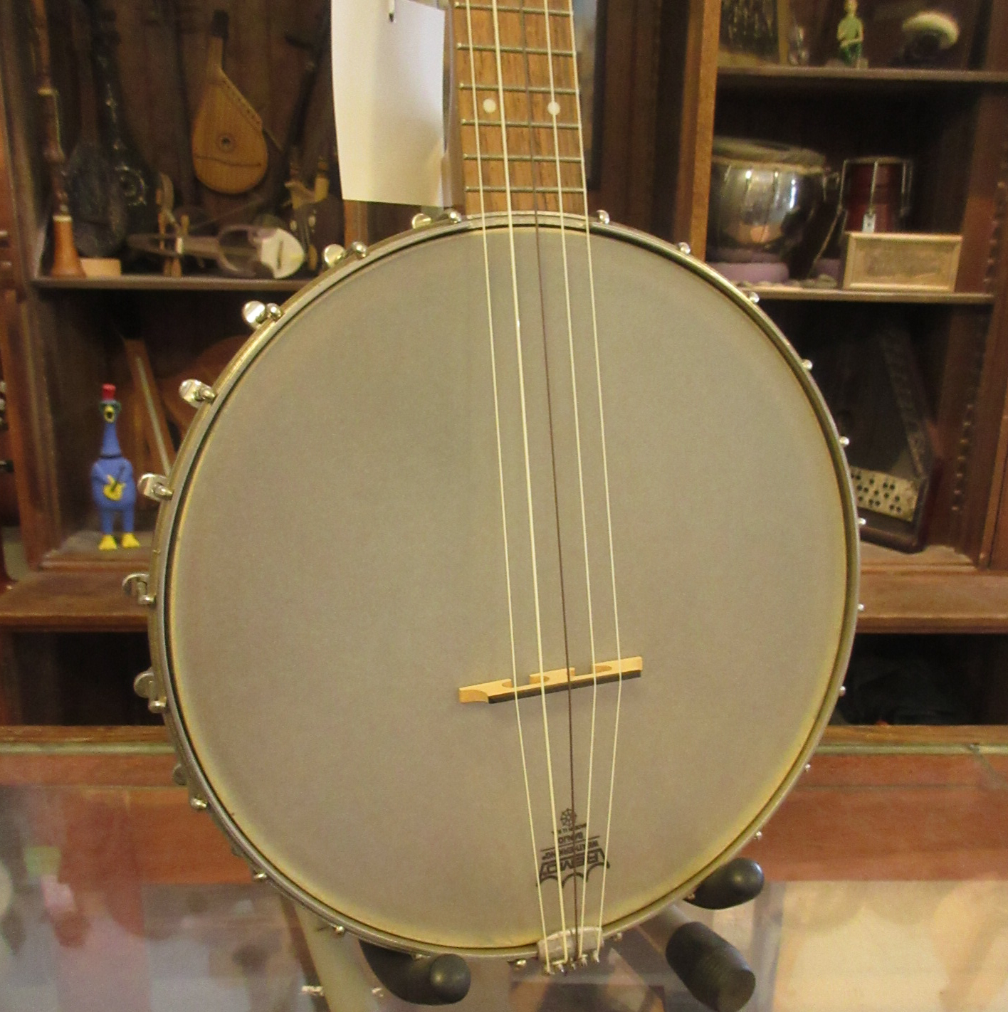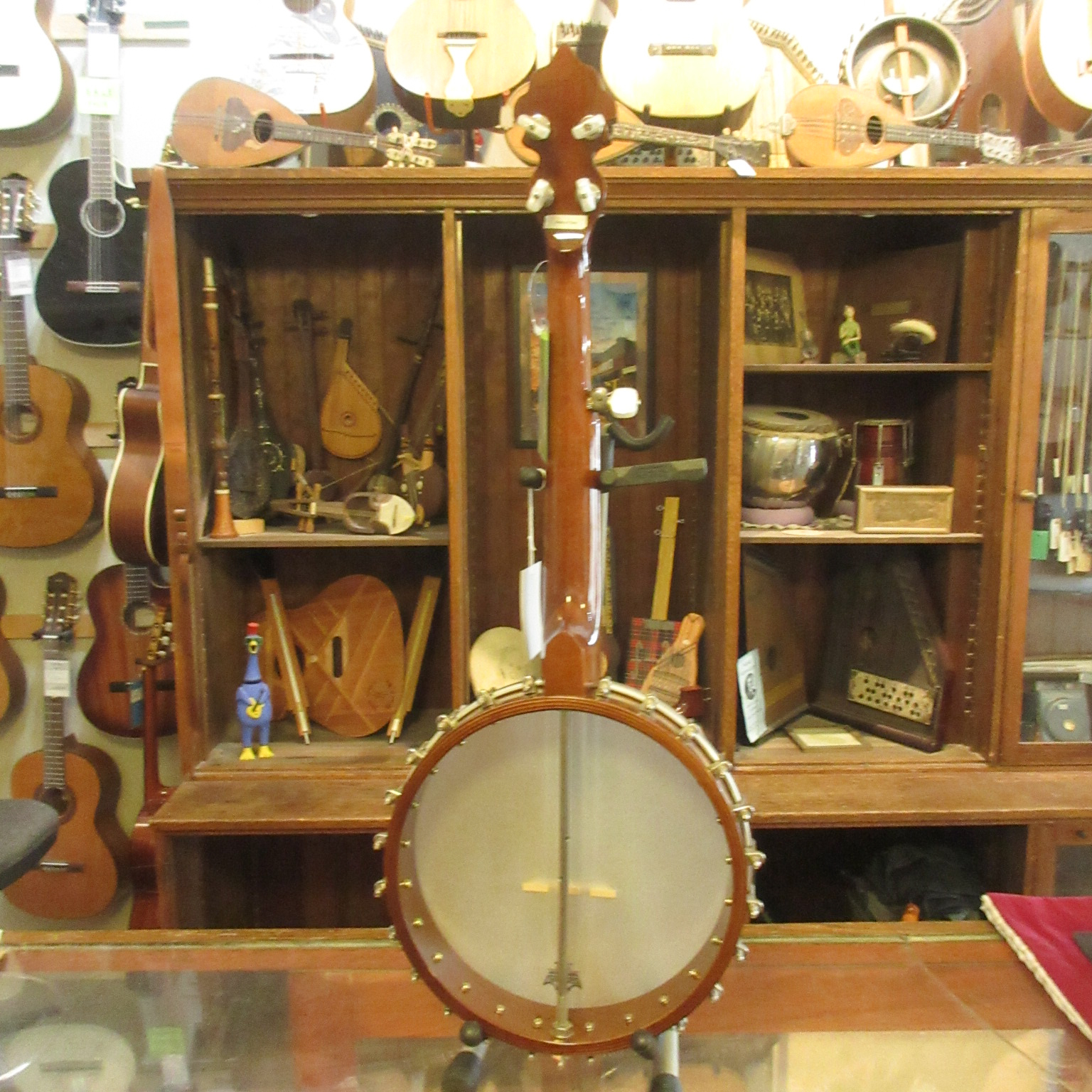 This is an amazingly cool a-scale banjo! The headstock says Suga on it, but everything on it looks like it was made by Saga, who’s logo is almost identical. Tuned aEAC#E, a step higher than a typical 5-string. It’s great for playing old-time fiddle tunes in the key of A!!! No capo! The banjo has a lively tone and is a lot of fun to play. There is normal wear to it, some tarnished metal parts and the 5-th string tuner button has been repaired. This instrument is in very good condition and comes with a gig bag.