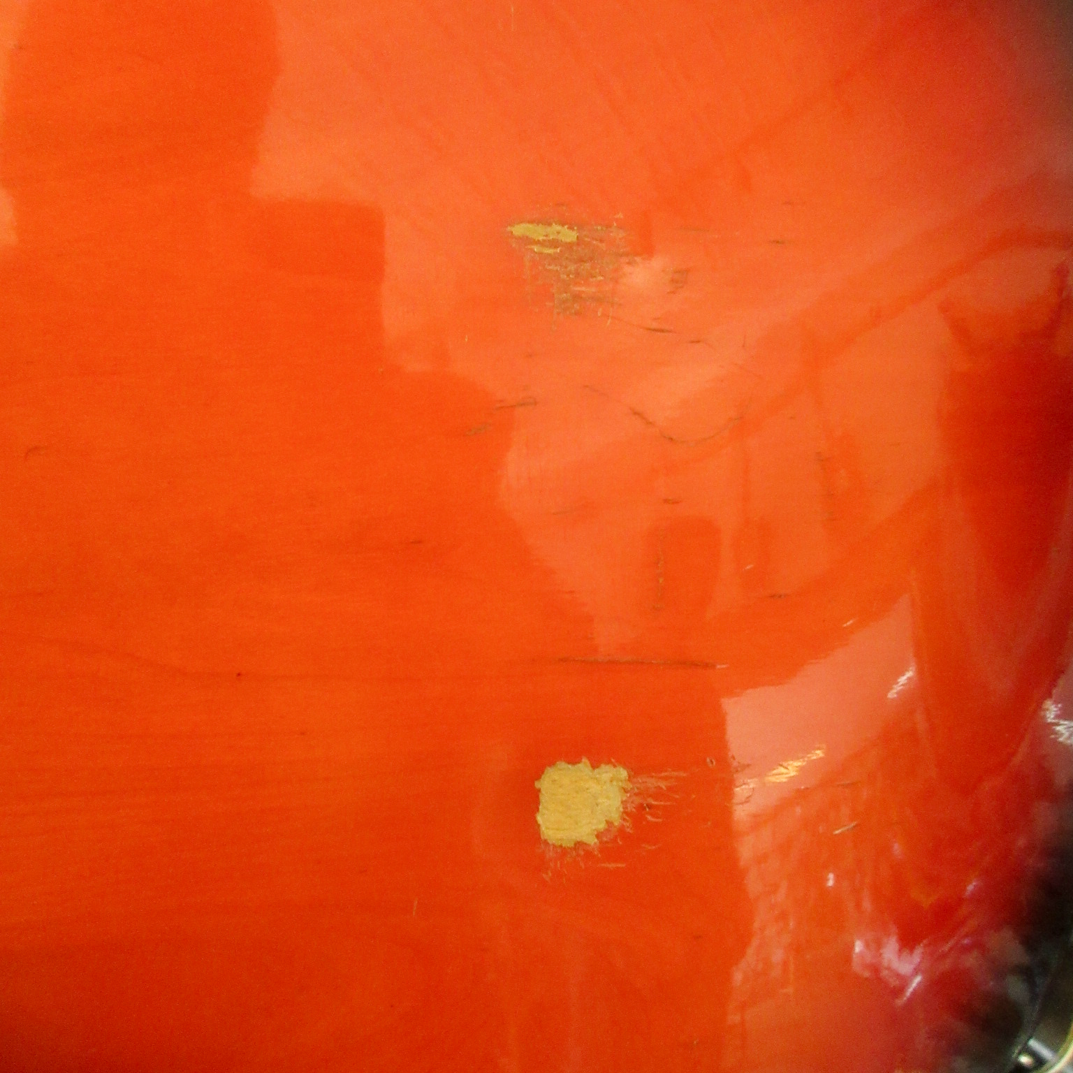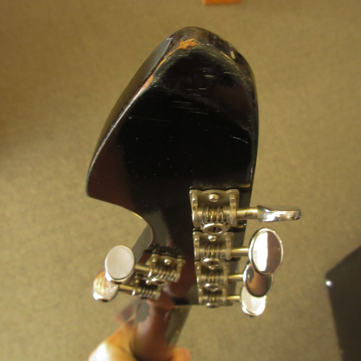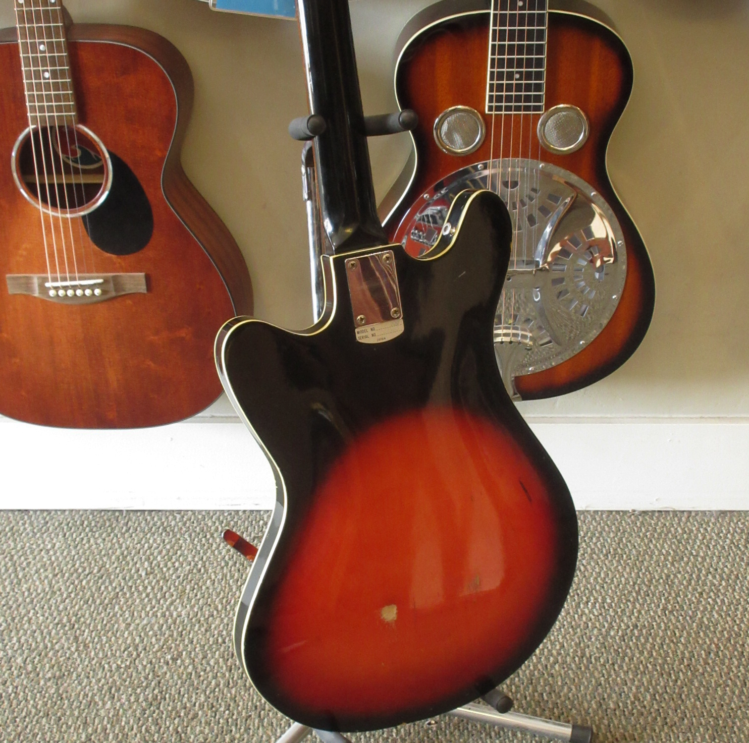 Here, we have a super cool Teisco EP-200, made in Japan in the 1960’s. The guitar seems all original, but is missing the pickguard. The guitar has some finish dings and chips (the worst are in the photos), but nothing serious. The white/cream tuner post hole covers/bushings have cracks, but this is just cosmetic. The electronics all work well, note-the tone knob works backwards, it’s all original wiring, just how it is. The pickguard around the controls has a screw crack. The frets are in fine shape, just keep in mind that these are low shaped frets, thus it’s not going to be like bending strings with jumbo frets. Each pickup has it’s own on/off switch and there is a rhythm/solo switch, which gives you 2 different output levels (solo is louder). The guitar plays well and sounds pretty nice. The instrument is in very good condition overall and it comes with a non-original gig bag.