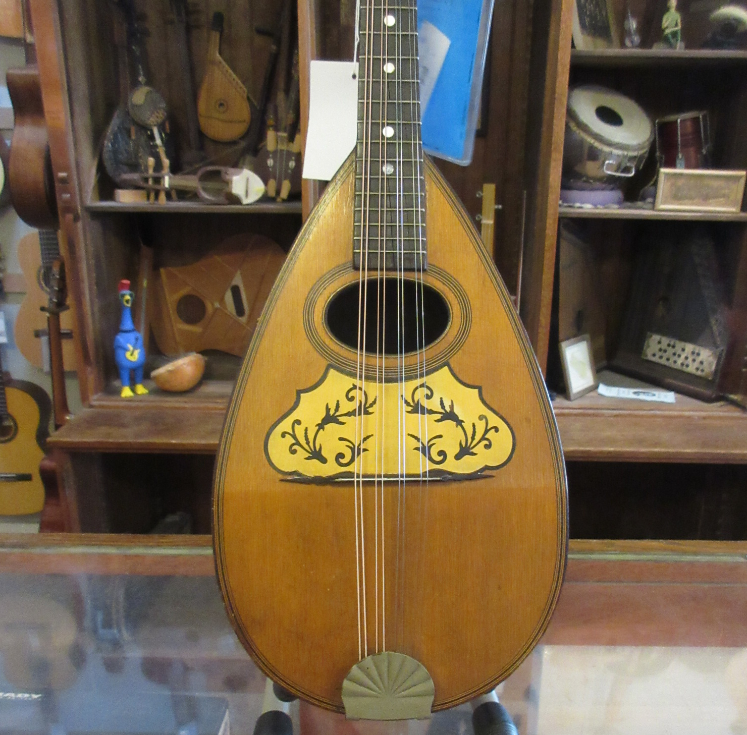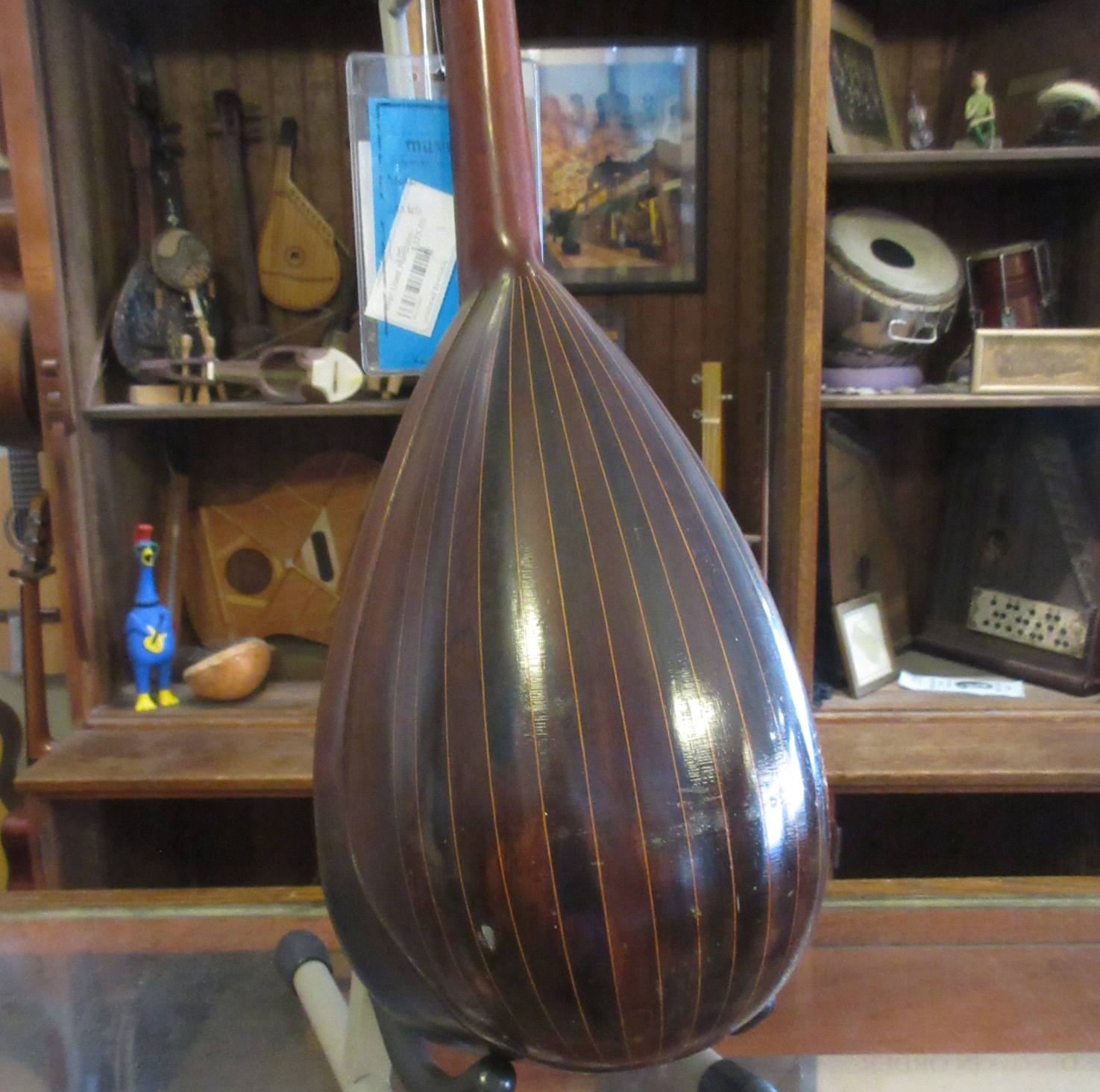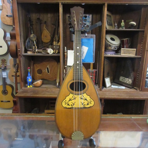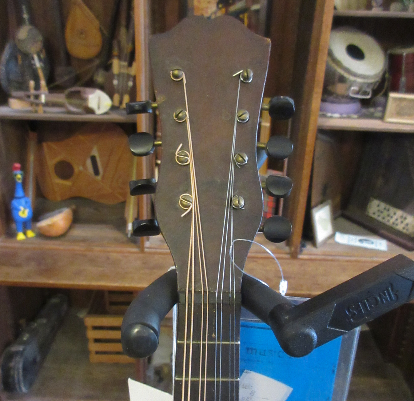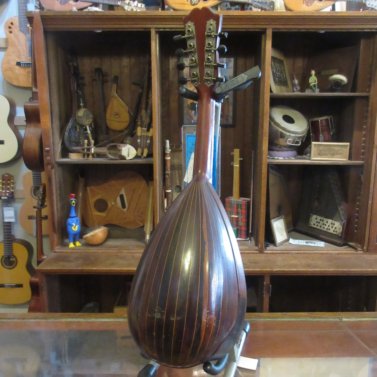 A really nice bowlback mandolin. It has no maker’s marks on it, but we can safely assume that it was made in the early part of last century. The mandolin sounds lovely and plays easily. We removed the fingerboard and planed the neck and did some other setup to it getting it ready, including putting on fresh strings. The mandolin is in great shape with mostly light wear some finish checking and some marking on the rosewood ribs. The ebony fingerboard has typical splits, which don’t affect how it plays. This instrument is in very good condition. A nice, classic piece! No case.