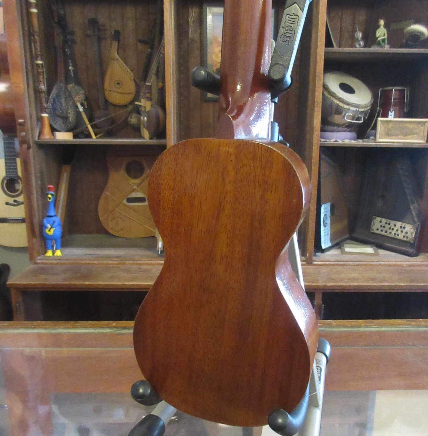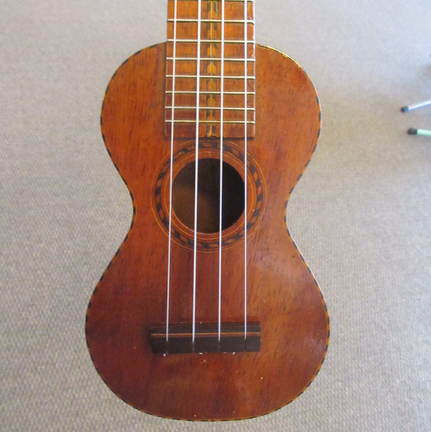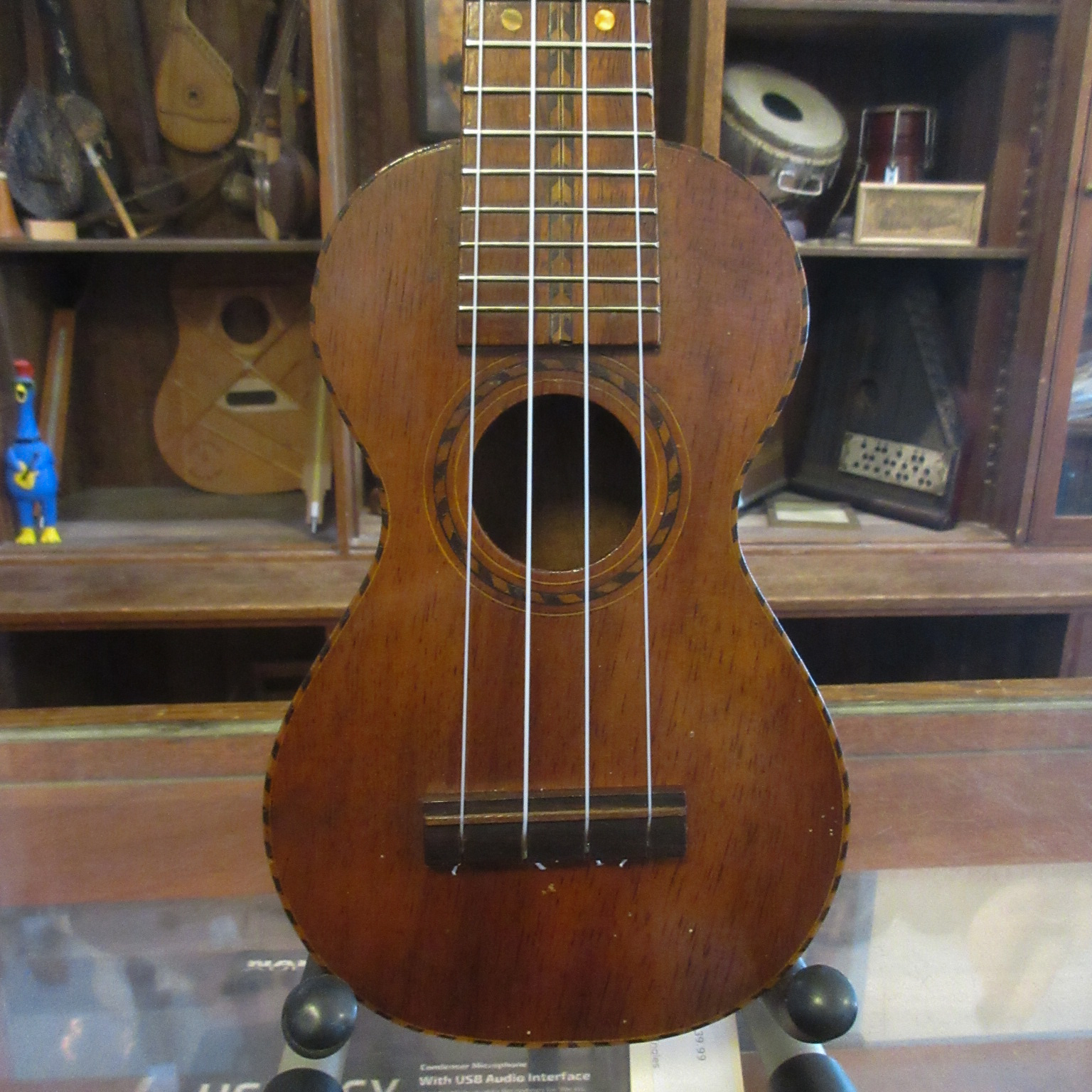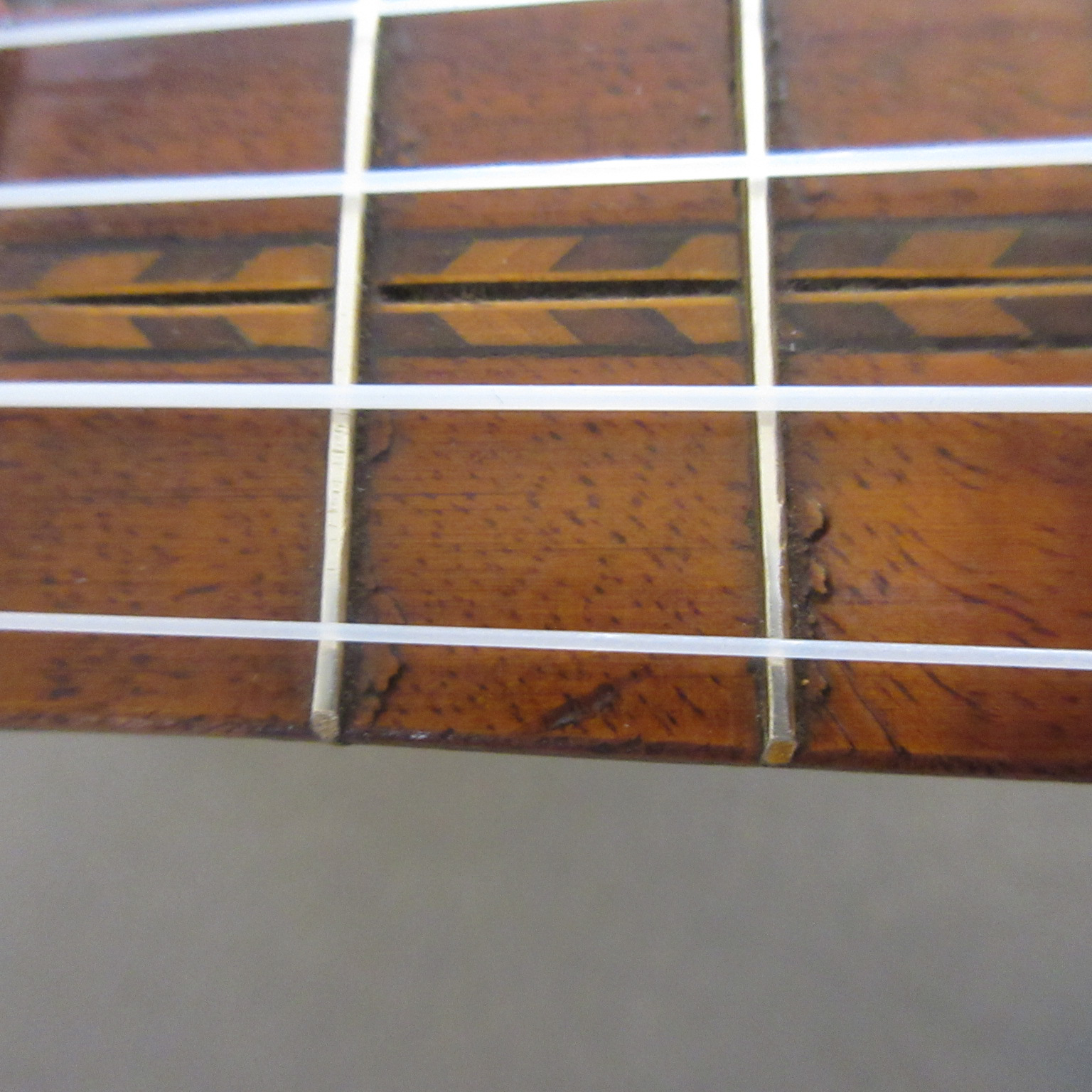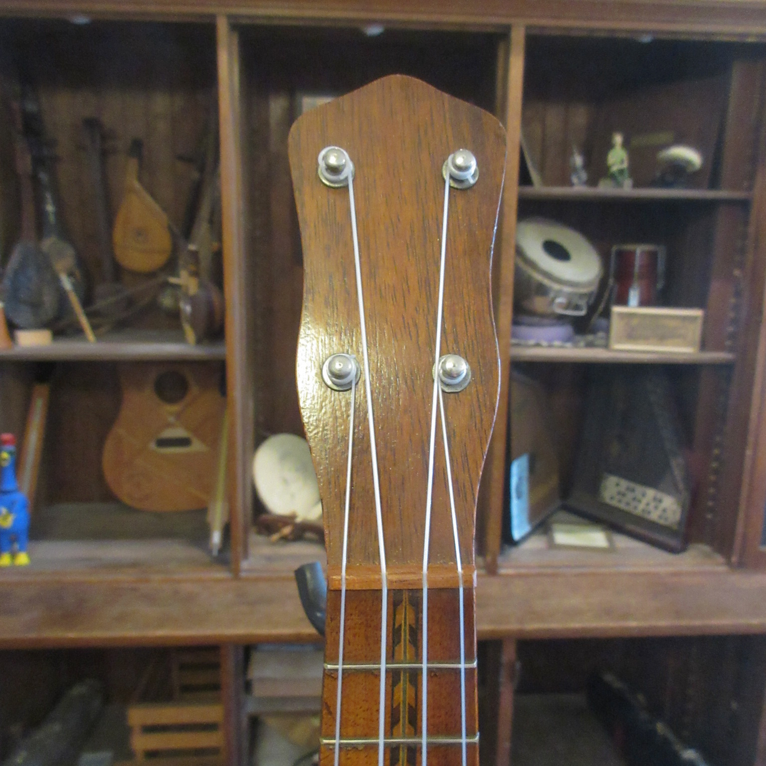 What a wonderful little uke! All solid woods, with rope binding and inlaid fretboard. The neck is mahogany and the top, back, sides and fretboard are all koa. Since it’s unlabeled, we can’t say for sure where, when or by who it was made. The neck being mahogany is a clue that says that it might have been made stateside instead of Hawaii. We dressed the frets, did a little setup work to it and put on new Aquila strings. This instrument plays easily and has a lovely tone. Very pleasing to play! The fingerboard inlay is slightly split in the center, which doesn’t affect play. By the 2nd and 3rd frets, there is some material next to the frets, which has laquer over it, just like the rest of the fingerboard, which doesn’t affect play. There is a scratch on the back that looks like a crack, but isn’t. One of the tuner heads has a slight crack to it. Glue has been worked into it. It and the other 3 tuners all hold tune well. Other than that, it’s just faint play wear. It is in very good condition and comes with it’s original tan colored trapdoor chip case.