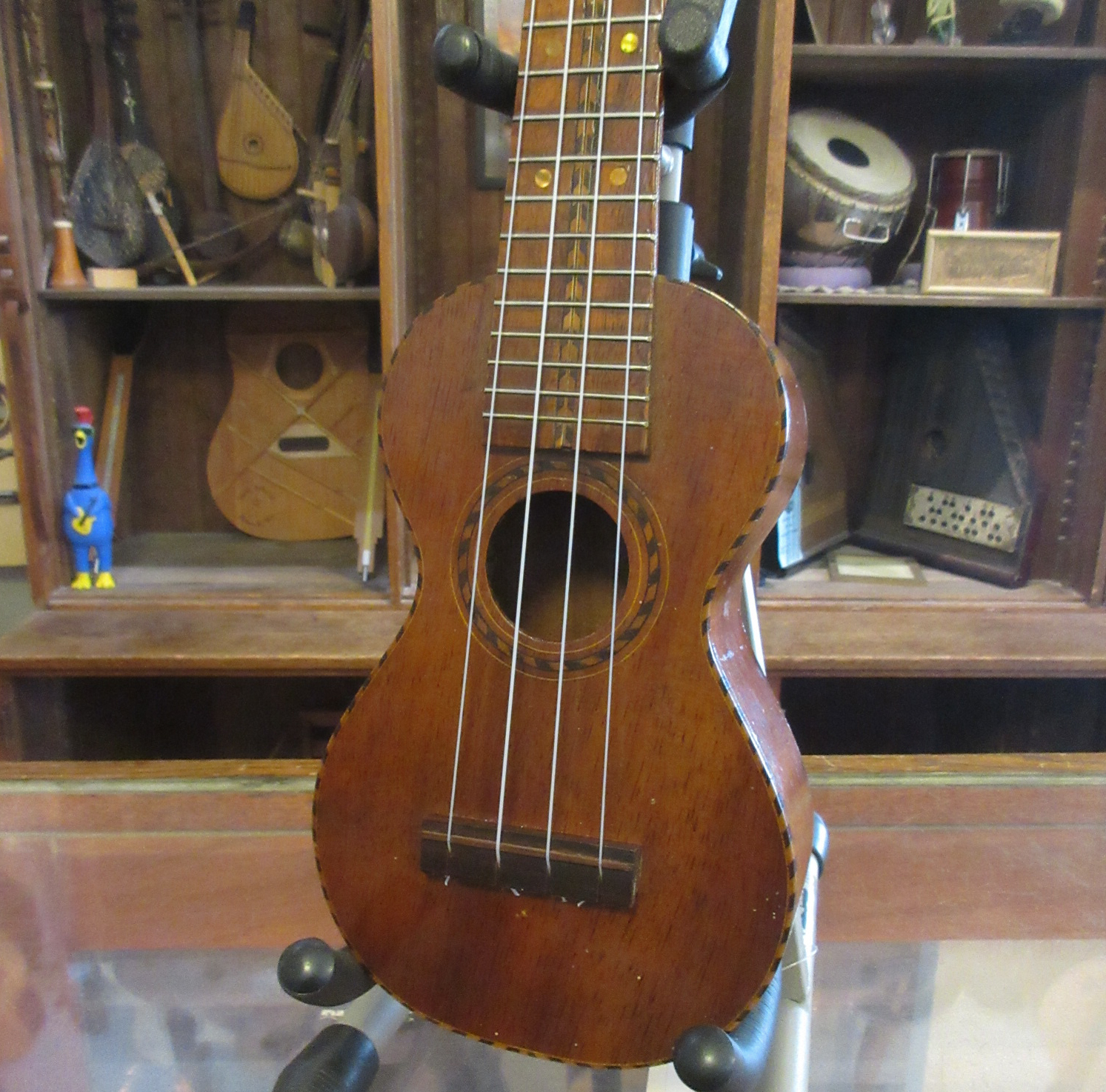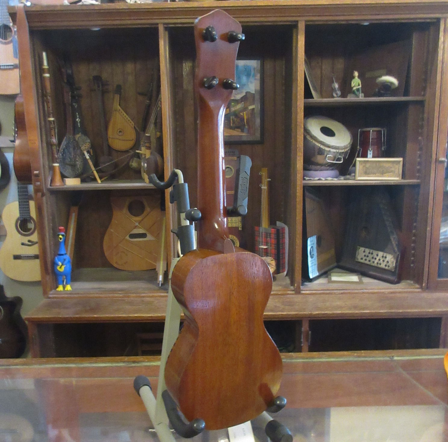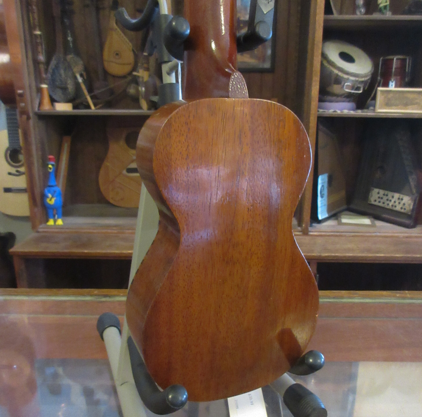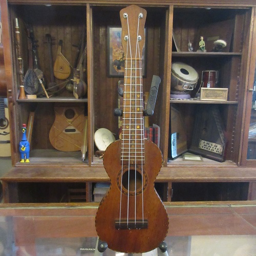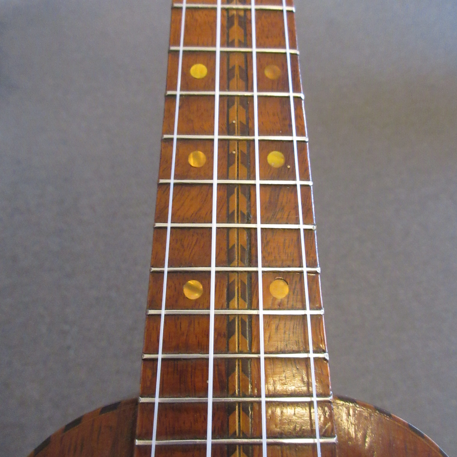 What a wonderful little uke! All solid woods, with rope binding and inlaid fretboard. The neck is mahogany and the top, back, sides and fretboard are all koa. Since it’s unlabeled, we can’t say for sure where, when or by who it was made. The neck being mahogany is a clue that says that it might have been made stateside instead of Hawaii. We dressed the frets, did a little setup work to it and put on new Aquila strings. This instrument plays easily and has a lovely tone. Very pleasing to play! The fingerboard inlay is slightly split in the center, which doesn’t affect play. By the 2nd and 3rd frets, there is some material next to the frets, which has laquer over it, just like the rest of the fingerboard, which doesn’t affect play. There is a scratch on the back that looks like a crack, but isn’t. One of the tuner heads has a slight crack to it. Glue has been worked into it. It and the other 3 tuners all hold tune well. Other than that, it’s just faint play wear. It is in very good condition and comes with it’s original tan colored trapdoor chip case.