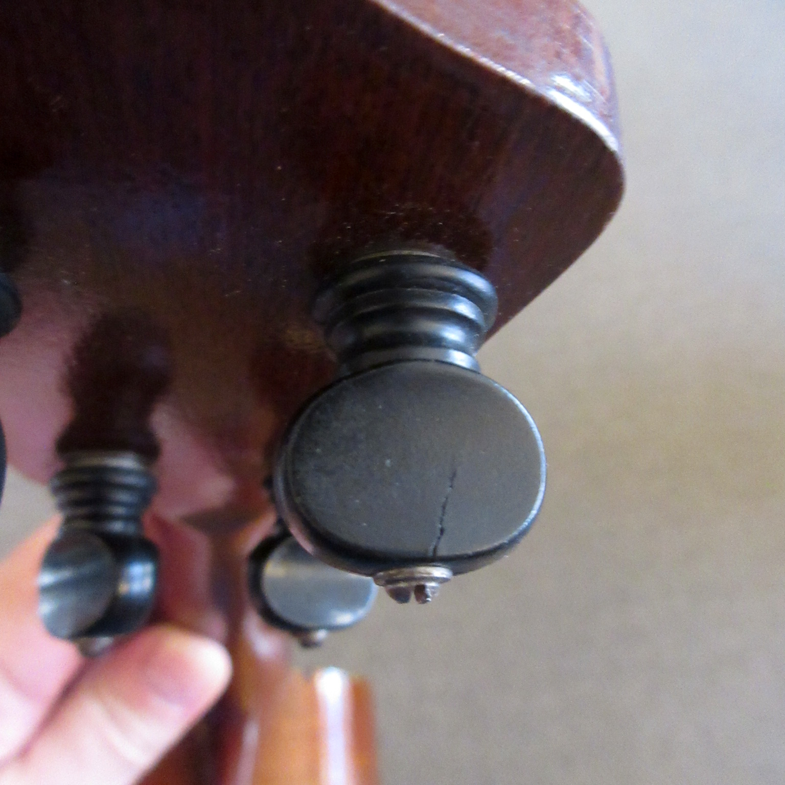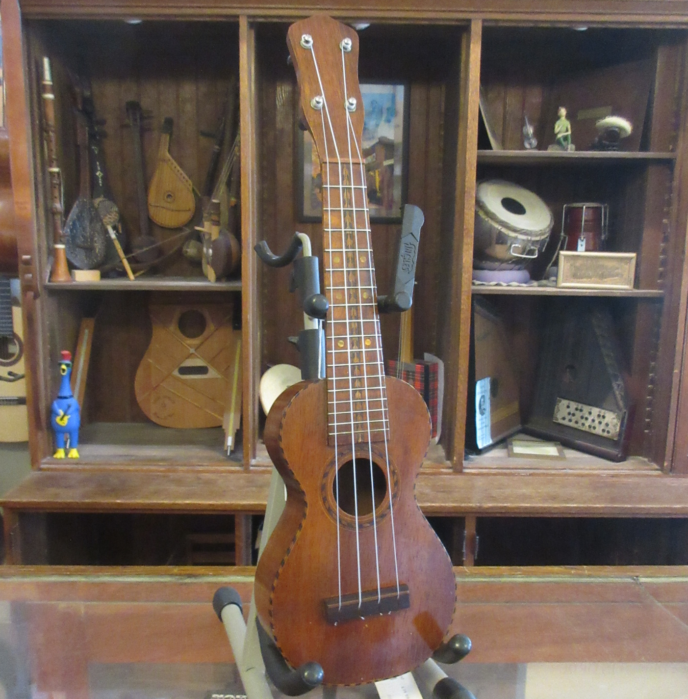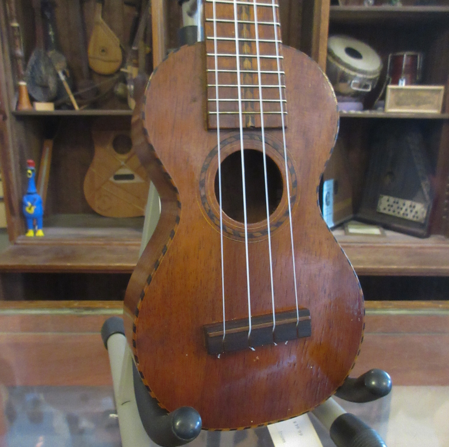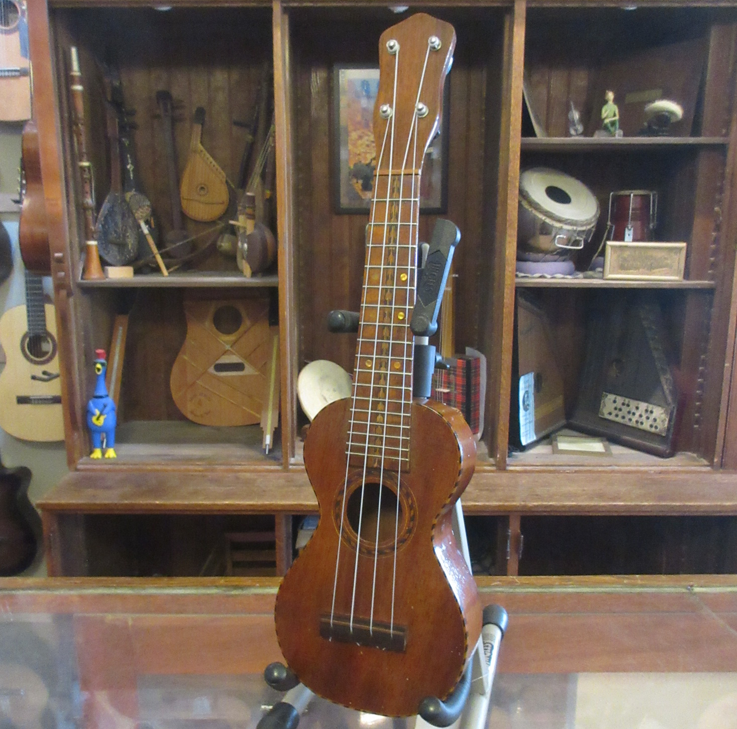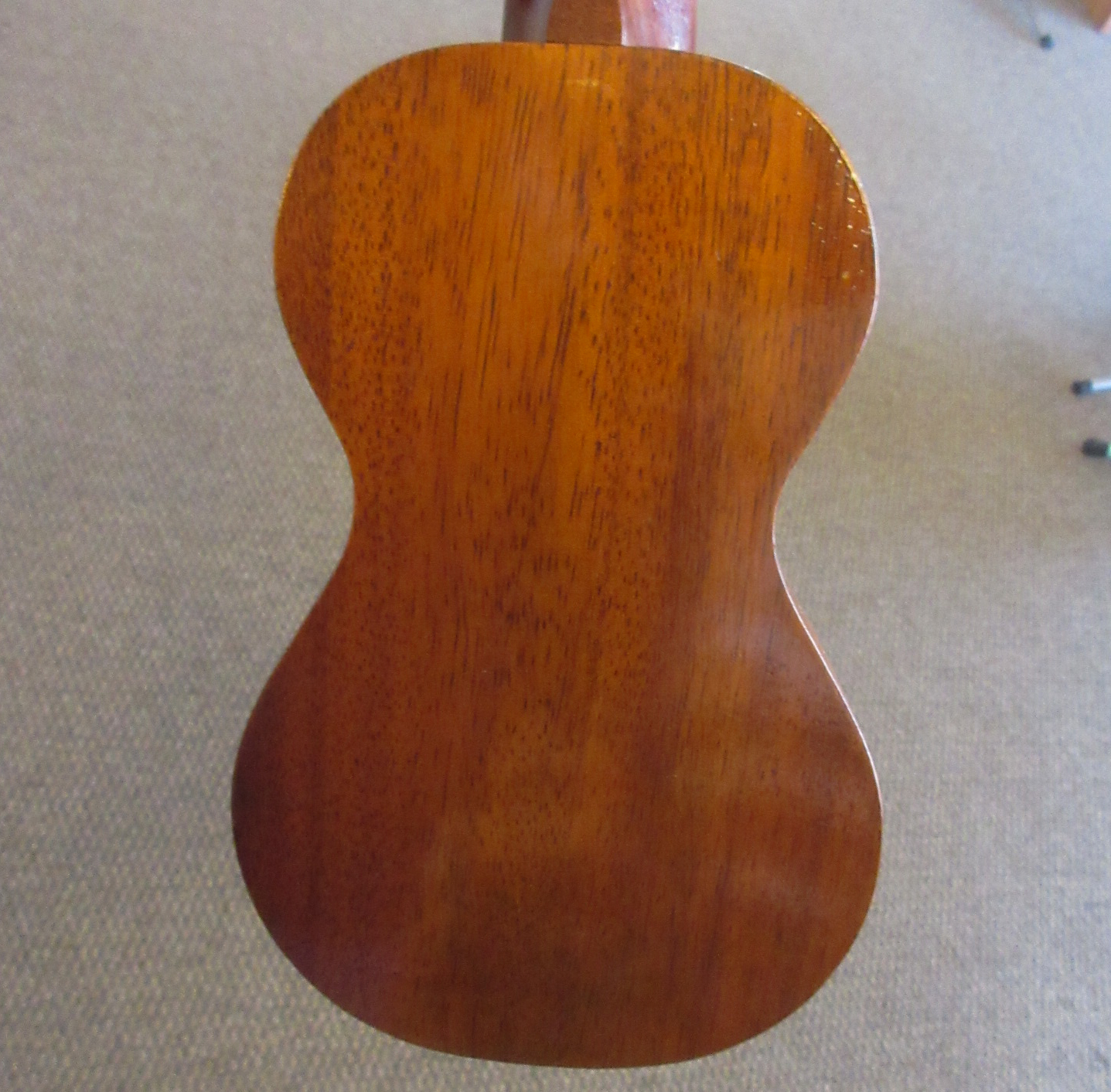 What a wonderful little uke! All solid woods, with rope binding and inlaid fretboard. The neck is mahogany and the top, back, sides and fretboard are all koa. Since it’s unlabeled, we can’t say for sure where, when or by who it was made. The neck being mahogany is a clue that says that it might have been made stateside instead of Hawaii. We dressed the frets, did a little setup work to it and put on new Aquila strings. This instrument plays easily and has a lovely tone. Very pleasing to play! The fingerboard inlay is slightly split in the center, which doesn’t affect play. By the 2nd and 3rd frets, there is some material next to the frets, which has laquer over it, just like the rest of the fingerboard, which doesn’t affect play. There is a scratch on the back that looks like a crack, but isn’t. One of the tuner heads has a slight crack to it. Glue has been worked into it. It and the other 3 tuners all hold tune well. Other than that, it’s just faint play wear. It is in very good condition and comes with it’s original tan colored trapdoor chip case.