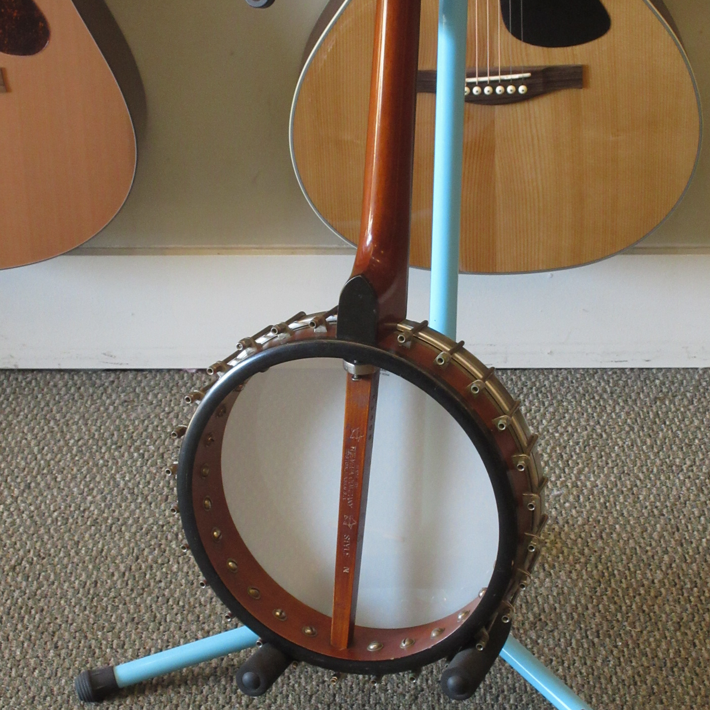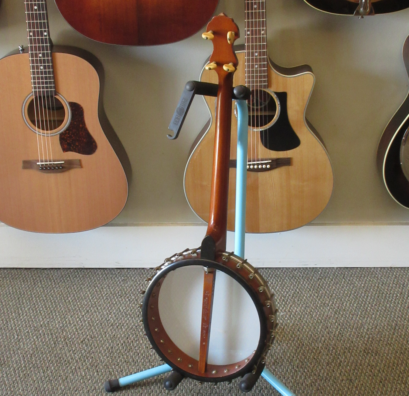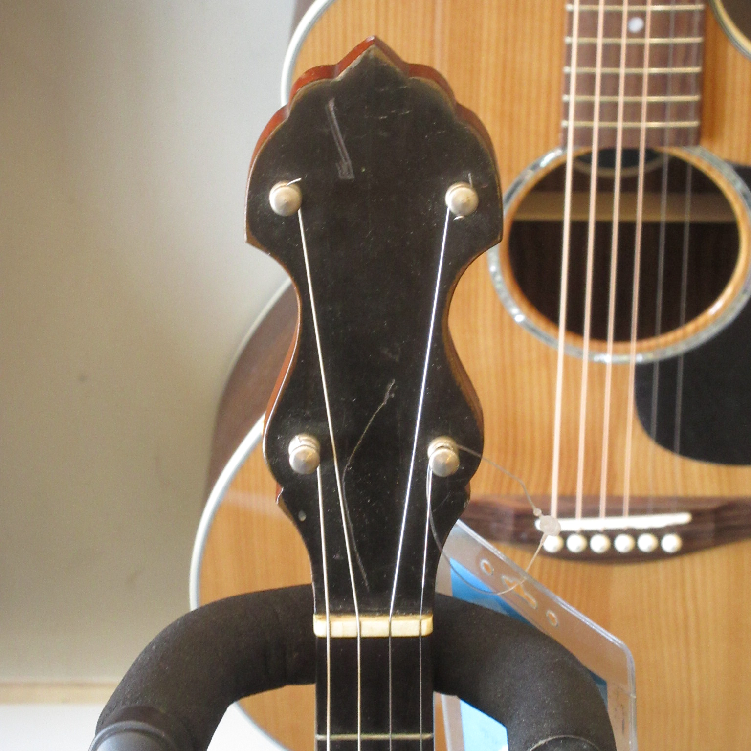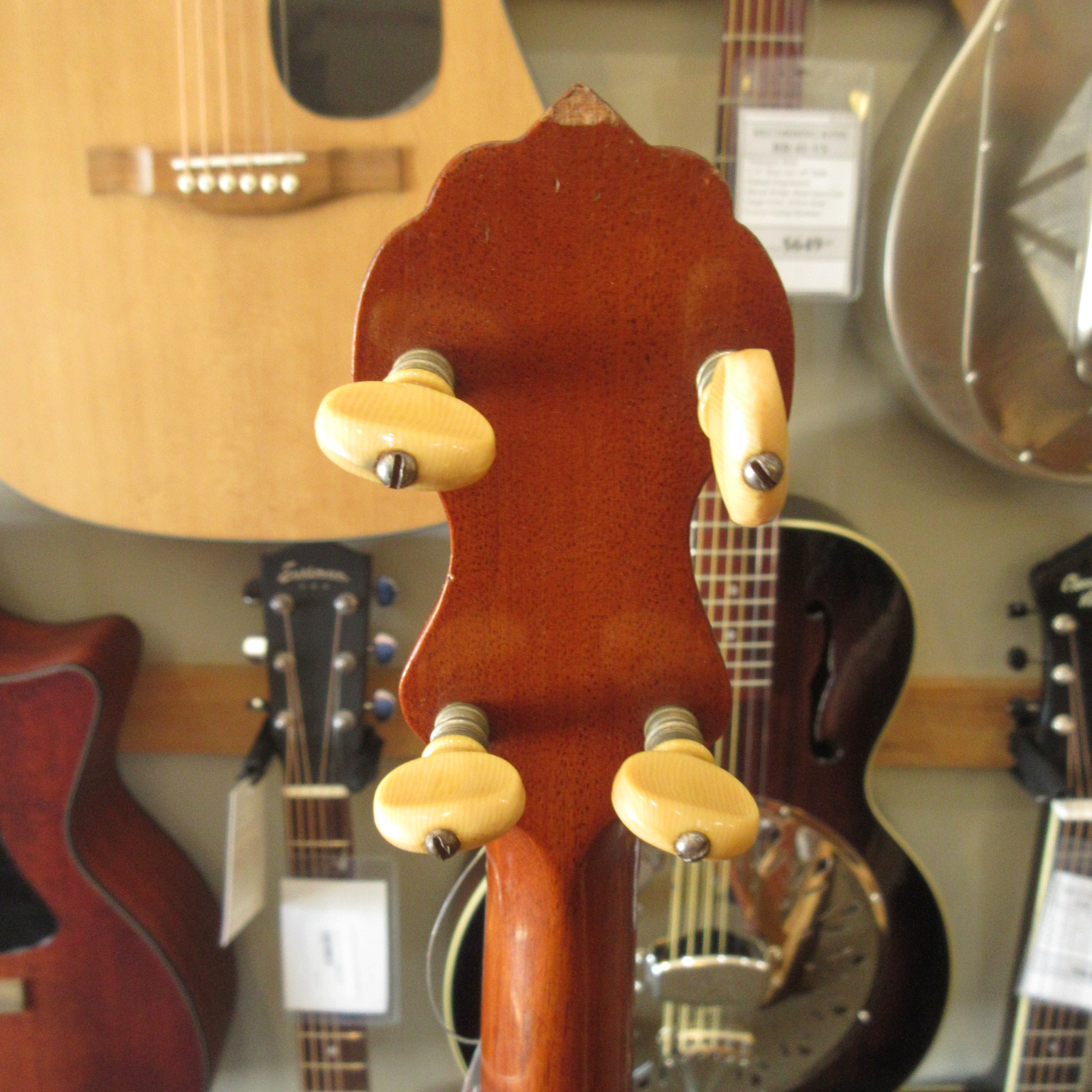 A great playing and sounding openback tenor banjo! Made by Vega in Boston, Mass. in 1925 (going by the serial number database on Deering’s site, who now owns Vega). It’s in fabulous condition for a 100 year old banjo. There are a few scratches on the headstock’s veneer some light marks here and there and a tarnish on the metal parts. The head and tailpiece are not original to the instrument. We gave this a setup and put on some fresh strings (CGDA). It has a nice tone and good projection and can get rather loud, when pushed. This is why the style-N is as popular as it is. It has a rolled brass tone ring. The original friction tuners work as they should. The banjo is in very good condition and comes with a hard case.